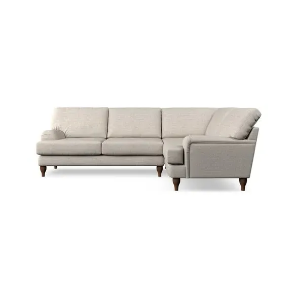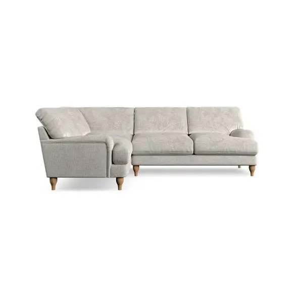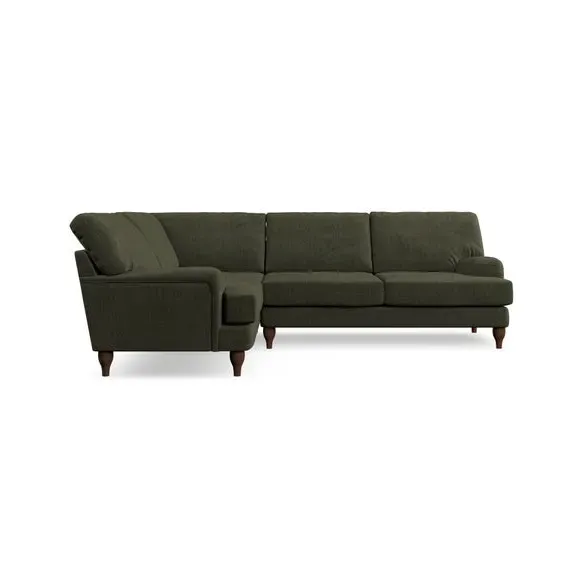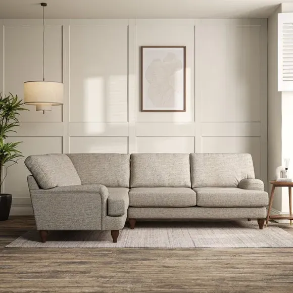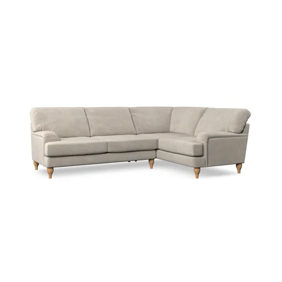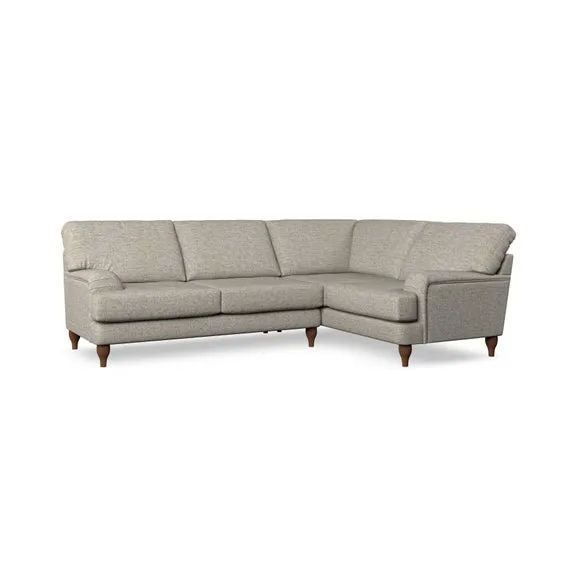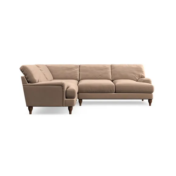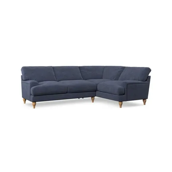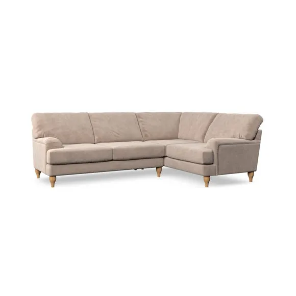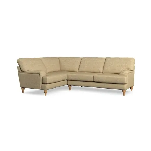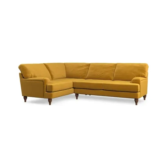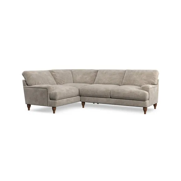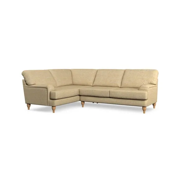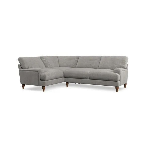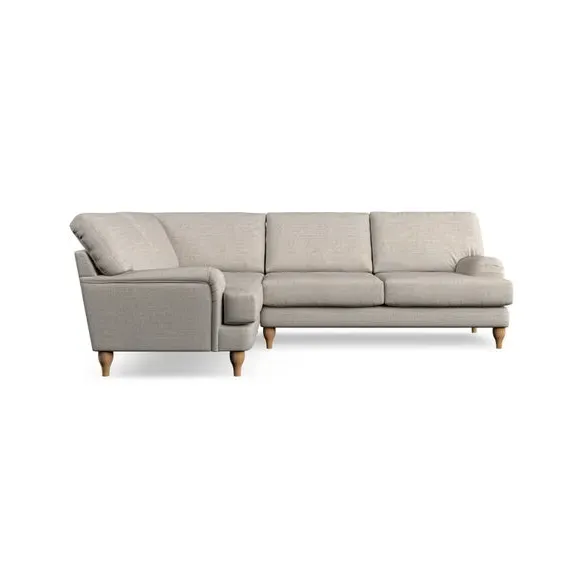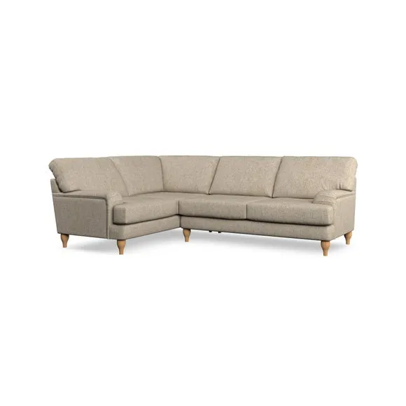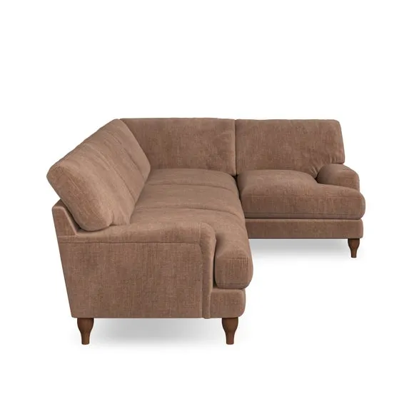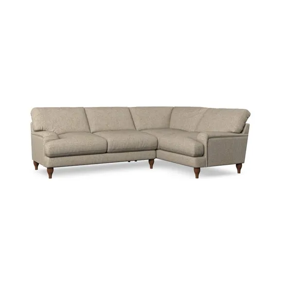 * Classic style* Bandaged Arms* Pleated details* Serpentine seat springs* Choose your orientation, support, fabric and leg colour This sofa features bandaged arms with pleat details and a lugged seat, offering a unique and stylish look. Built for longevity and comfort, it includes serpentine seat springs and deep fibre-filled back cushions for excellent support. You can customise your comfort by choosing between a low-maintenance foam seat or the inviting ‘Qualofill Blue’ fibre seat, made from 100% recycled polyester. The ‘T’ cushion seat and arm design ensure a compact and contemporary feel, complemented by self-sewn seat and back cushions. Choose from a right hand or left hand facing corner to fit your space perfectly. Additionally, you can select your preferred fabric and leg colour to perfectly match your living space.