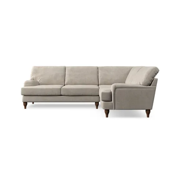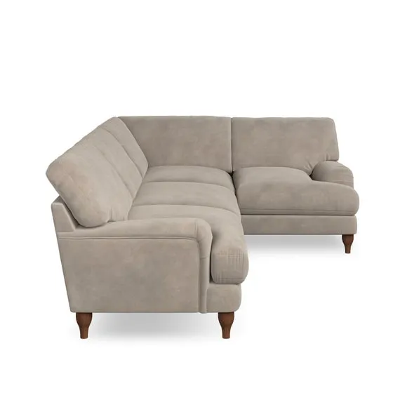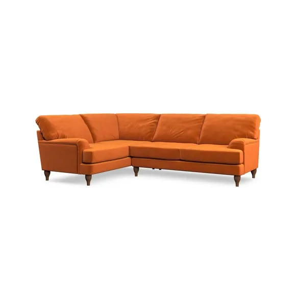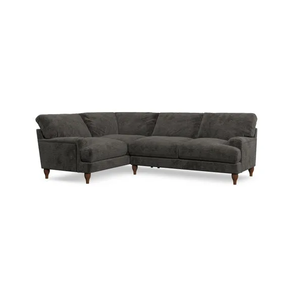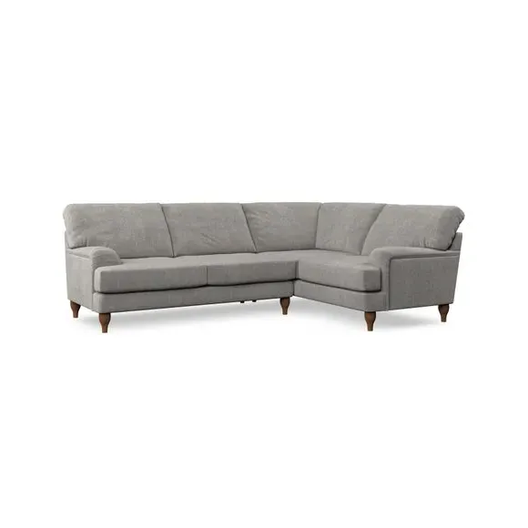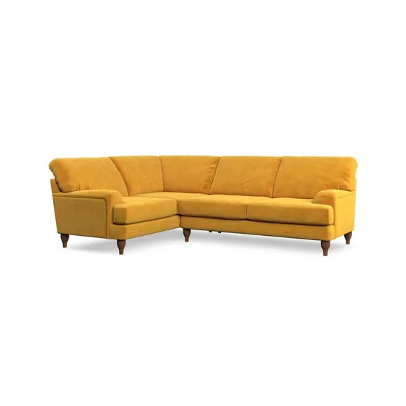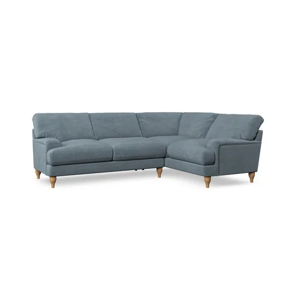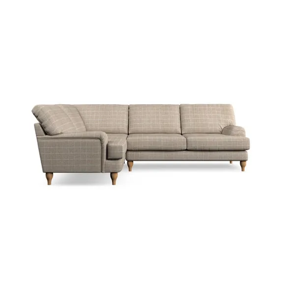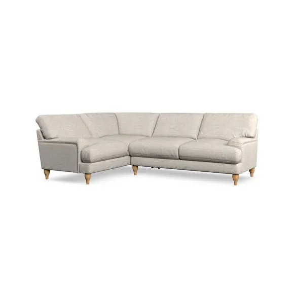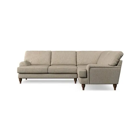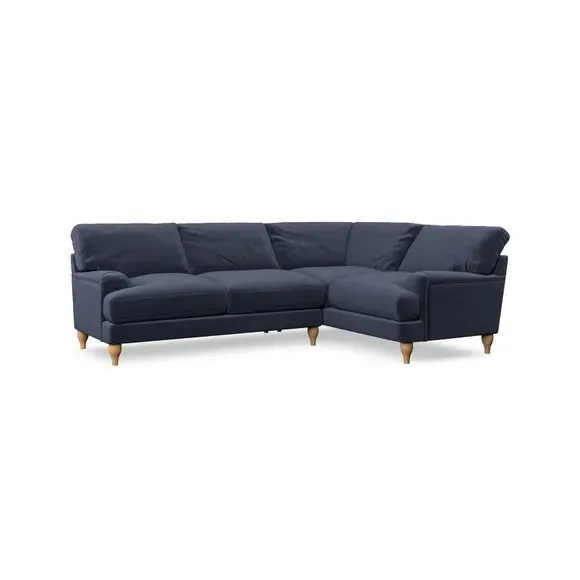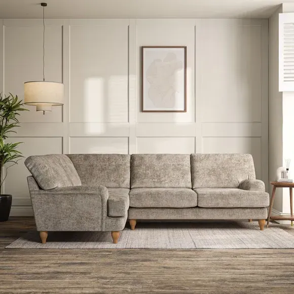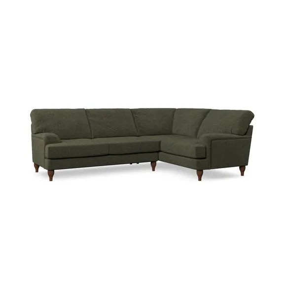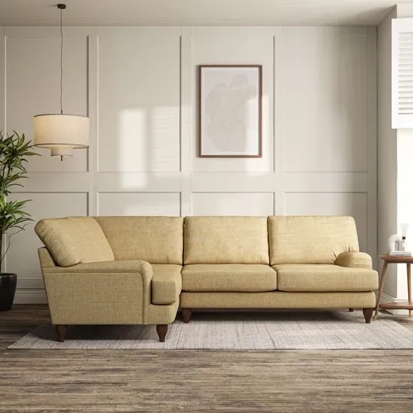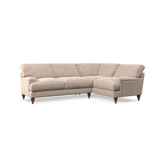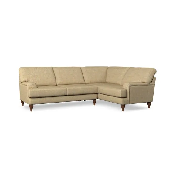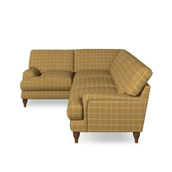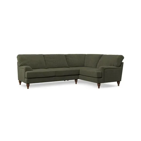 * Classic style* Bandaged Arms* Pleated details* Serpentine seat springs* Choose your orientation, support, fabric and leg colour This sofa features bandaged arms with pleat details and a lugged seat, offering a unique and stylish look. Built for longevity and comfort, it includes serpentine seat springs and deep fibre-filled back cushions for excellent support. You can customise your comfort by choosing between a low-maintenance foam seat or the inviting ‘Qualofill Blue’ fibre seat, made from 100% recycled polyester. The ‘T’ cushion seat and arm design ensure a compact and contemporary feel, complemented by self-sewn seat and back cushions. Choose from a right hand or left hand facing corner to fit your space perfectly. Additionally, you can select your preferred fabric and leg colour to perfectly match your living space.