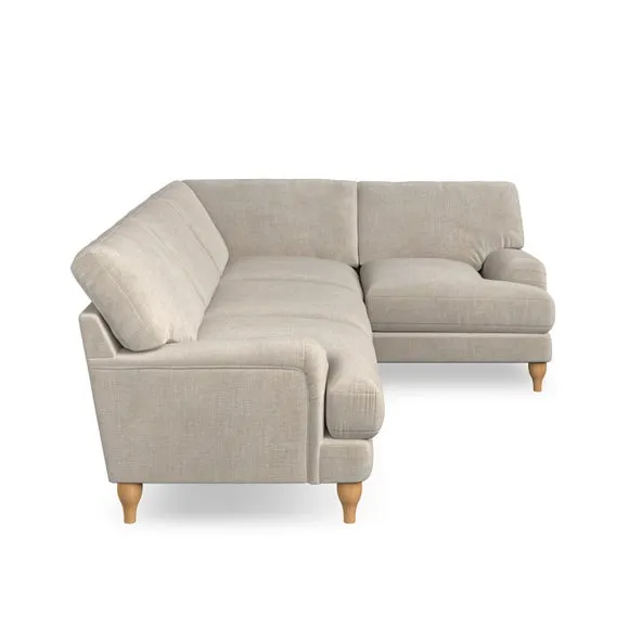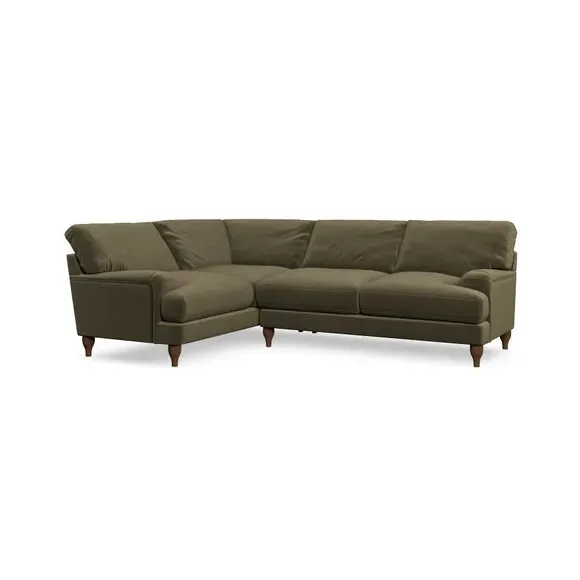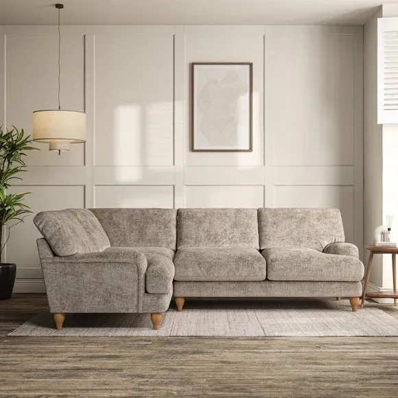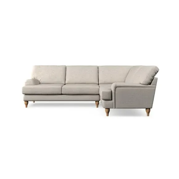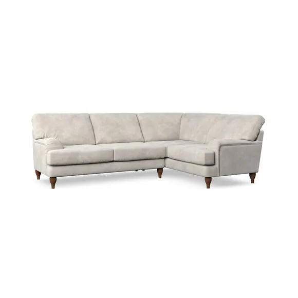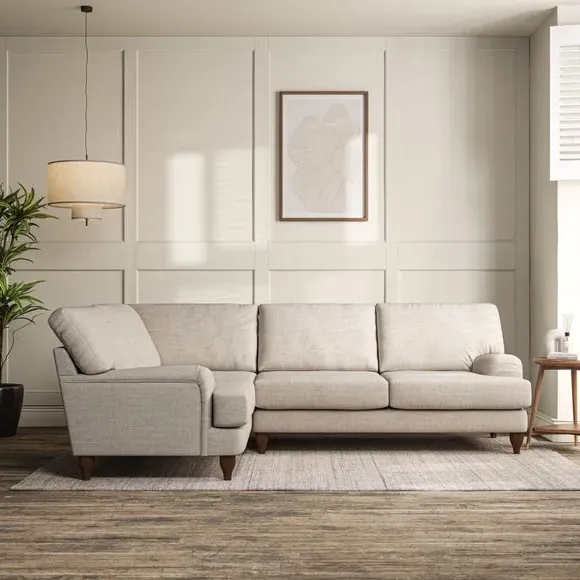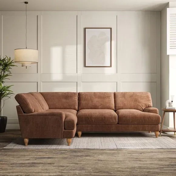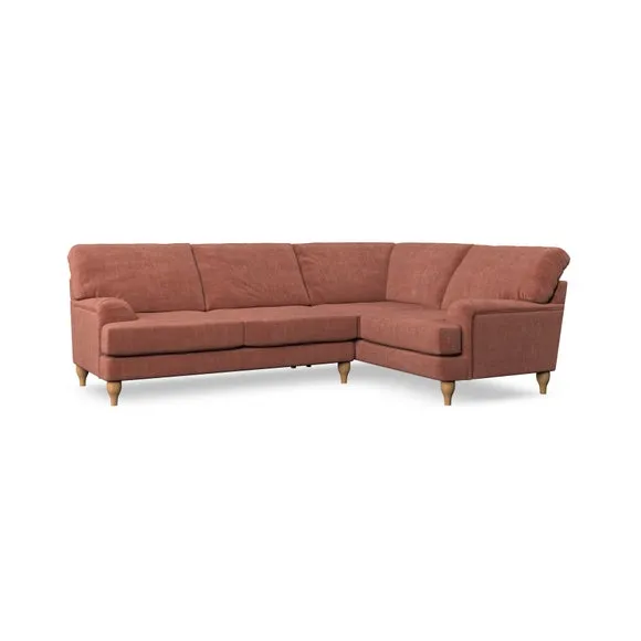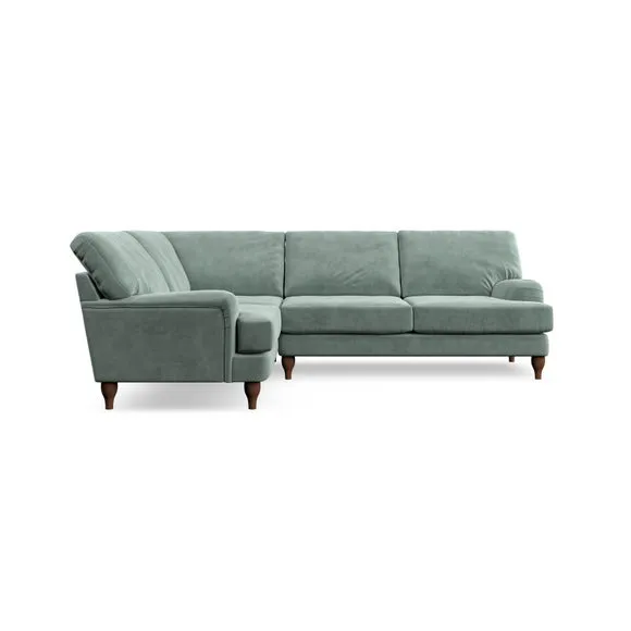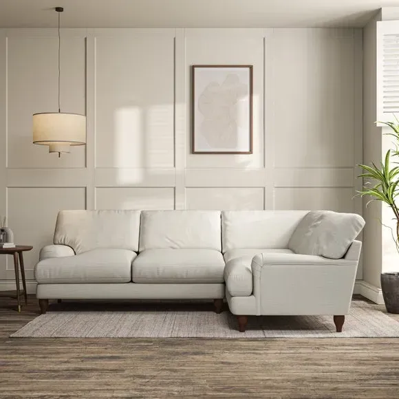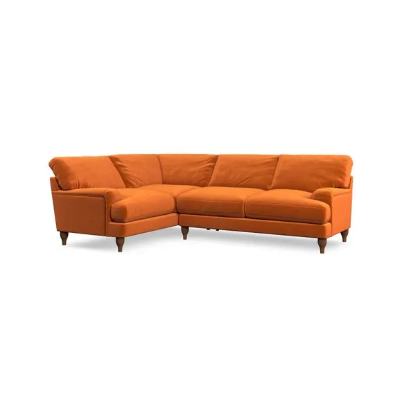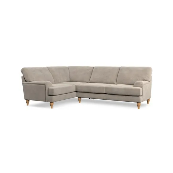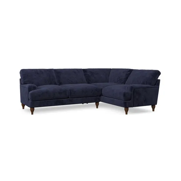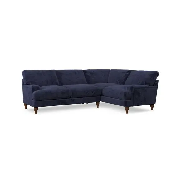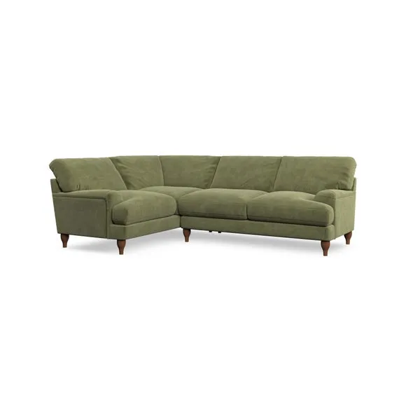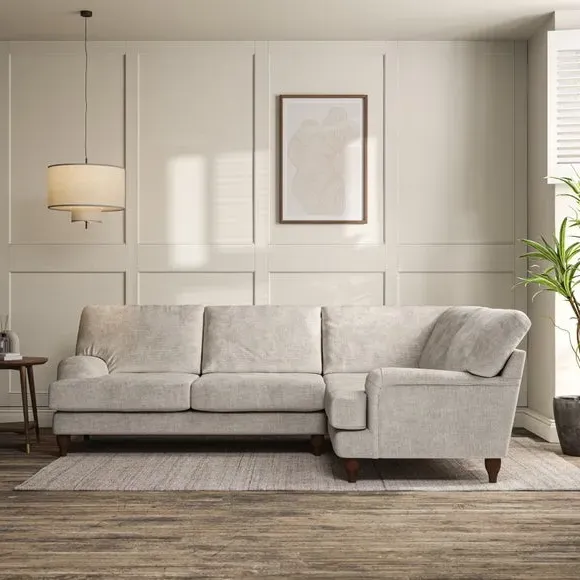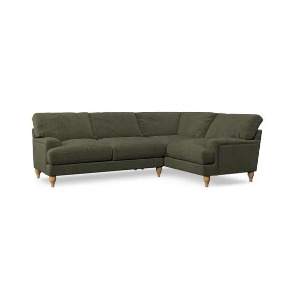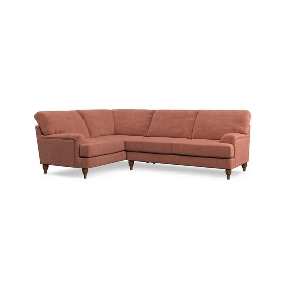 * Classic style* Bandaged Arms* Pleated details* Serpentine seat springs* Choose your orientation, support, fabric and leg colour This sofa features bandaged arms with pleat details and a lugged seat, offering a unique and stylish look. Built for longevity and comfort, it includes serpentine seat springs and deep fibre-filled back cushions for excellent support. You can customise your comfort by choosing between a low-maintenance foam seat or the inviting ‘Qualofill Blue’ fibre seat, made from 100% recycled polyester. The ‘T’ cushion seat and arm design ensure a compact and contemporary feel, complemented by self-sewn seat and back cushions. Choose from a right hand or left hand facing corner to fit your space perfectly. Additionally, you can select your preferred fabric and leg colour to perfectly match your living space.