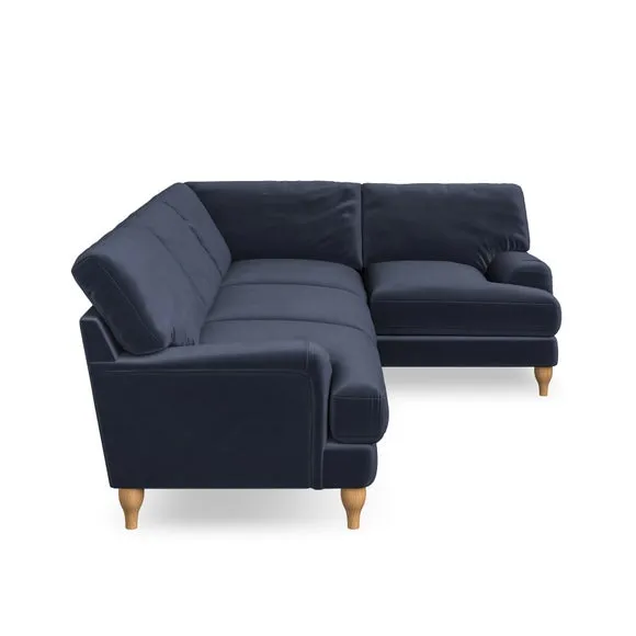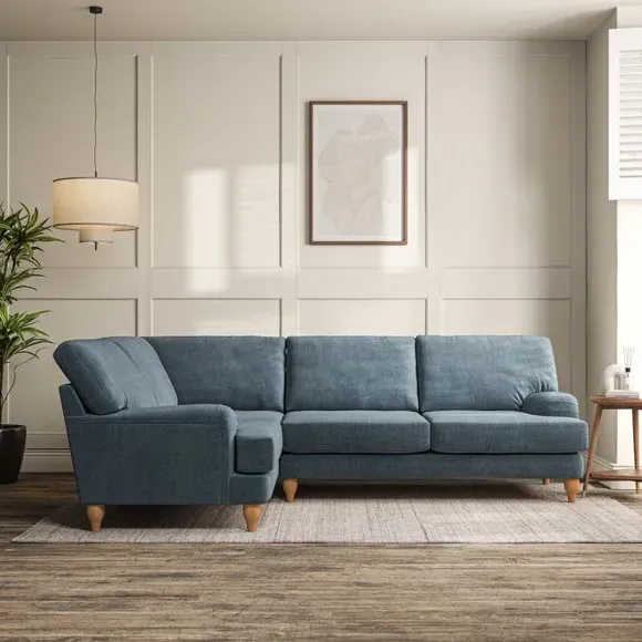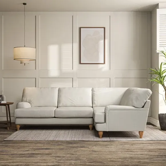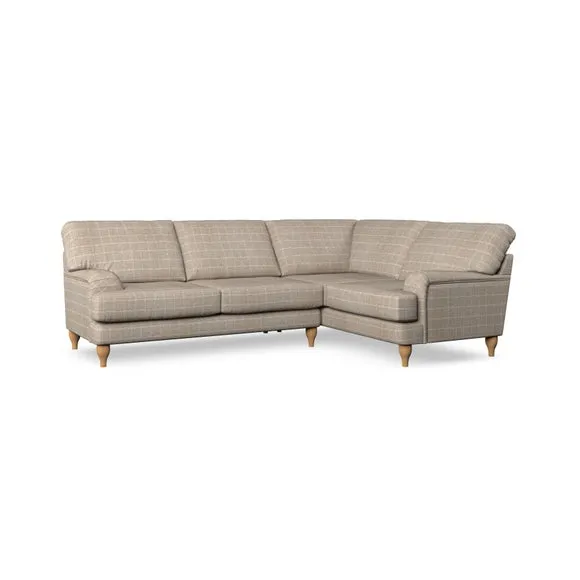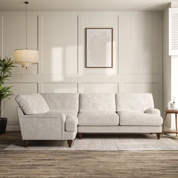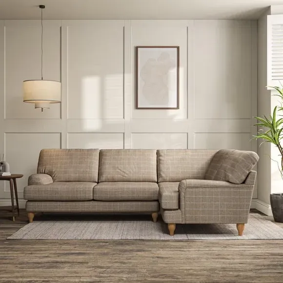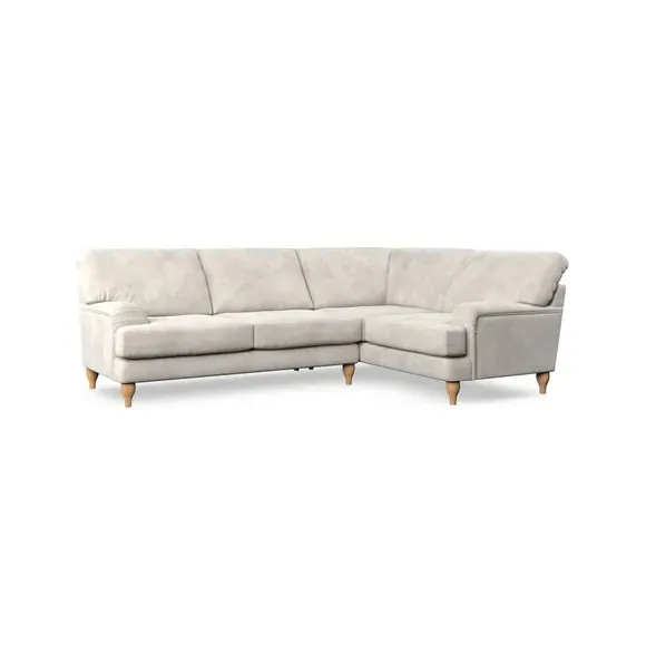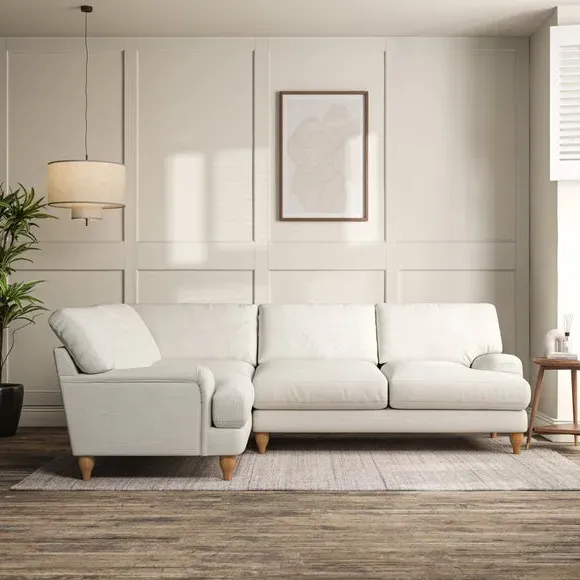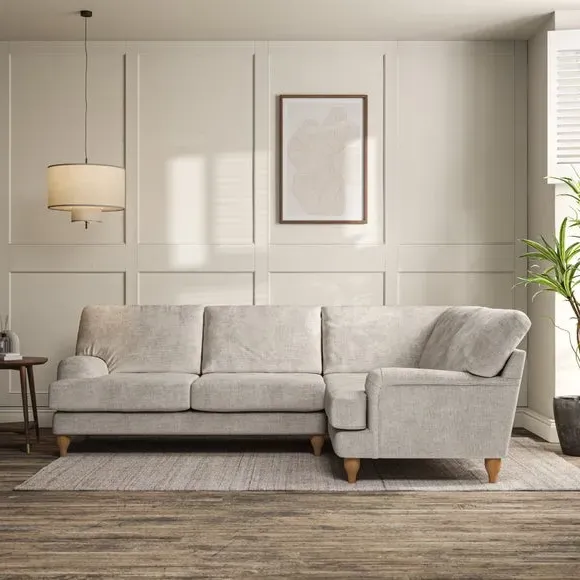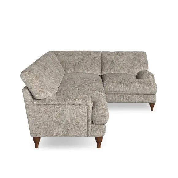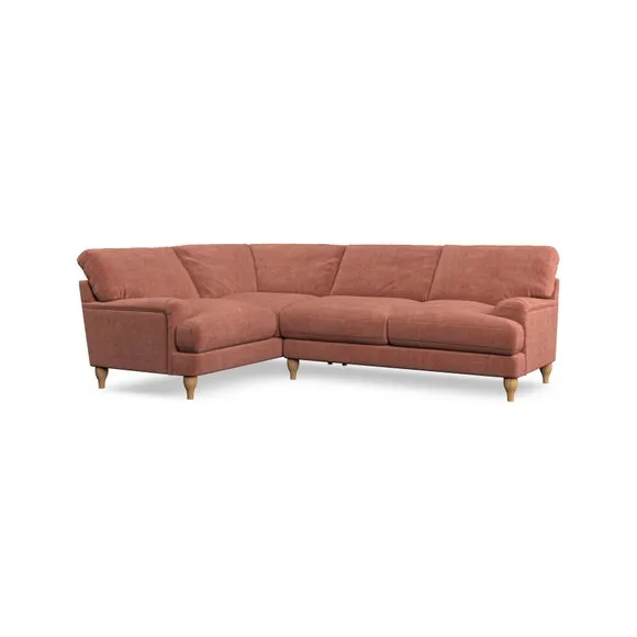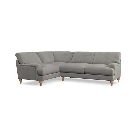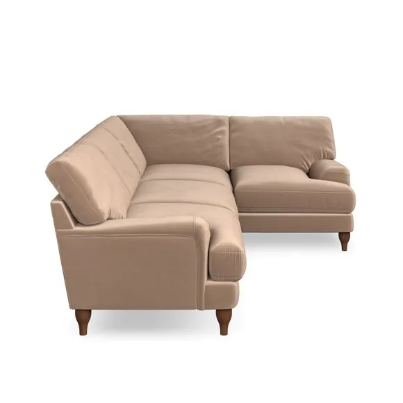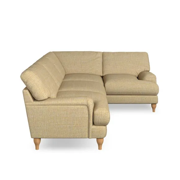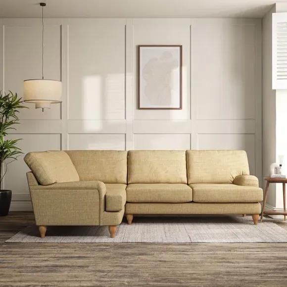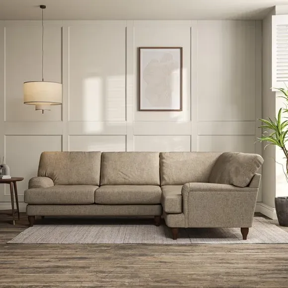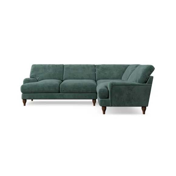 * Classic style* Bandaged Arms* Pleated details* Serpentine seat springs* Choose your orientation, support, fabric and leg colour This sofa features bandaged arms with pleat details and a lugged seat, offering a unique and stylish look. Built for longevity and comfort, it includes serpentine seat springs and deep fibre-filled back cushions for excellent support. You can customise your comfort by choosing between a low-maintenance foam seat or the inviting ‘Qualofill Blue’ fibre seat, made from 100% recycled polyester. The ‘T’ cushion seat and arm design ensure a compact and contemporary feel, complemented by self-sewn seat and back cushions. Choose from a right hand or left hand facing corner to fit your space perfectly. Additionally, you can select your preferred fabric and leg colour to perfectly match your living space.