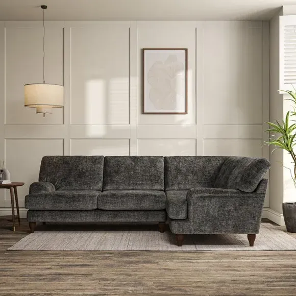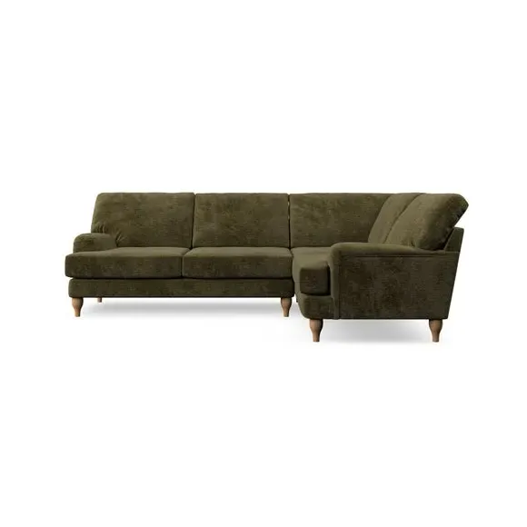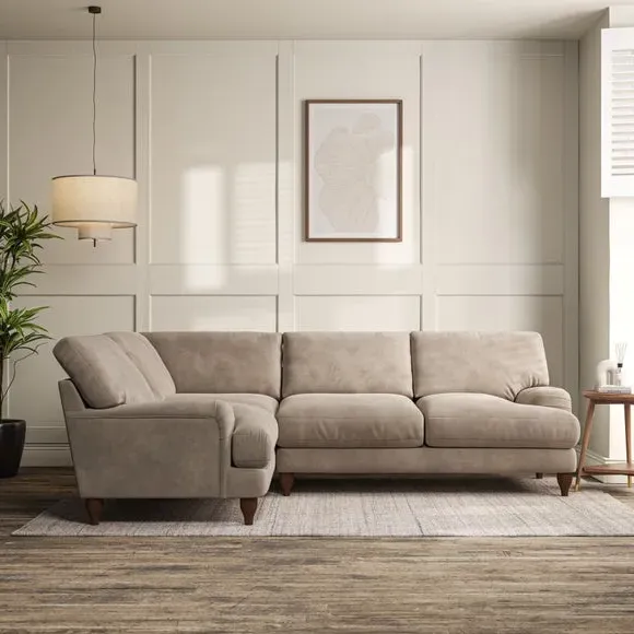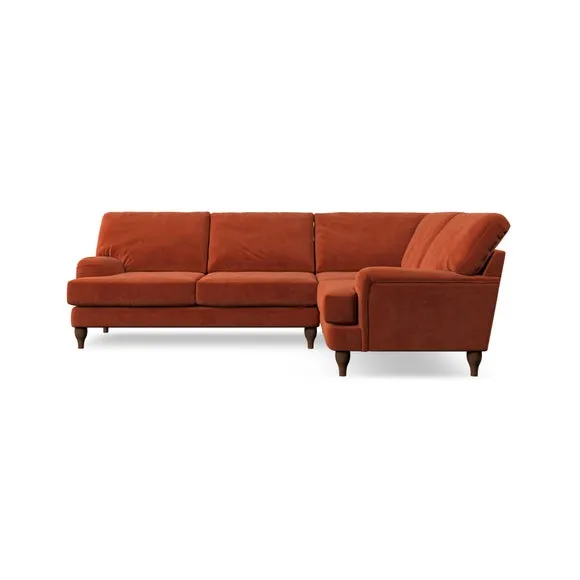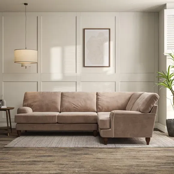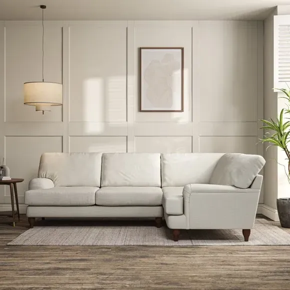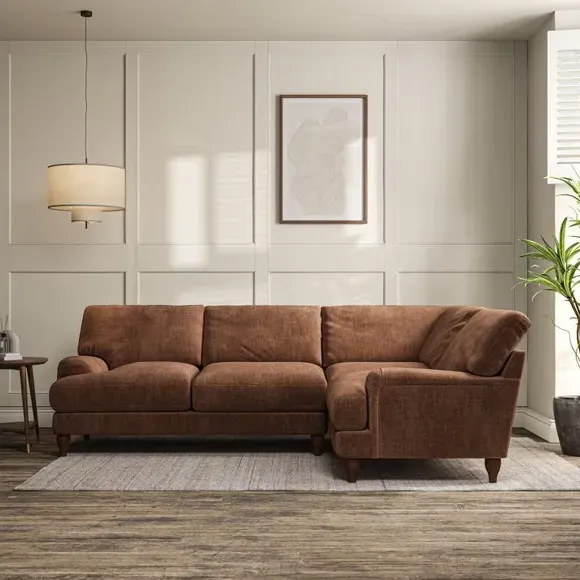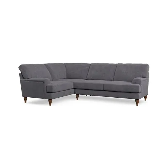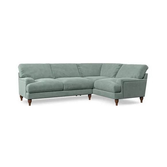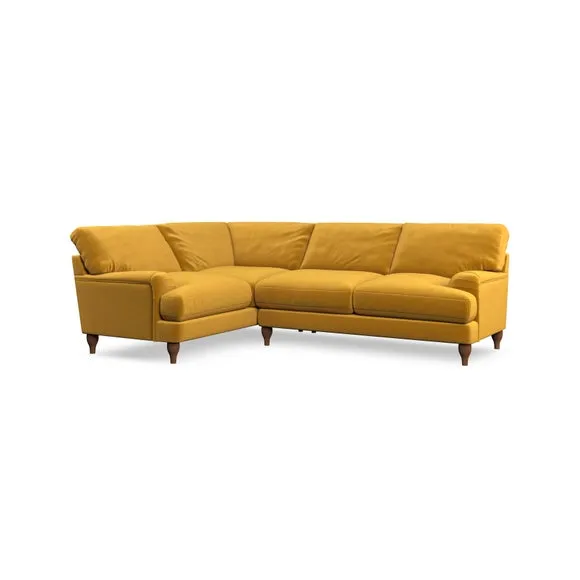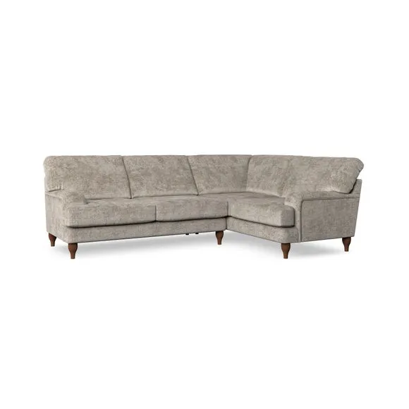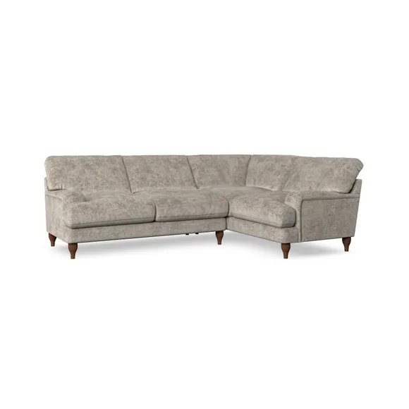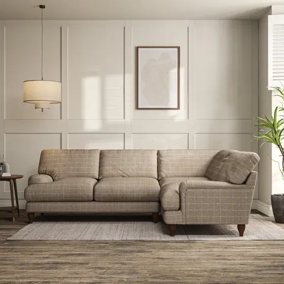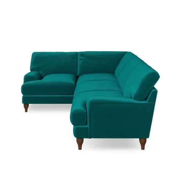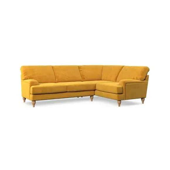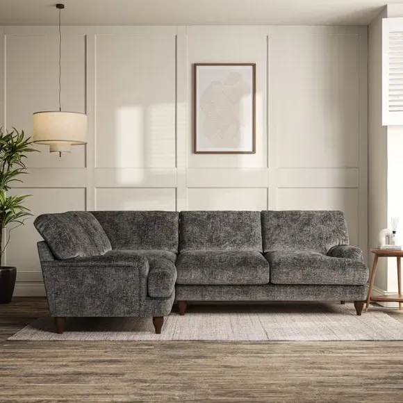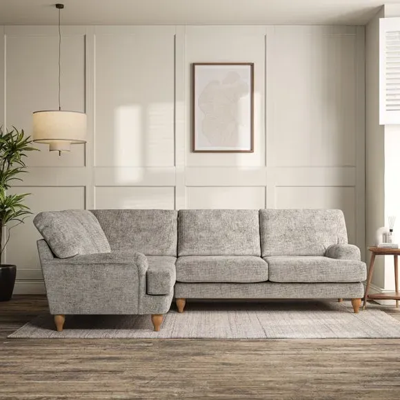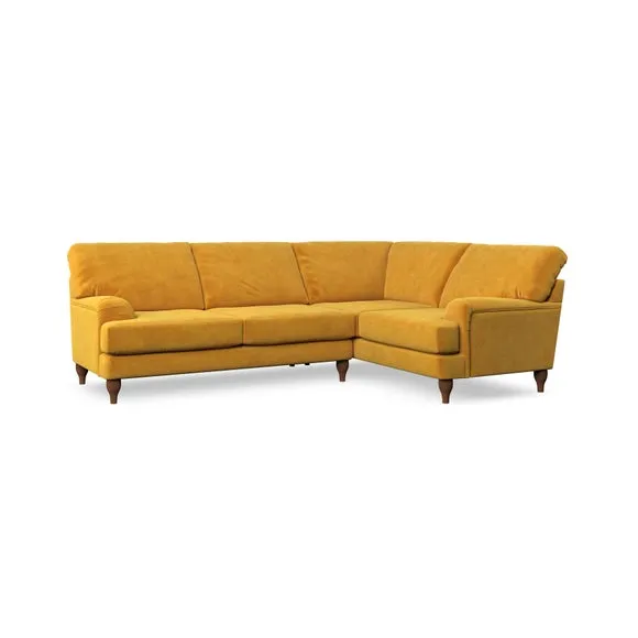 * Classic style* Bandaged Arms* Pleated details* Serpentine seat springs* Choose your orientation, support, fabric and leg colour This sofa features bandaged arms with pleat details and a lugged seat, offering a unique and stylish look. Built for longevity and comfort, it includes serpentine seat springs and deep fibre-filled back cushions for excellent support. You can customise your comfort by choosing between a low-maintenance foam seat or the inviting ‘Qualofill Blue’ fibre seat, made from 100% recycled polyester. The ‘T’ cushion seat and arm design ensure a compact and contemporary feel, complemented by self-sewn seat and back cushions. Choose from a right hand or left hand facing corner to fit your space perfectly. Additionally, you can select your preferred fabric and leg colour to perfectly match your living space.