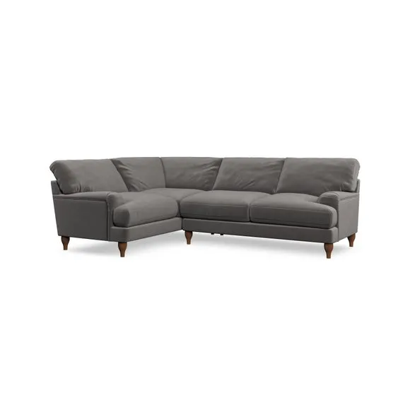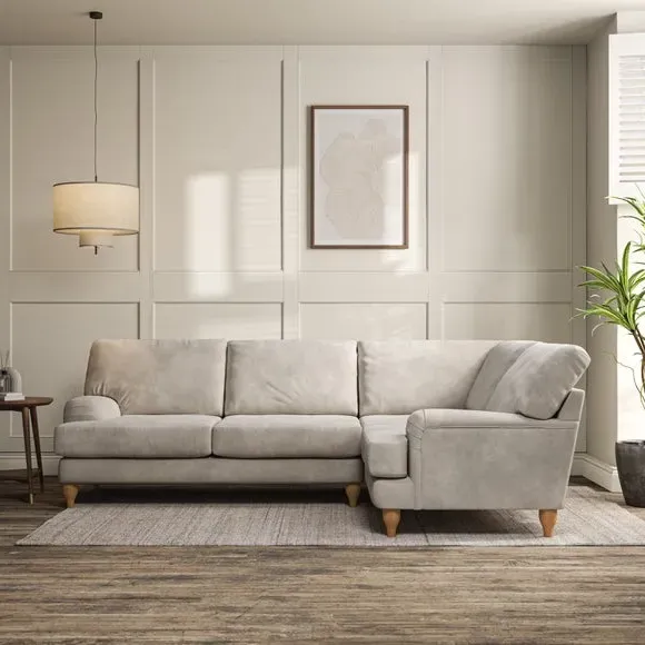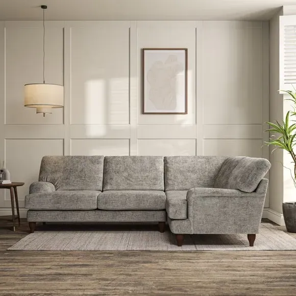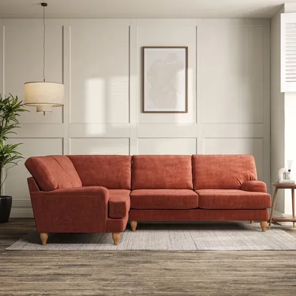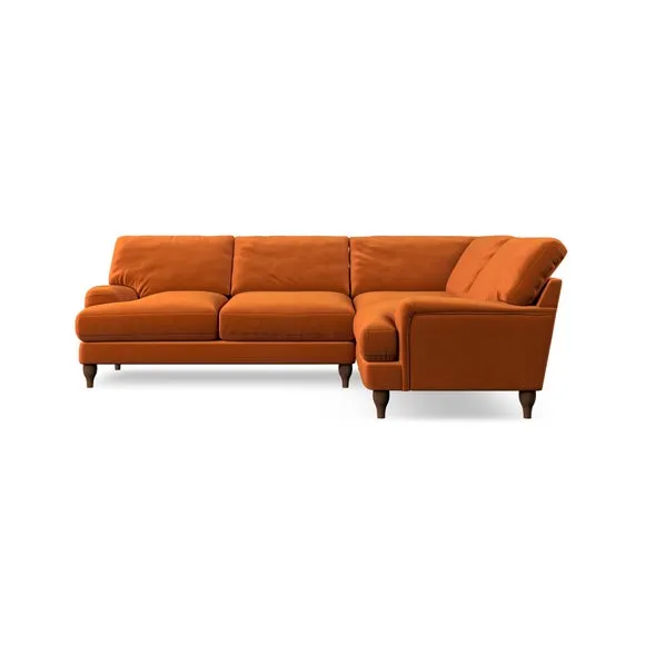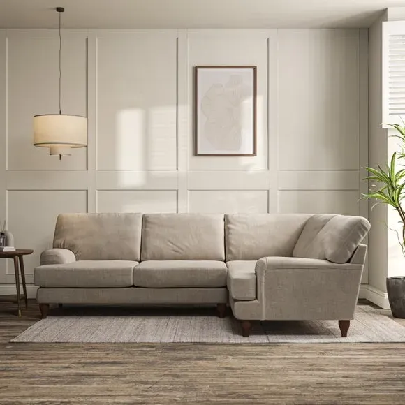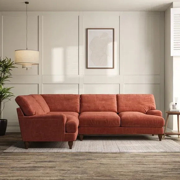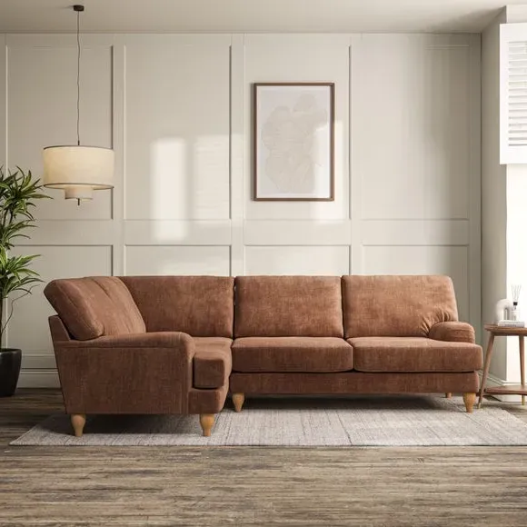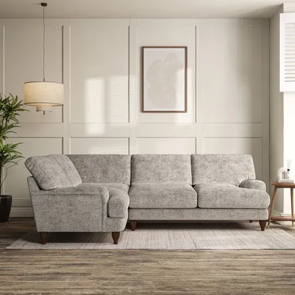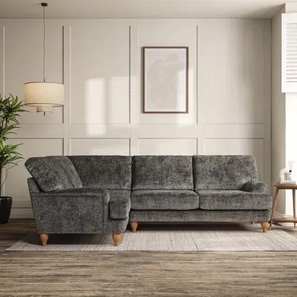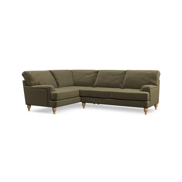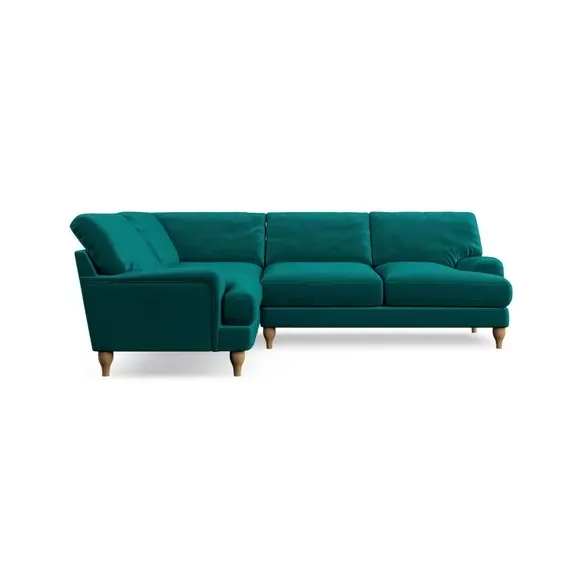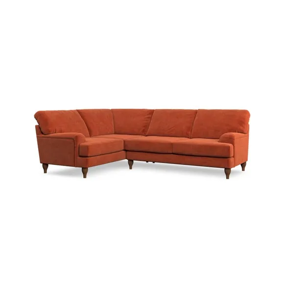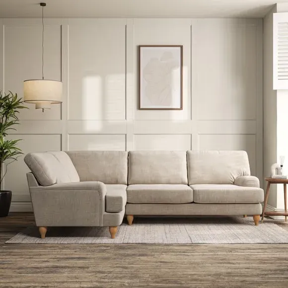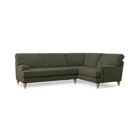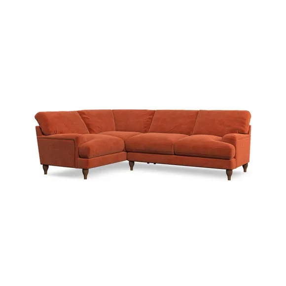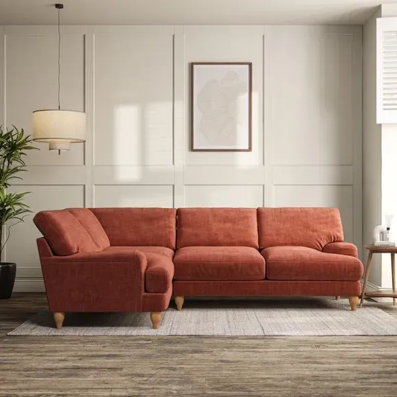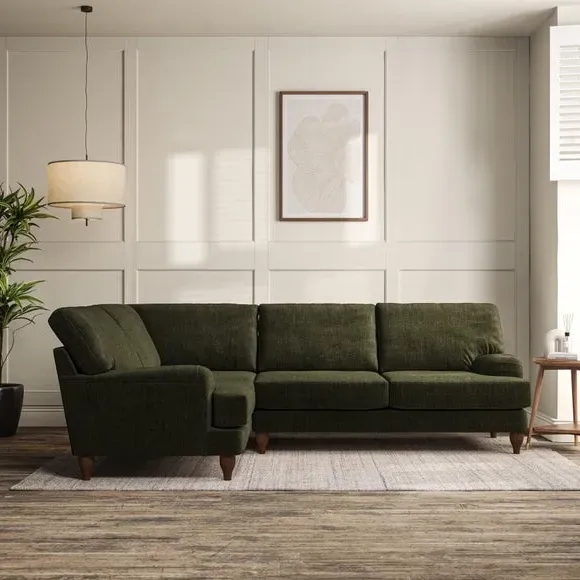 * Classic style* Bandaged Arms* Pleated details* Serpentine seat springs* Choose your orientation, support, fabric and leg colour This sofa features bandaged arms with pleat details and a lugged seat, offering a unique and stylish look. Built for longevity and comfort, it includes serpentine seat springs and deep fibre-filled back cushions for excellent support. You can customise your comfort by choosing between a low-maintenance foam seat or the inviting ‘Qualofill Blue’ fibre seat, made from 100% recycled polyester. The ‘T’ cushion seat and arm design ensure a compact and contemporary feel, complemented by self-sewn seat and back cushions. Choose from a right hand or left hand facing corner to fit your space perfectly. Additionally, you can select your preferred fabric and leg colour to perfectly match your living space.