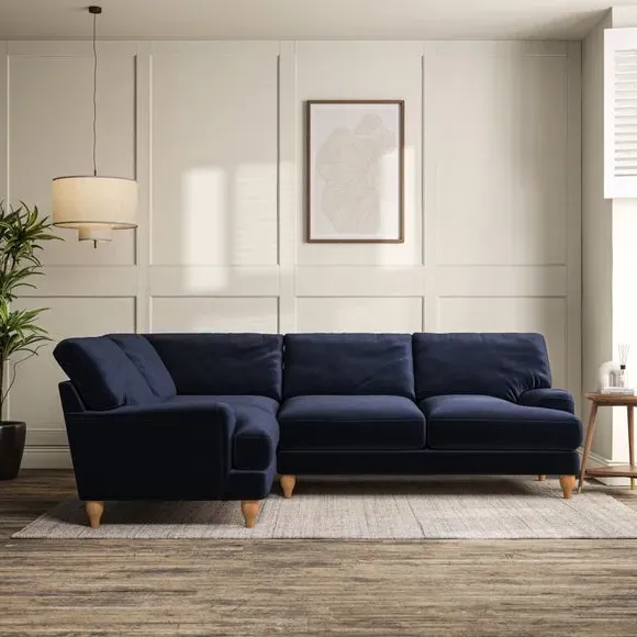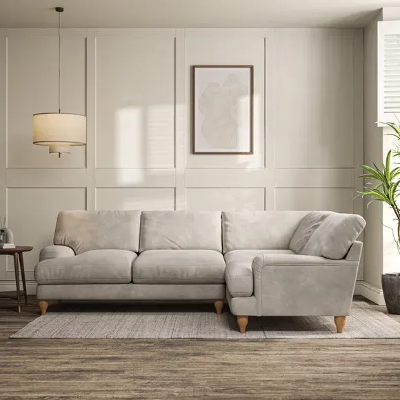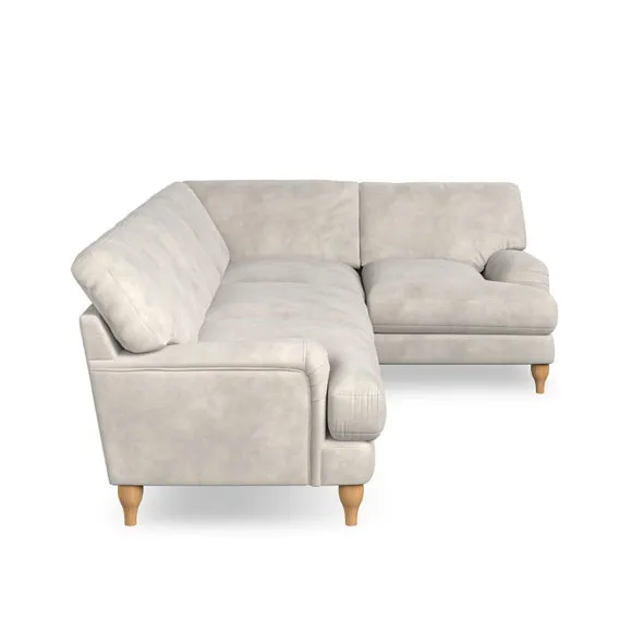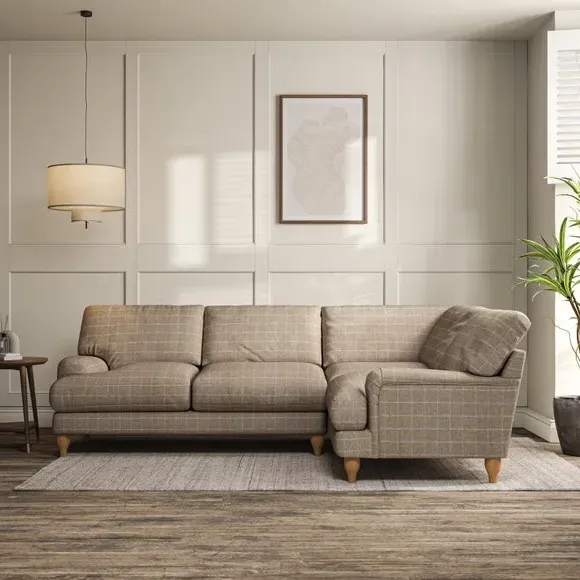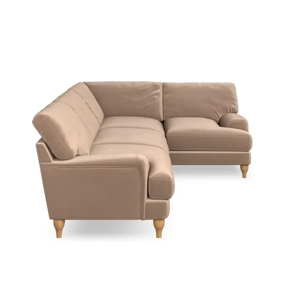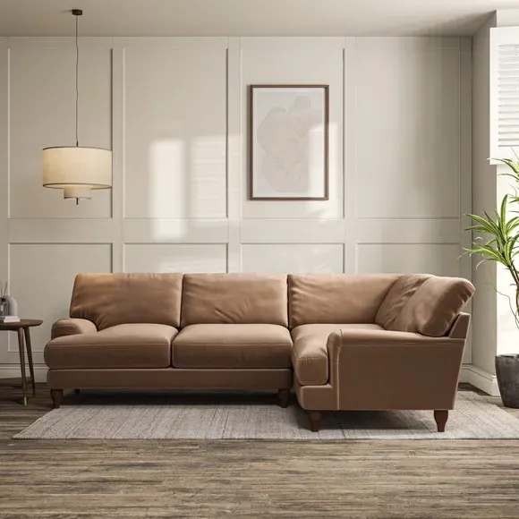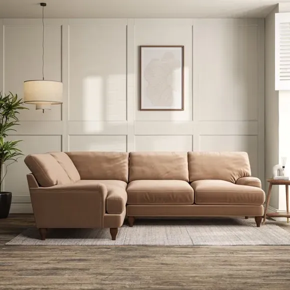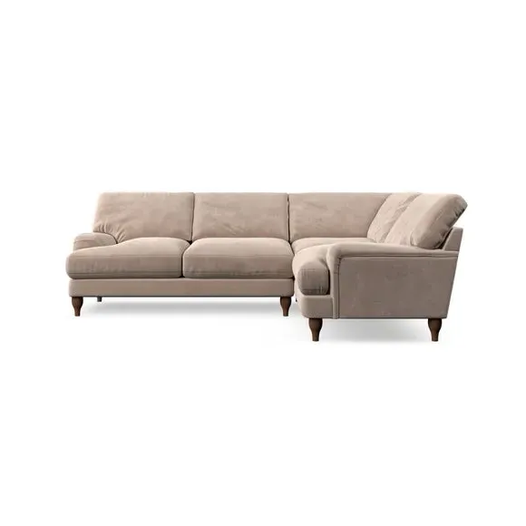 The corner sofa combines classic style with its bandaged arms and pleated details, creating a distinctive contemporary look. Its serpentine seat springs provide excellent support, while the deep fibre-filled back cushions add comfort and durability. The T-cushion design offers a compact feel with self-sewn cushions, and the customisable orientation allows for right or left-hand facing configurations.