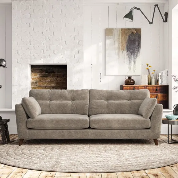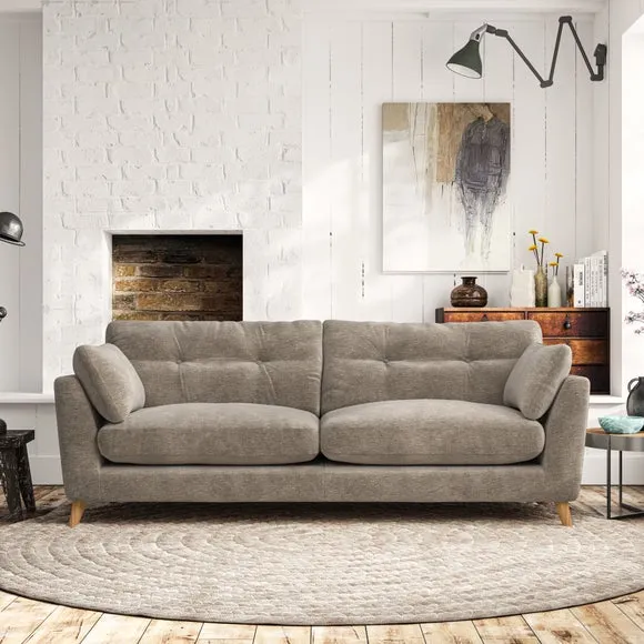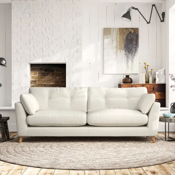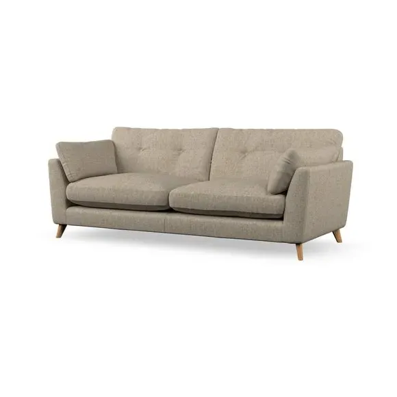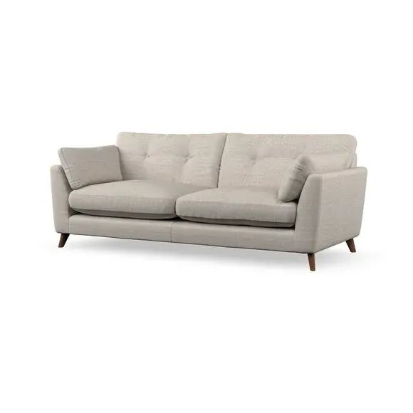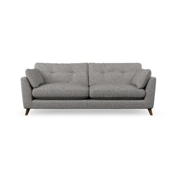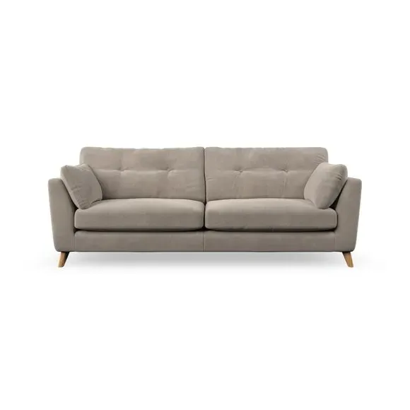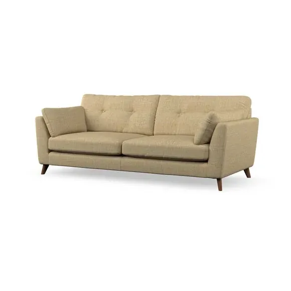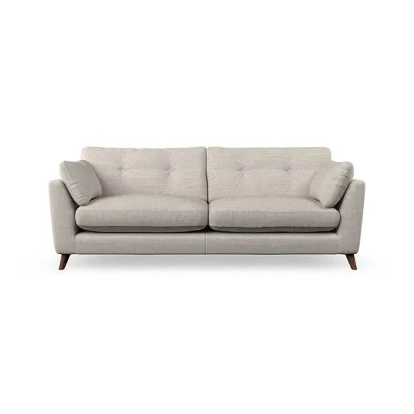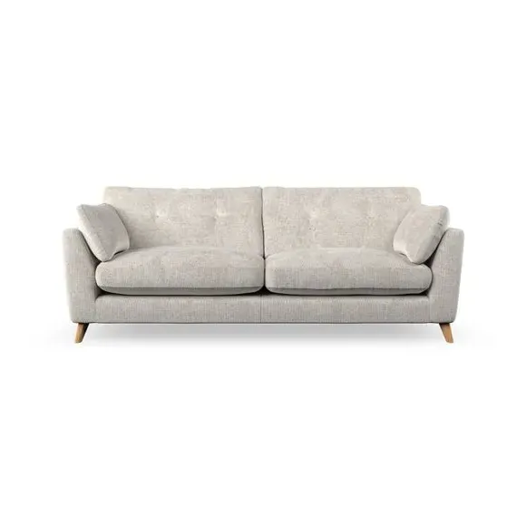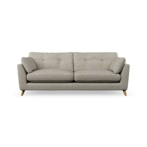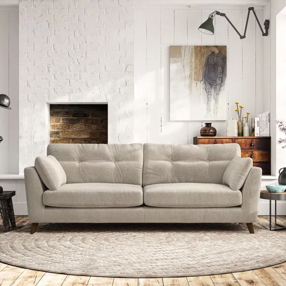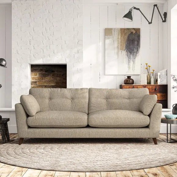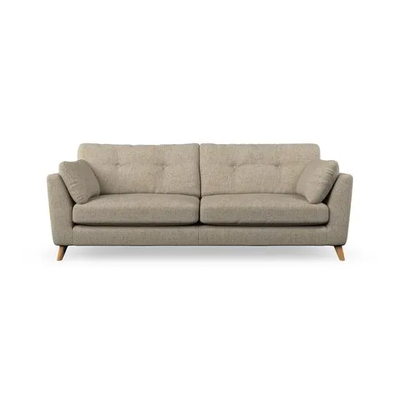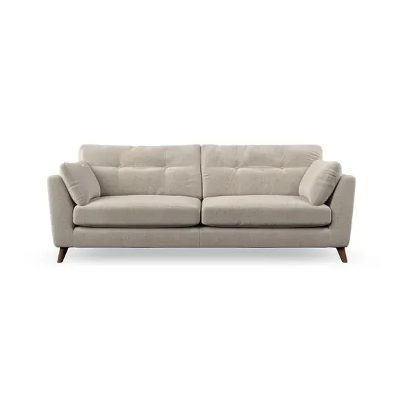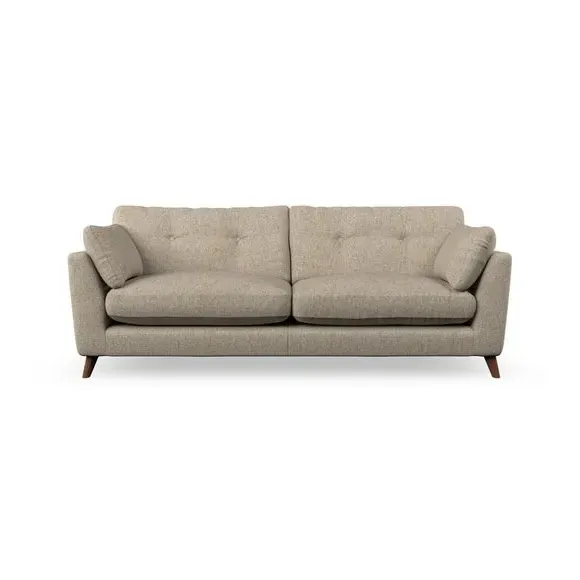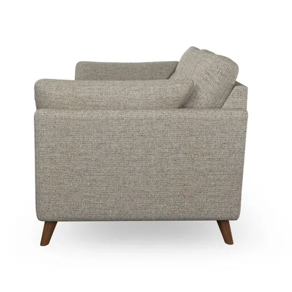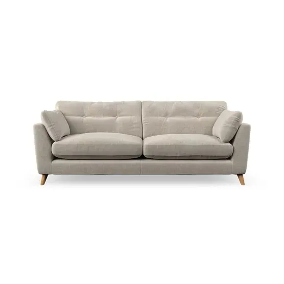 * Mid-century style* Pillow top arms* Button pull details* Choose fabric type, leg colour and cushion filling With its high legs and plush fibre-filled arm pads, this sofa combines sleek design with an inviting feel. Button-pull details on the supportive, fibre-filled back cushions add a touch of refinement, while the higher back cushions provide excellent support for your back and shoulders. Customise your Peyton sofa by choosing between a low-maintenance foam seat or a more relaxed 'Qualofill Blue' fibre seat for a softer sit. Built with serpentine seat springs for durability and long-lasting comfort, this sofa also features splayed hardwood legs available in two finishes for a personal touch.