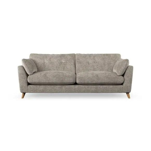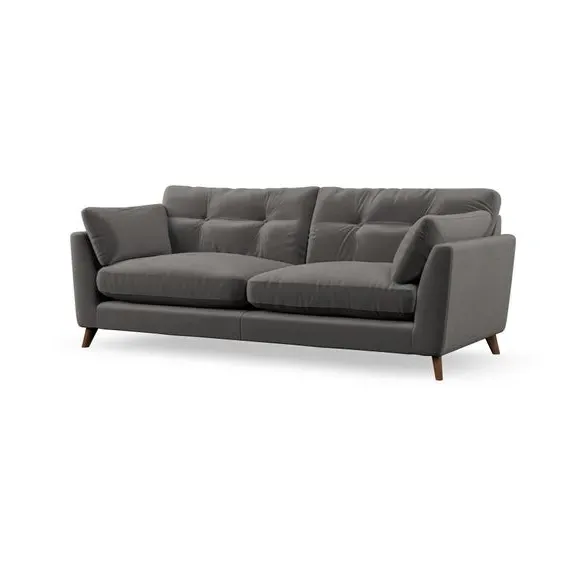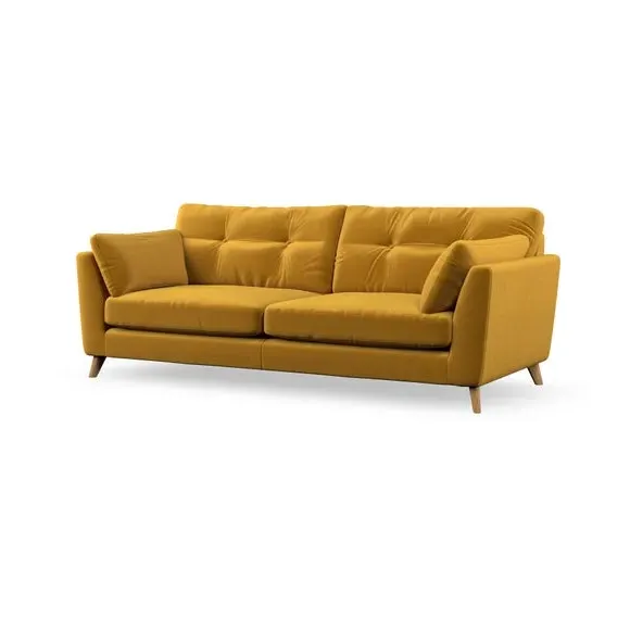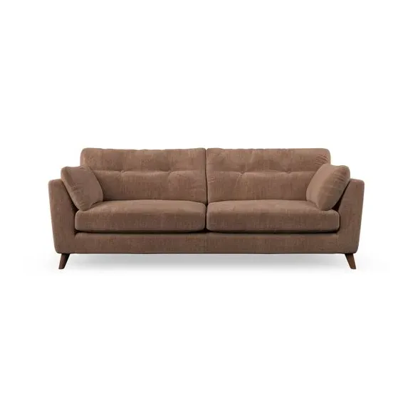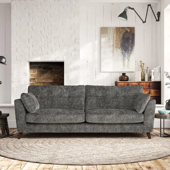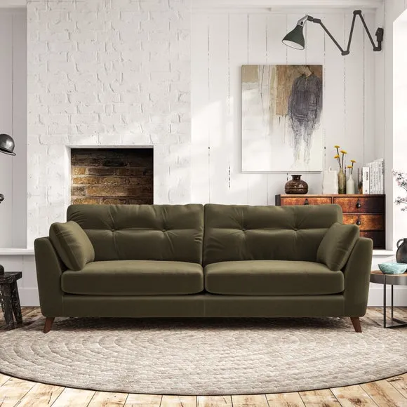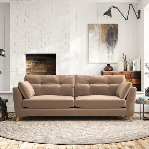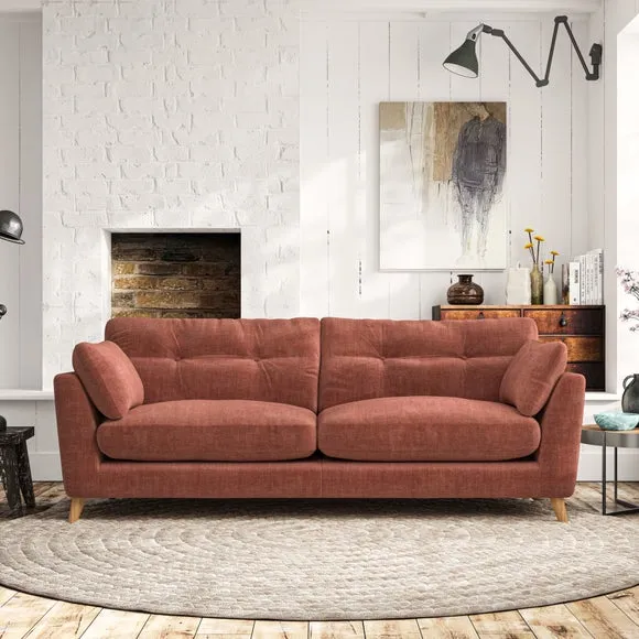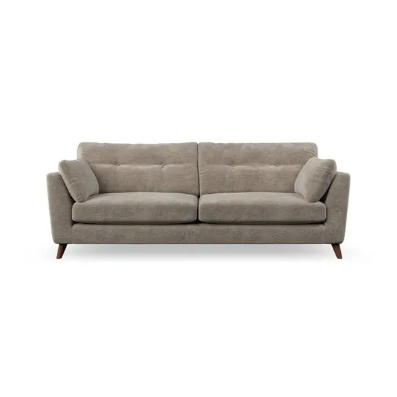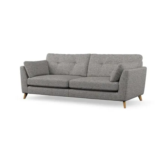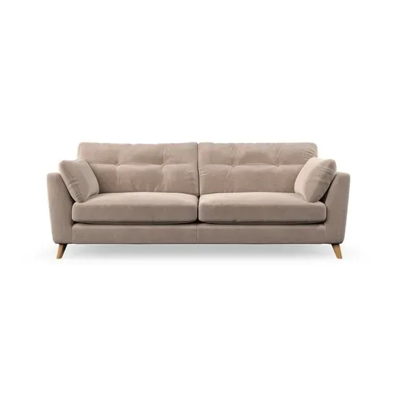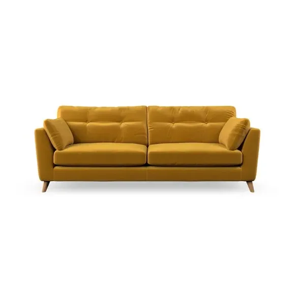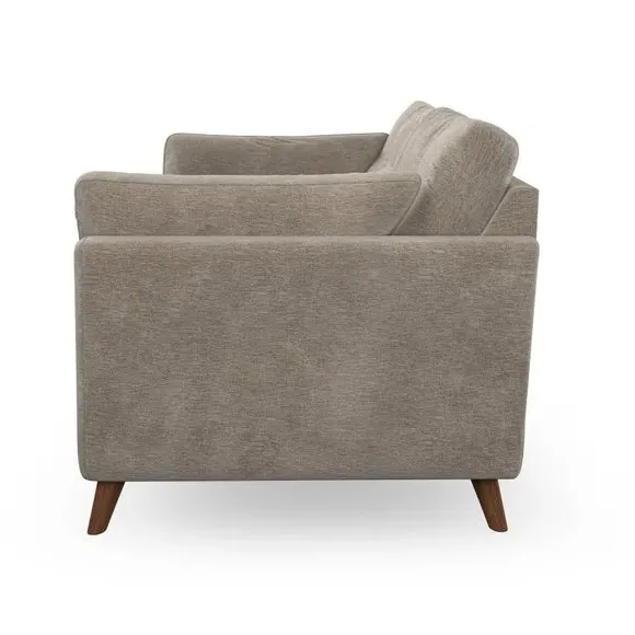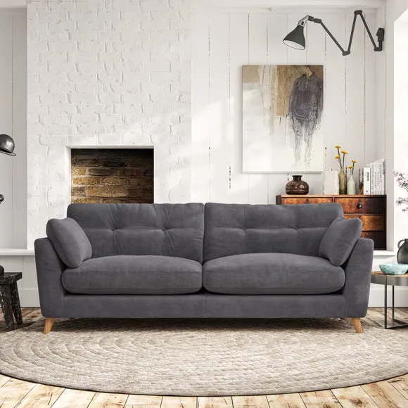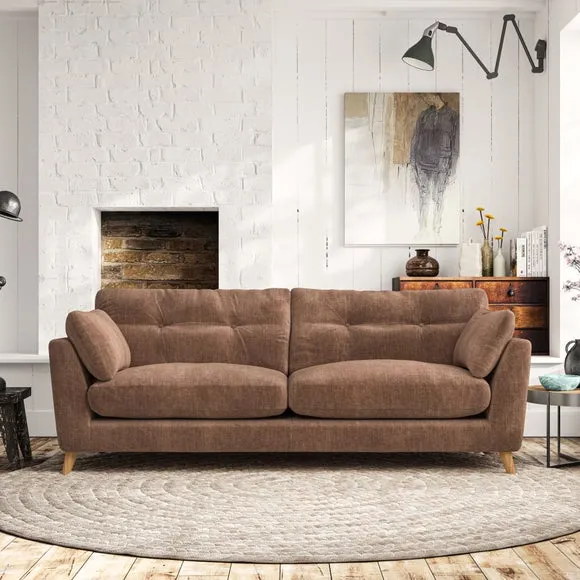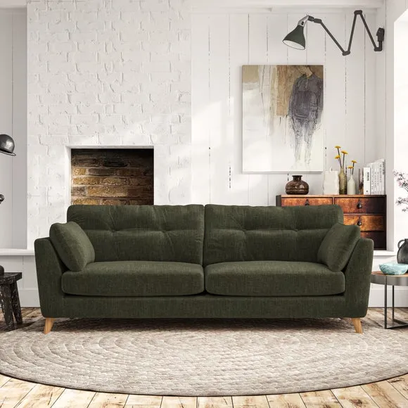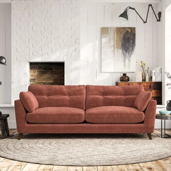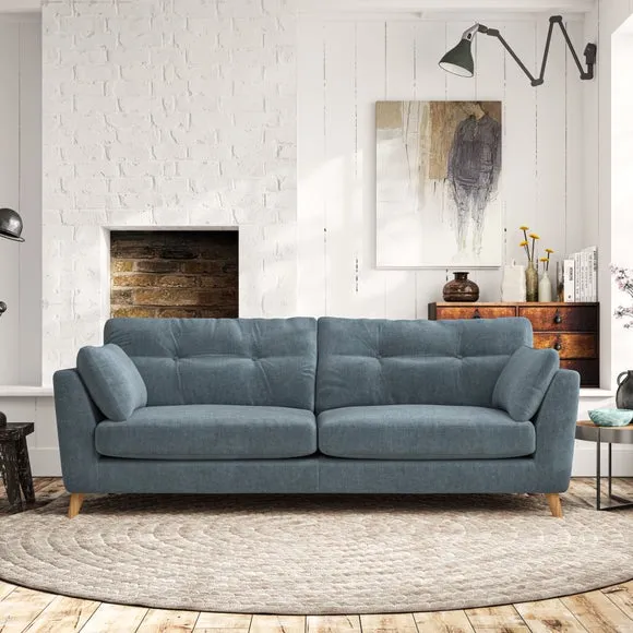 * Mid-century style* Pillow top arms* Button pull details* Choose fabric type, leg colour and cushion filling With its high legs and plush fibre-filled arm pads, this sofa combines sleek design with an inviting feel. Button-pull details on the supportive, fibre-filled back cushions add a touch of refinement, while the higher back cushions provide excellent support for your back and shoulders. Customise your Peyton sofa by choosing between a low-maintenance foam seat or a more relaxed 'Qualofill Blue' fibre seat for a softer sit. Built with serpentine seat springs for durability and long-lasting comfort, this sofa also features splayed hardwood legs available in two finishes for a personal touch.