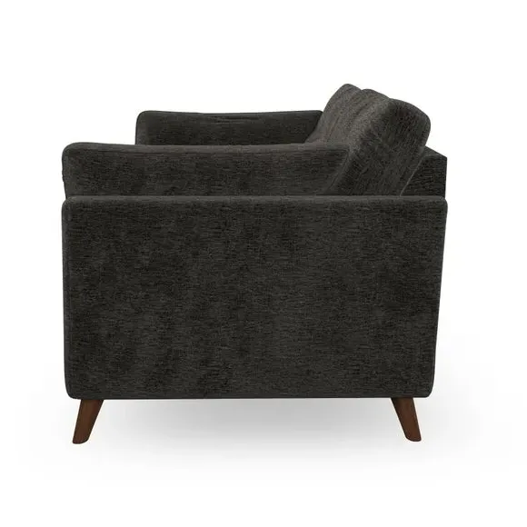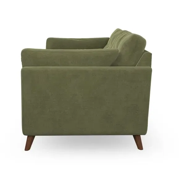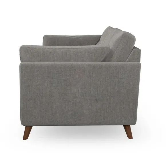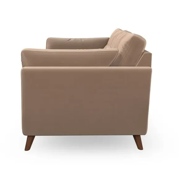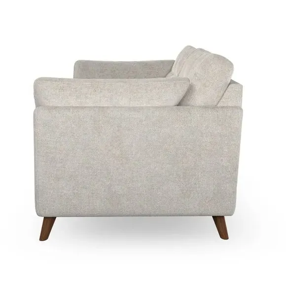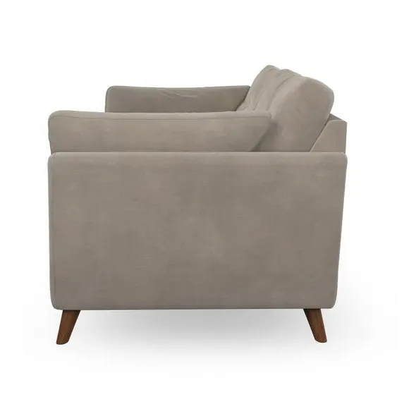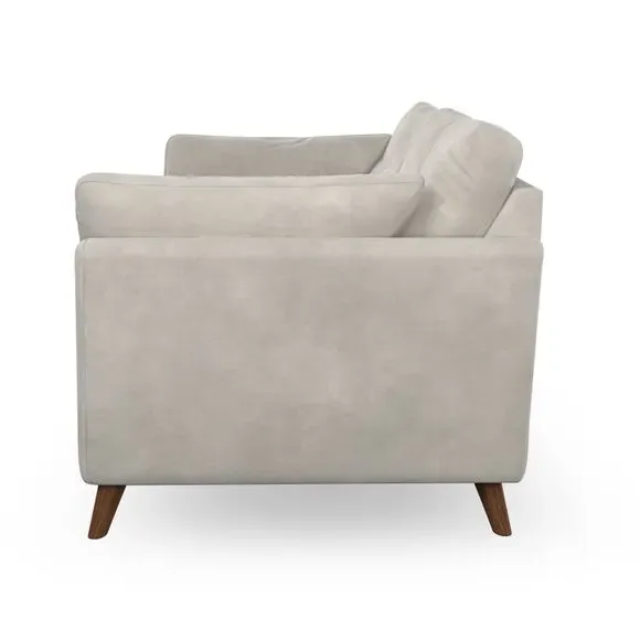 The sofa combines mid-century design with plush comfort through its fibre-filled arm pads and pillow-top arms. Button-pull details on the supportive back cushions add refinement, while the higher back provides excellent support for shoulders. Built with serpentine seat springs for durability, it features splayed hardwood legs and customizable cushion filling options.