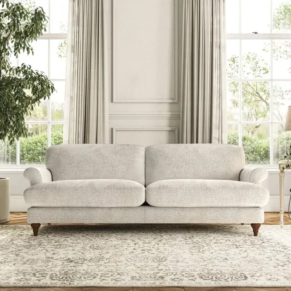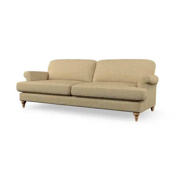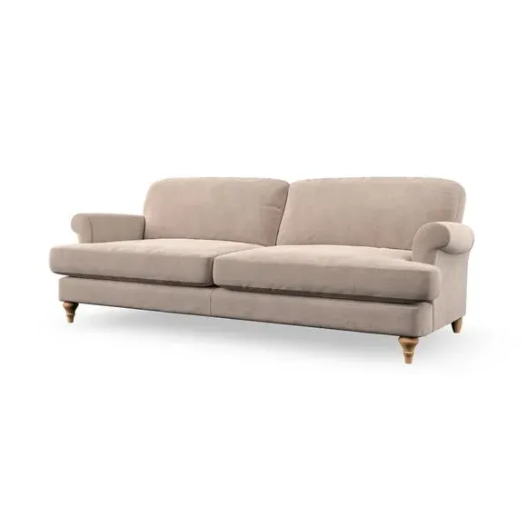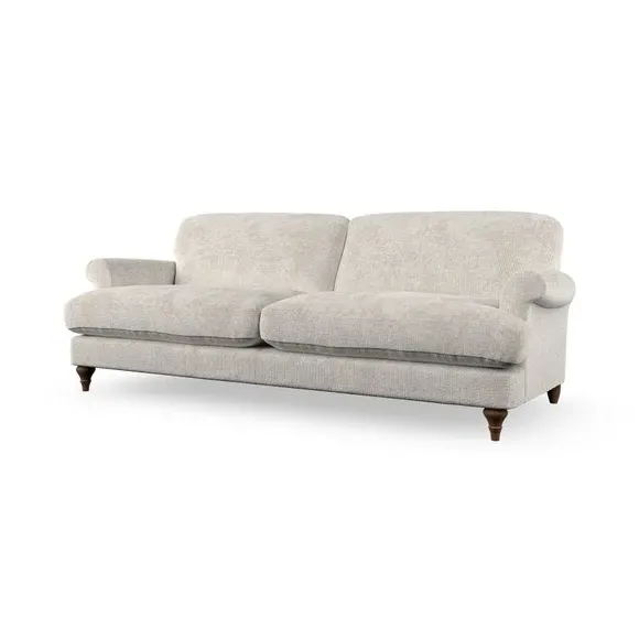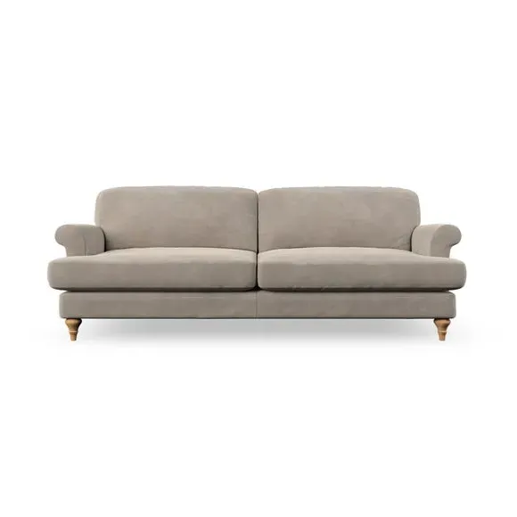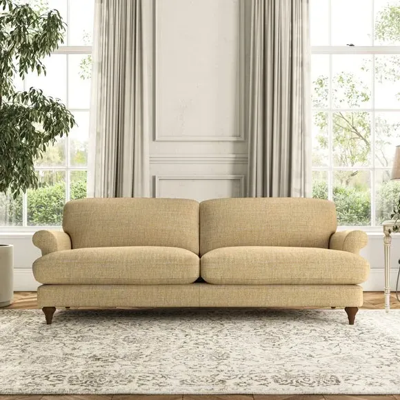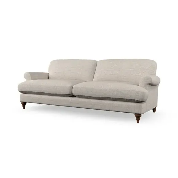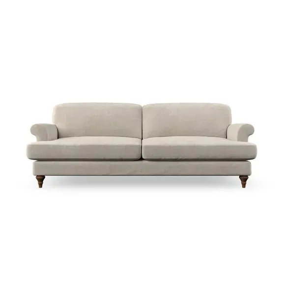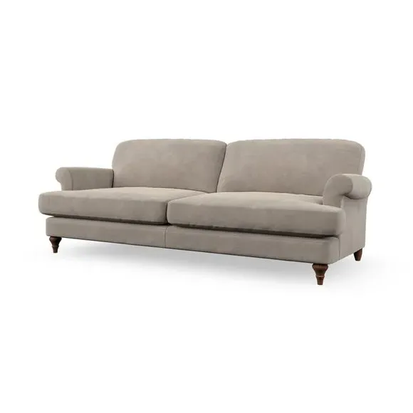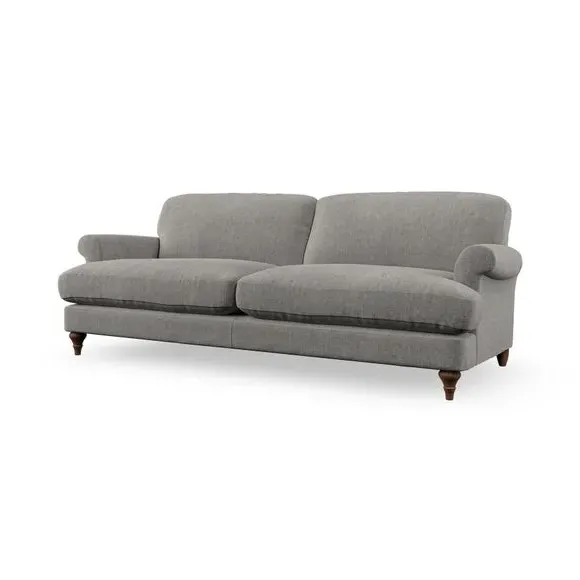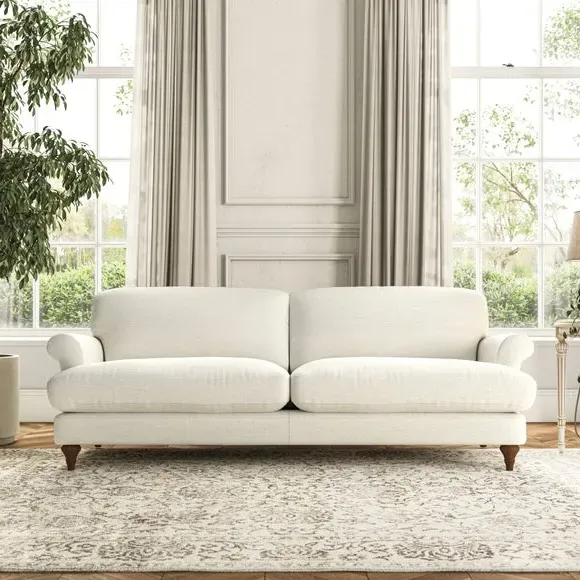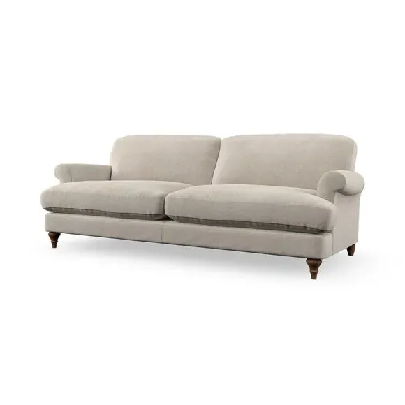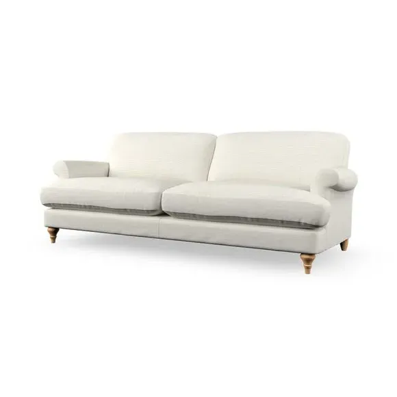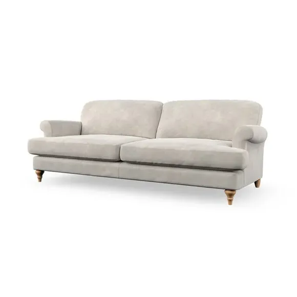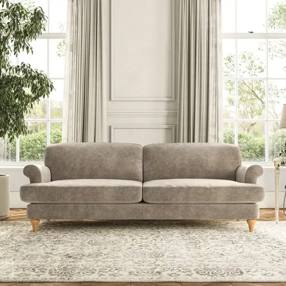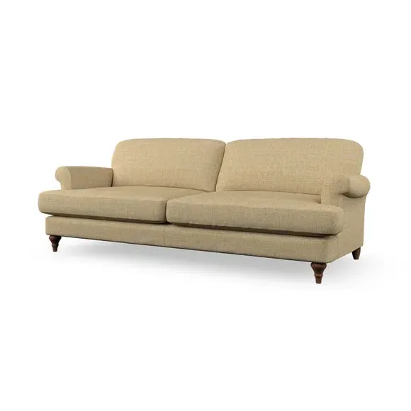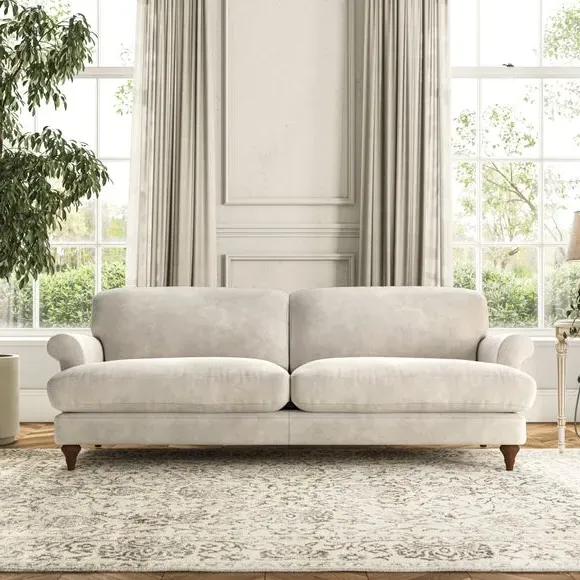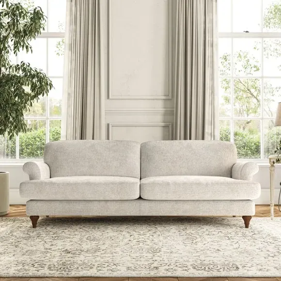* Elegant, classic design* Scroll Arms* Lugged seat cushion* Serpentine seat springs* Choose your support, fabric and leg colour The Evie 4 Seater Sofa combines generous seating space with refined design, making it an ideal choice for larger living rooms. Featuring slender scroll arms and lugged seat cushions, this sofa offers a classic look with a modern touch. The fibre-filled back cushions provide excellent support, making it a comfortable choice for family gatherings or quiet evenings at home. Choose from a wide range of fabrics, colours, cushion fillings, and leg finishes to personalise this piece.