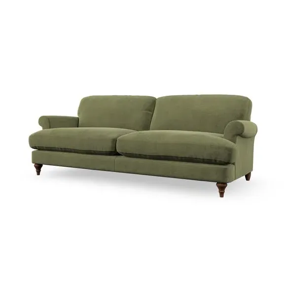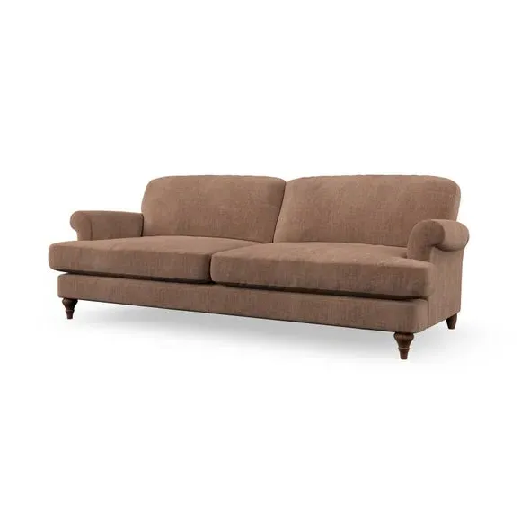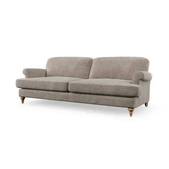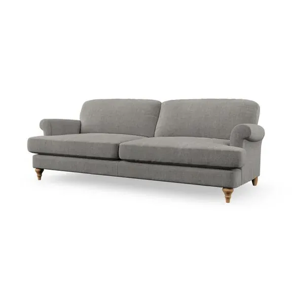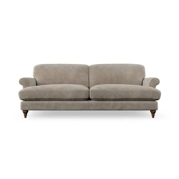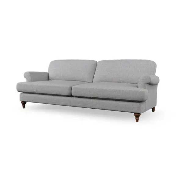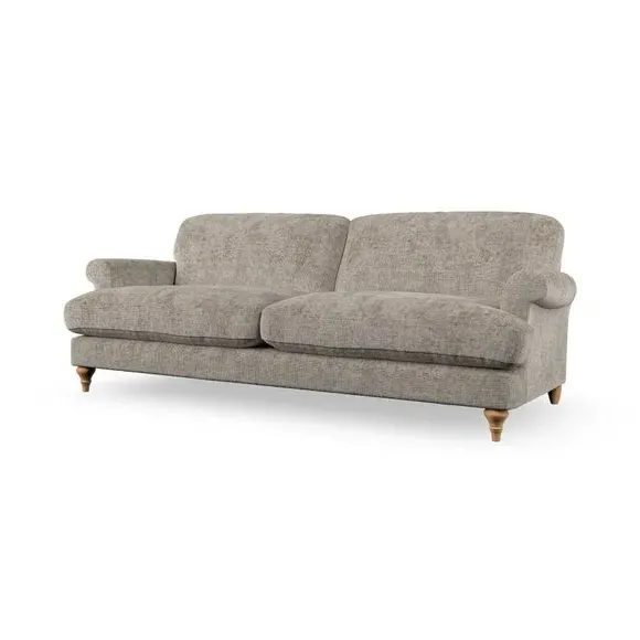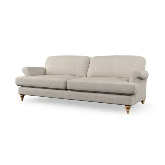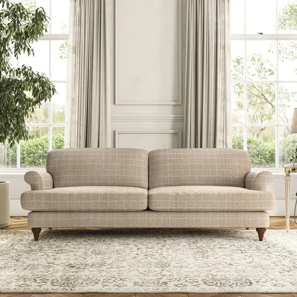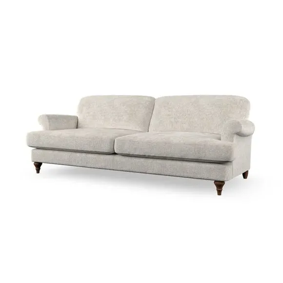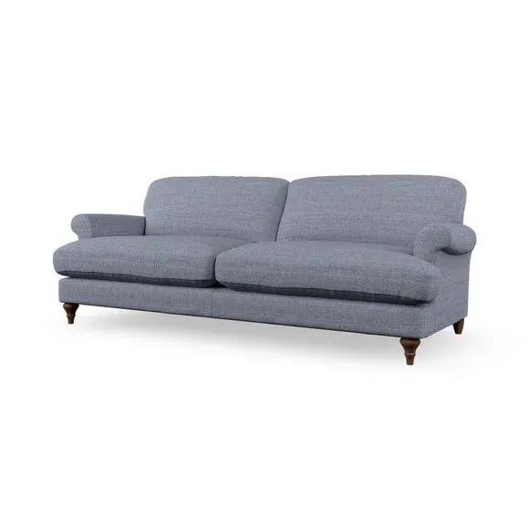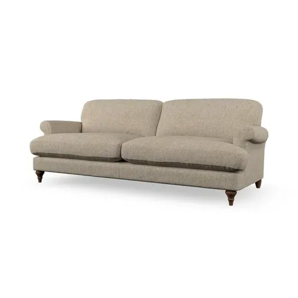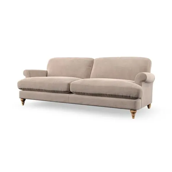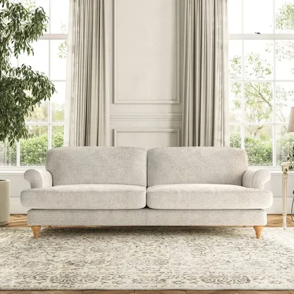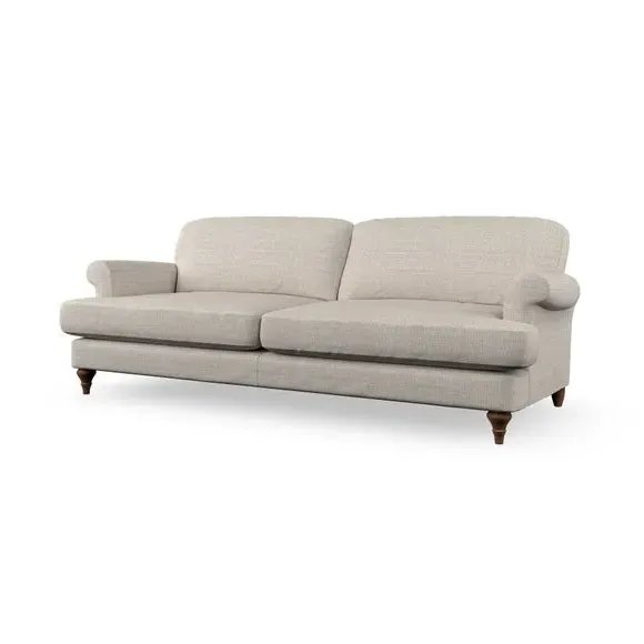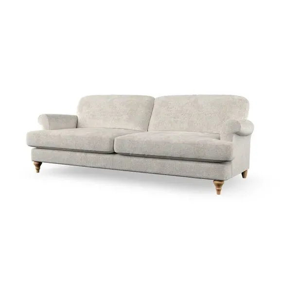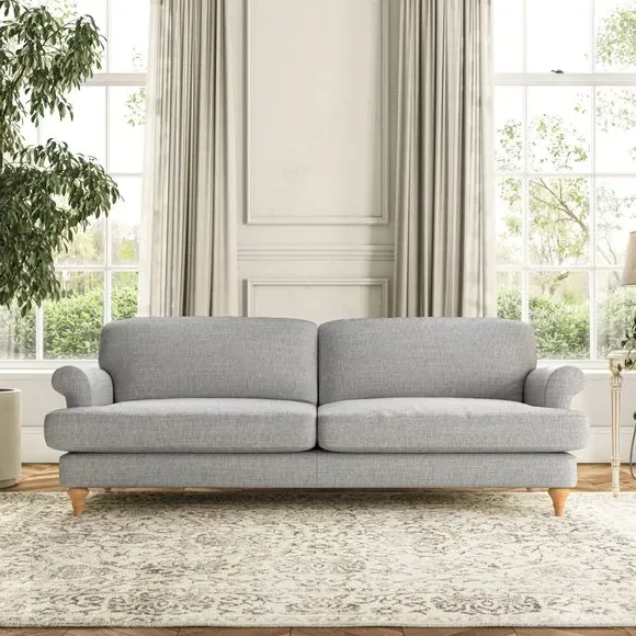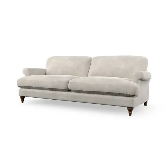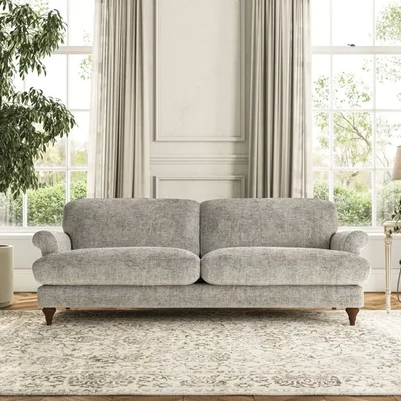 * Elegant, classic design* Scroll Arms* Lugged seat cushion* Serpentine seat springs* Choose your support, fabric and leg colour The Evie 4 Seater Sofa combines generous seating space with refined design, making it an ideal choice for larger living rooms. Featuring slender scroll arms and lugged seat cushions, this sofa offers a classic look with a modern touch. The fibre-filled back cushions provide excellent support, making it a comfortable choice for family gatherings or quiet evenings at home. Choose from a wide range of fabrics, colours, cushion fillings, and leg finishes to personalise this piece.