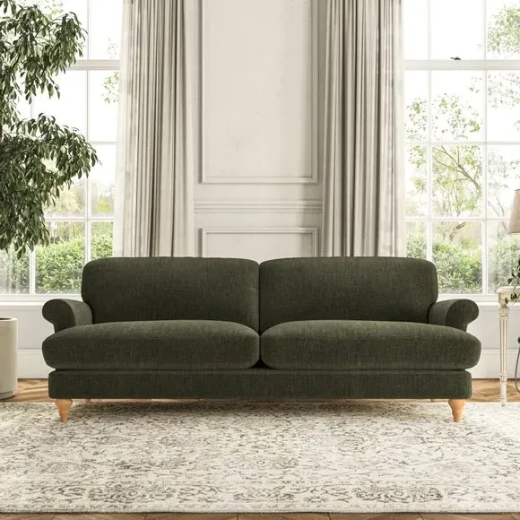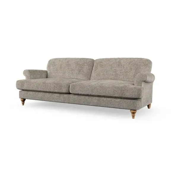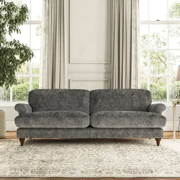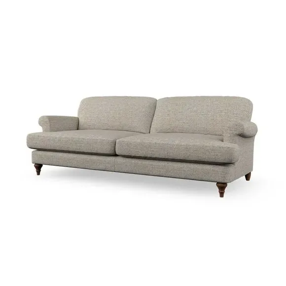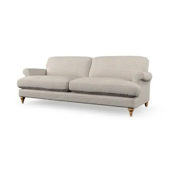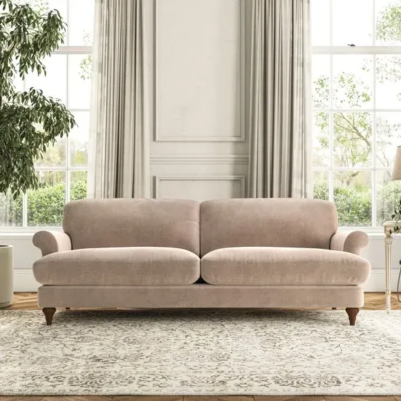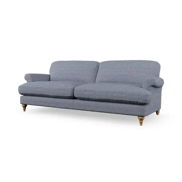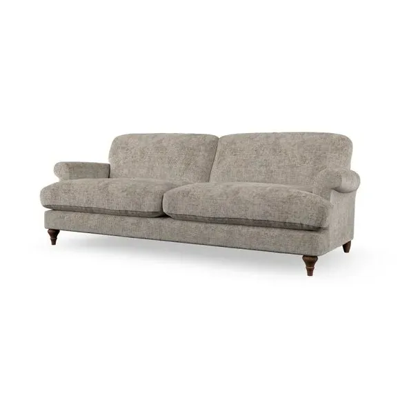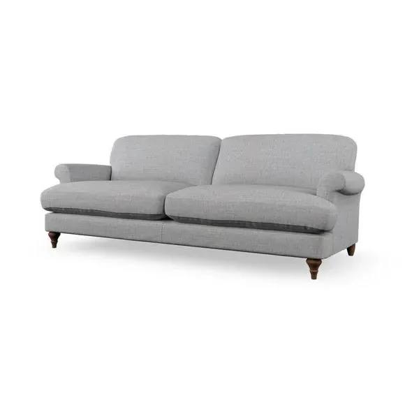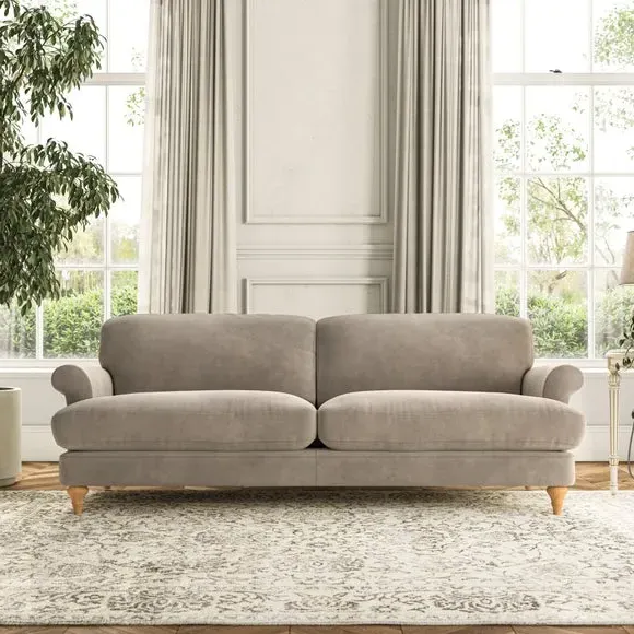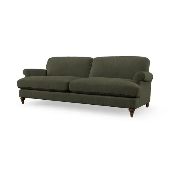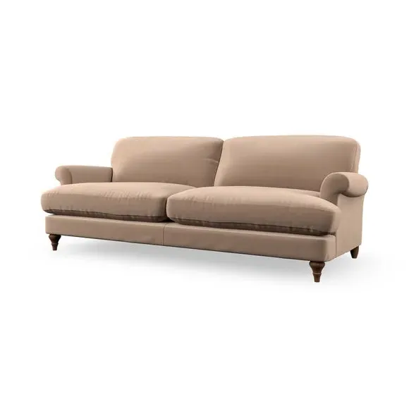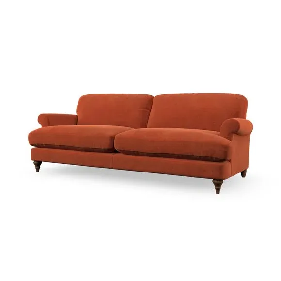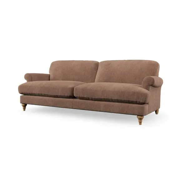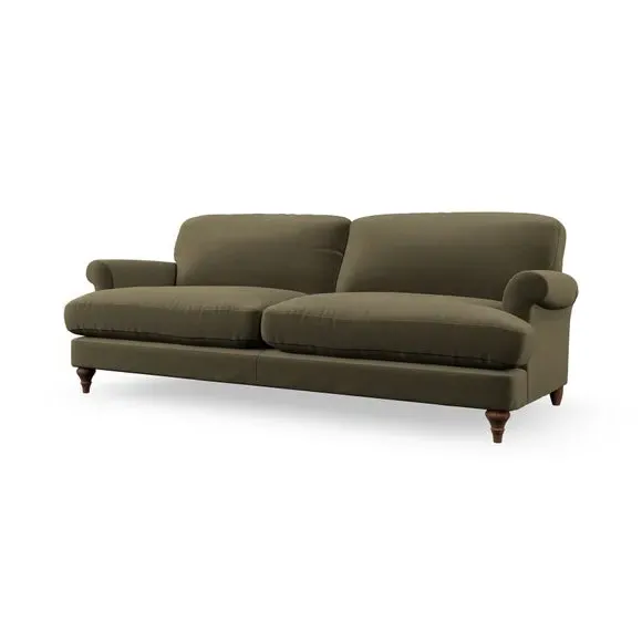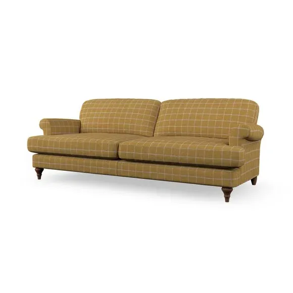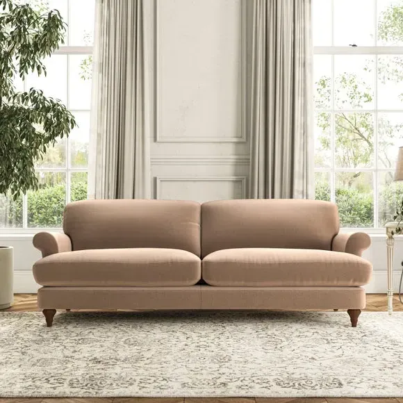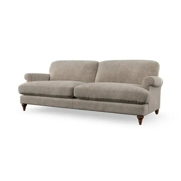 * Elegant, classic design* Scroll Arms* Lugged seat cushion* Serpentine seat springs* Choose your support, fabric and leg colour The Evie 4 Seater Sofa combines generous seating space with refined design, making it an ideal choice for larger living rooms. Featuring slender scroll arms and lugged seat cushions, this sofa offers a classic look with a modern touch. The fibre-filled back cushions provide excellent support, making it a comfortable choice for family gatherings or quiet evenings at home. Choose from a wide range of fabrics, colours, cushion fillings, and leg finishes to personalise this piece.