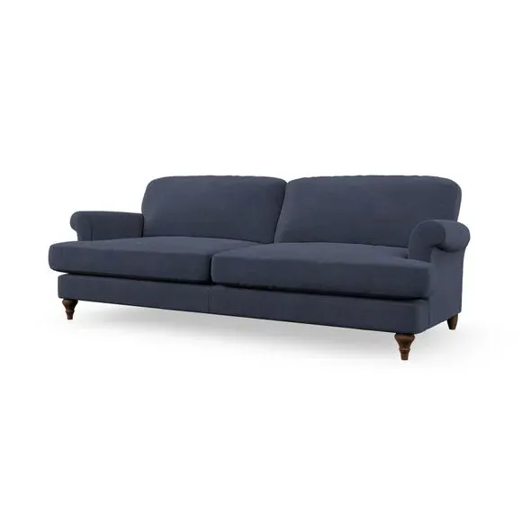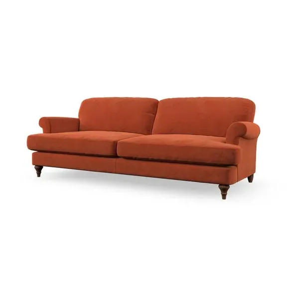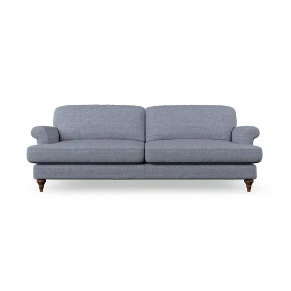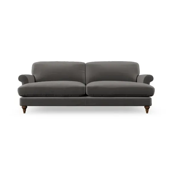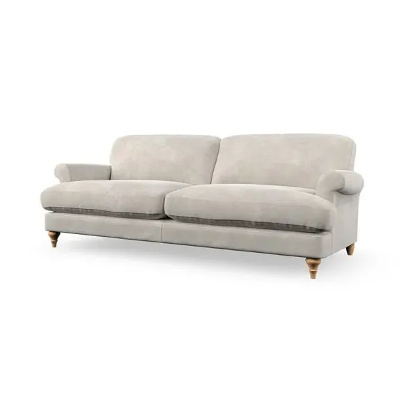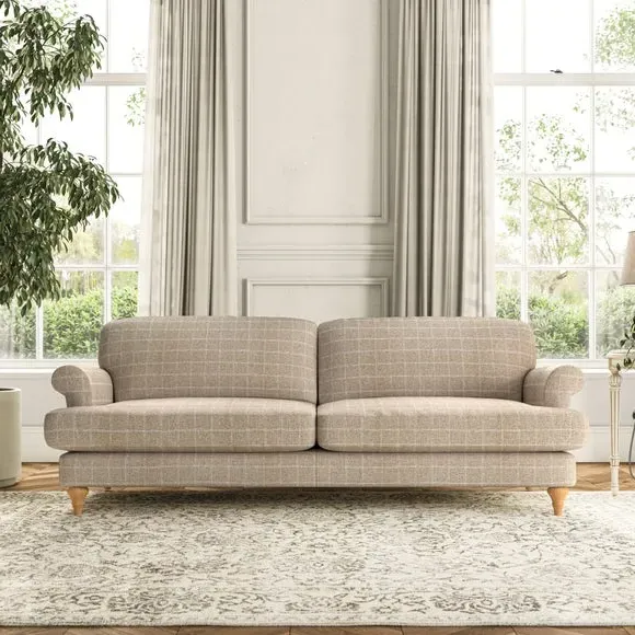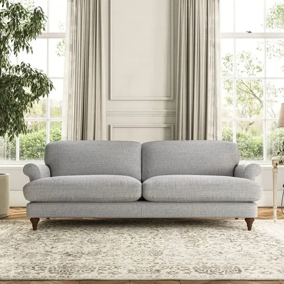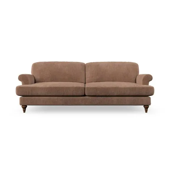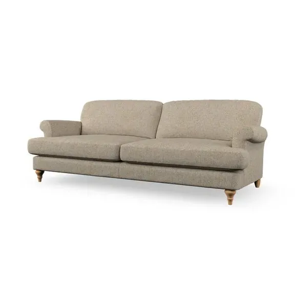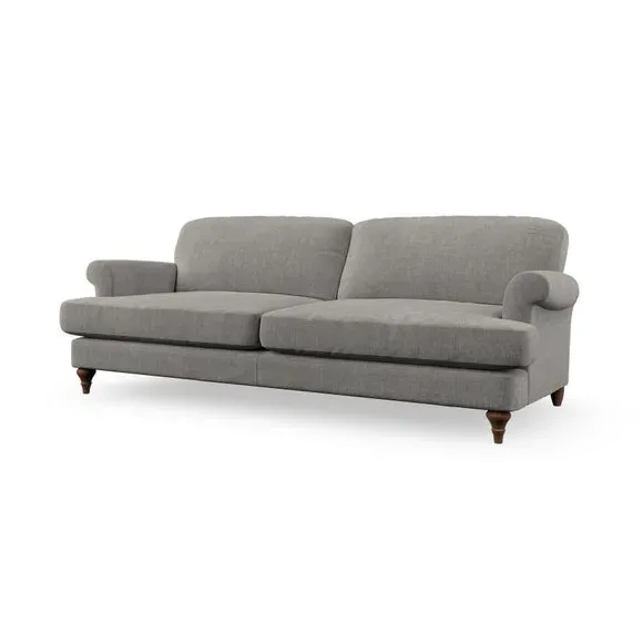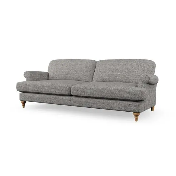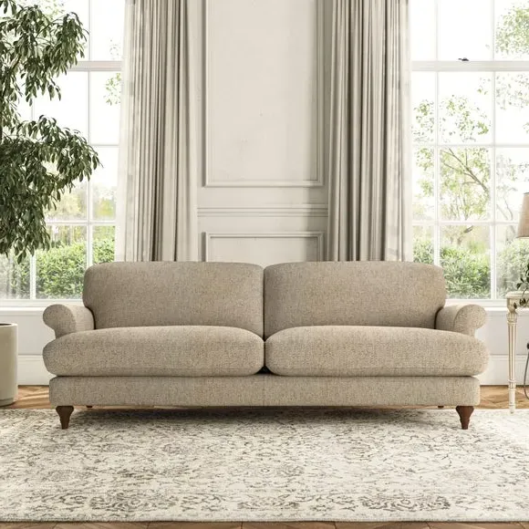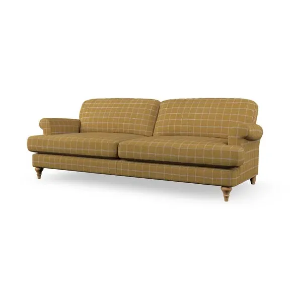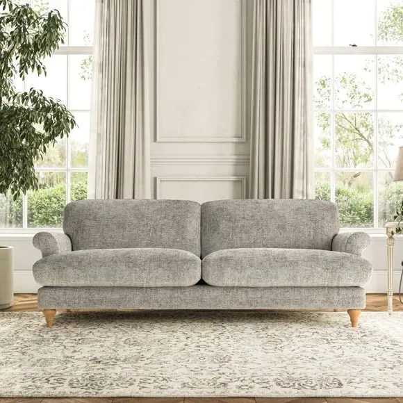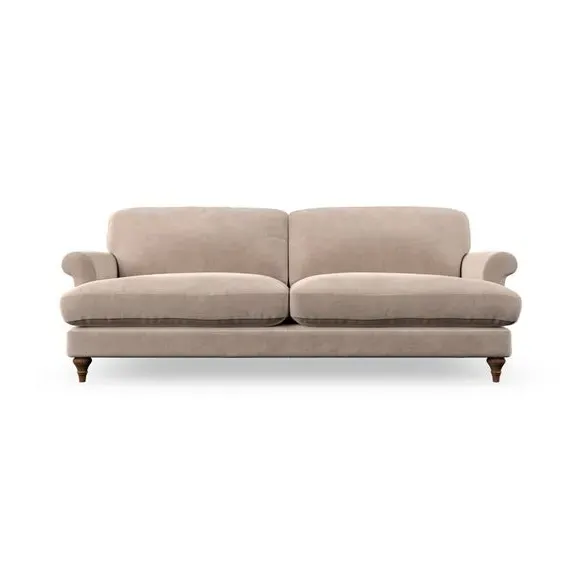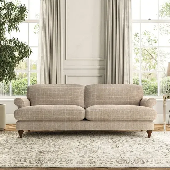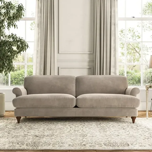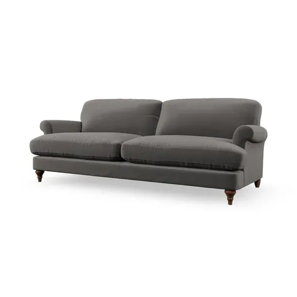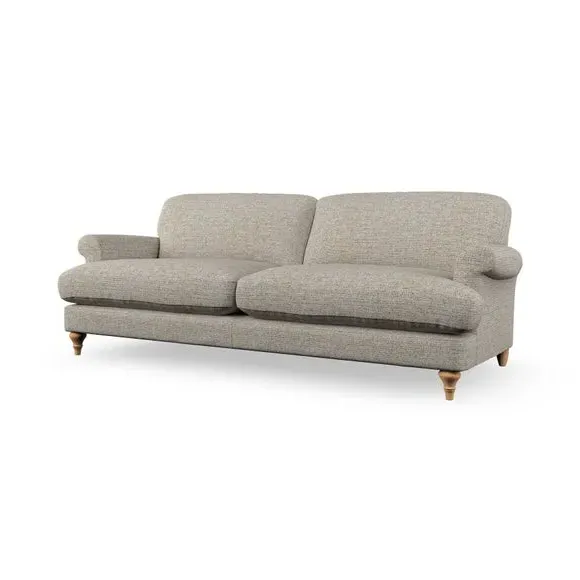 * Elegant, classic design* Scroll Arms* Lugged seat cushion* Serpentine seat springs* Choose your support, fabric and leg colour The Evie 4 Seater Sofa combines generous seating space with refined design, making it an ideal choice for larger living rooms. Featuring slender scroll arms and lugged seat cushions, this sofa offers a classic look with a modern touch. The fibre-filled back cushions provide excellent support, making it a comfortable choice for family gatherings or quiet evenings at home. Choose from a wide range of fabrics, colours, cushion fillings, and leg finishes to personalise this piece.