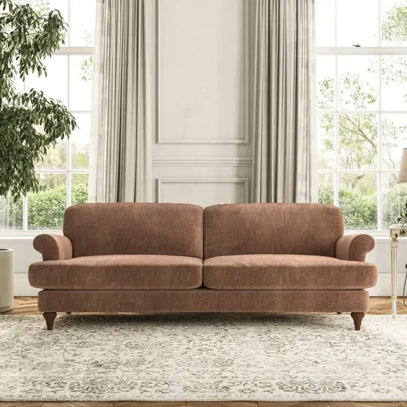 The sofa combines generous seating space with classic design, featuring slender scroll arms and lugged seat cushions. Its serpentine seat springs provide reliable support, while the fibre-filled back cushions add comfort for extended use. The refined construction suits both family gatherings and quiet relaxation.