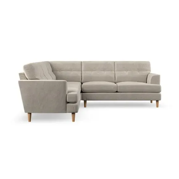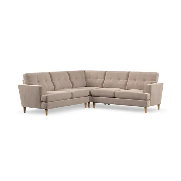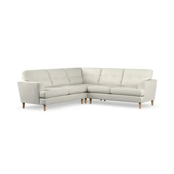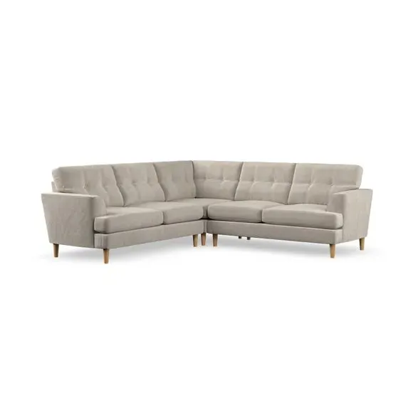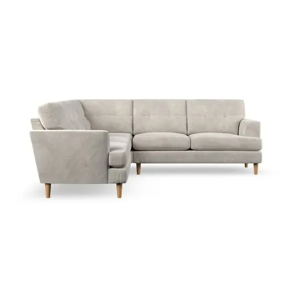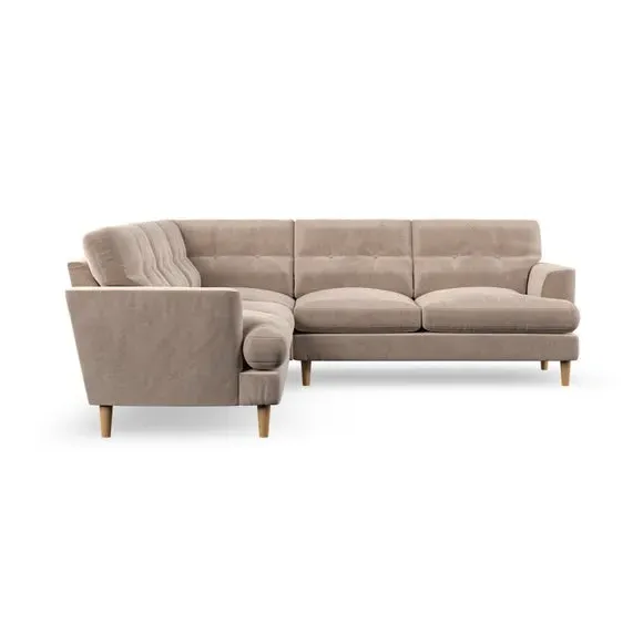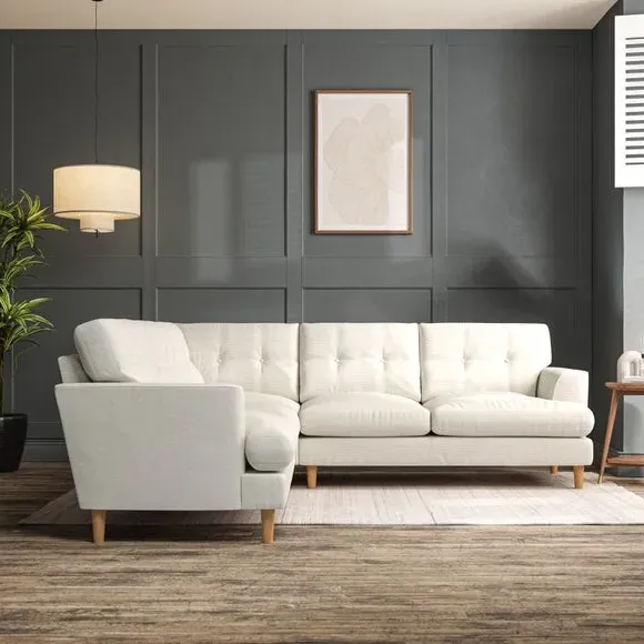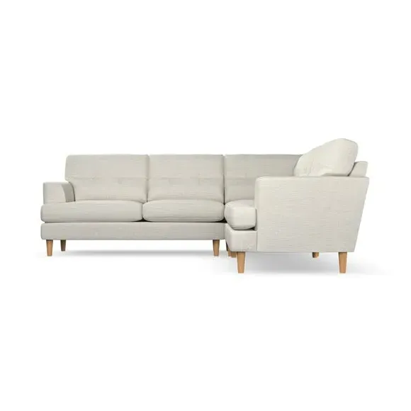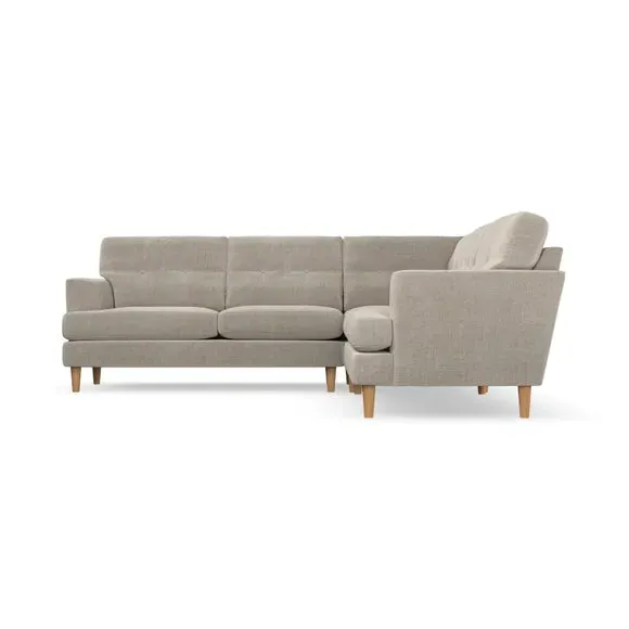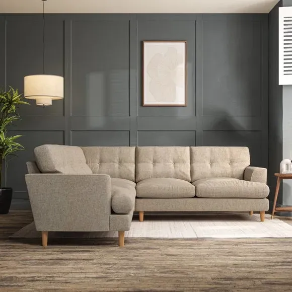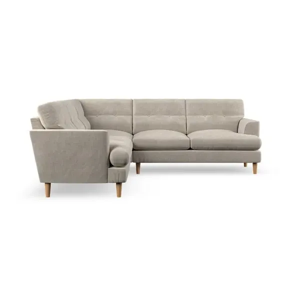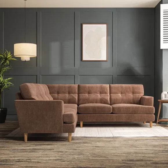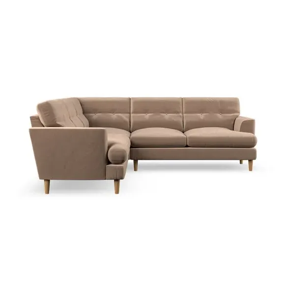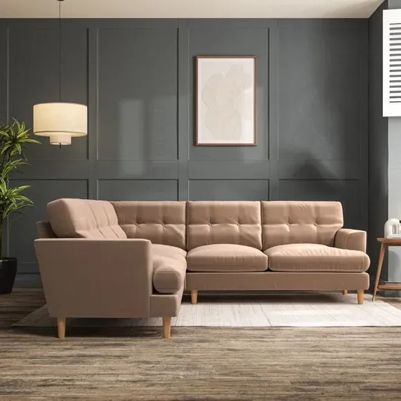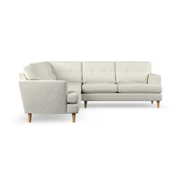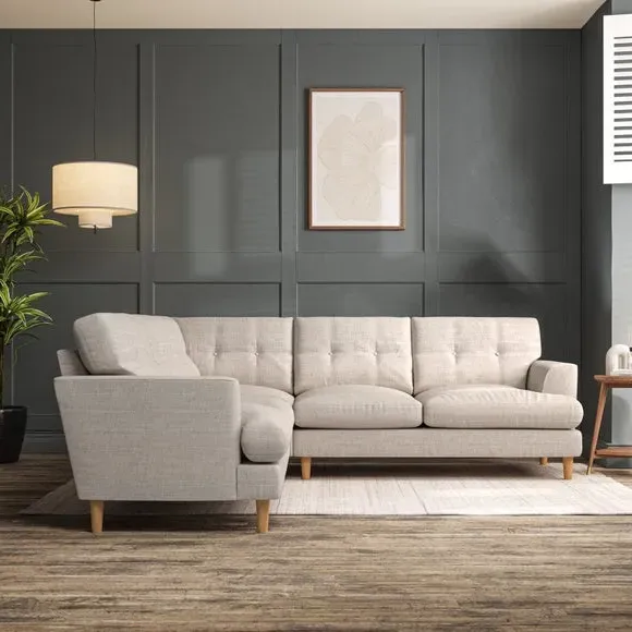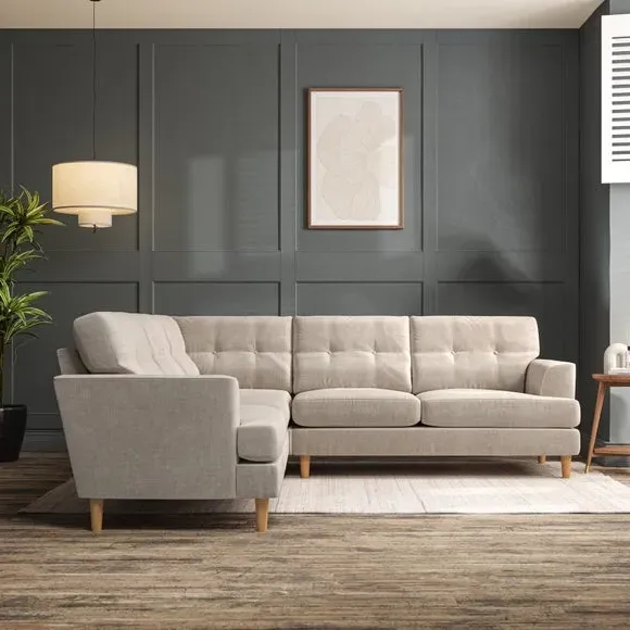 * Scandi inspired design* High legs* Button pull detailing* Right hand facing* Choose the cushion filling, leg colour and fabric The Cooper 5 Seater Corner Sofa combines spacious seating with Scandinavian-inspired sophistication. Perfect for larger living rooms, its high-leg design, clean lines, and T-shaped seat cushions create a modern and inviting aesthetic. The generously fibre-filled back cushions feature button-pull detailing, delivering exceptional comfort and support. Ideal for gatherings or family lounging, this sofa offers customisable options, including fabric type, leg finish, and cushion filling.