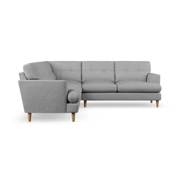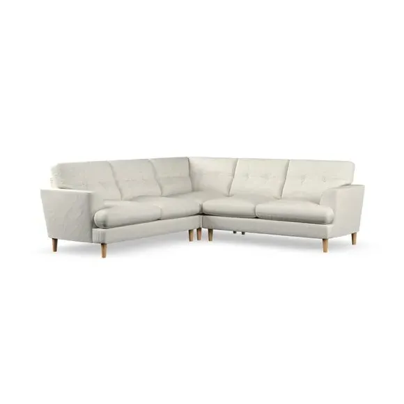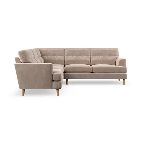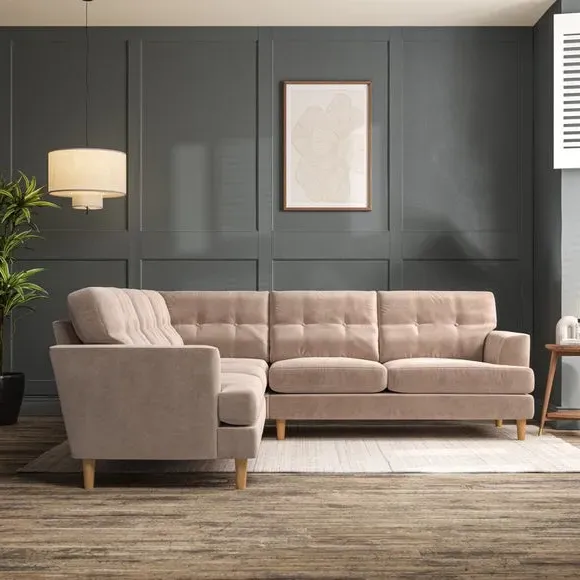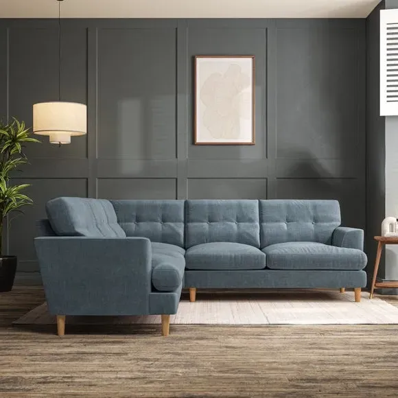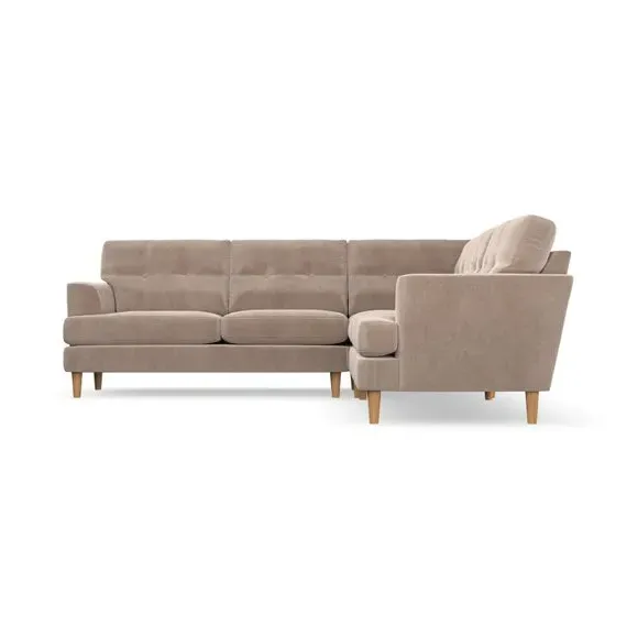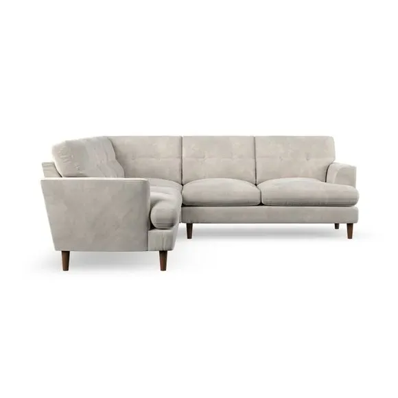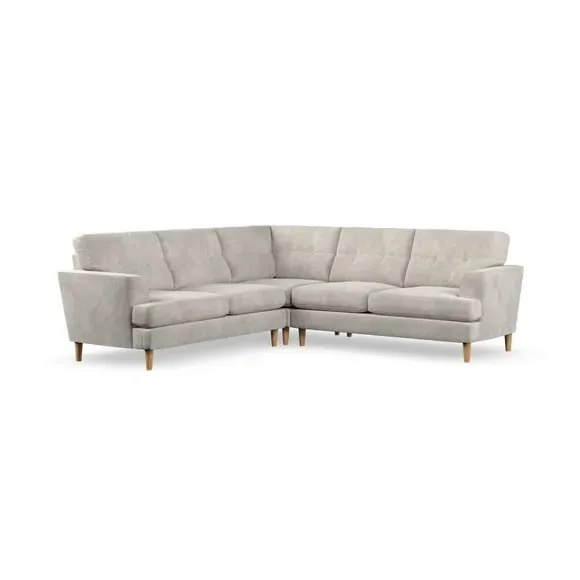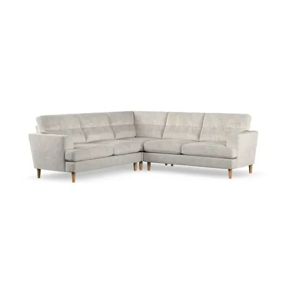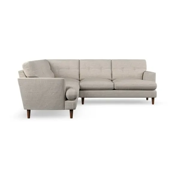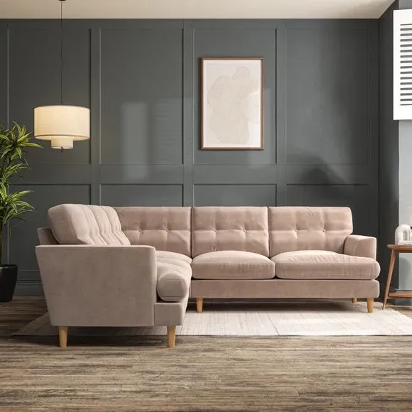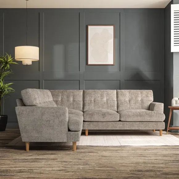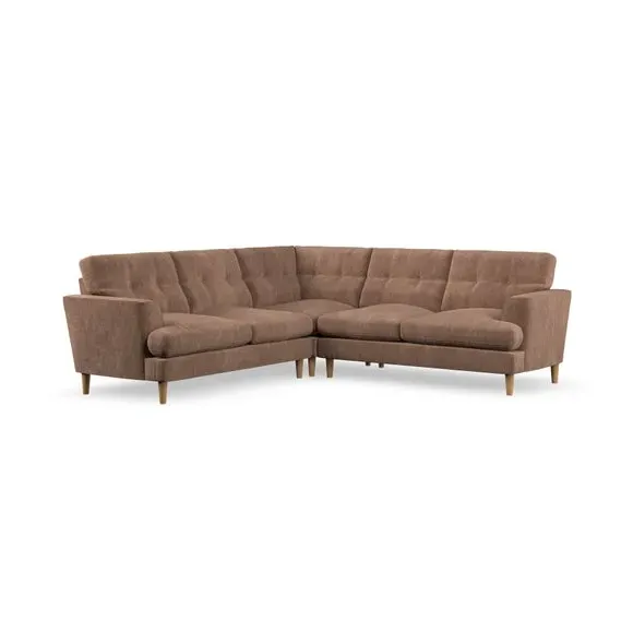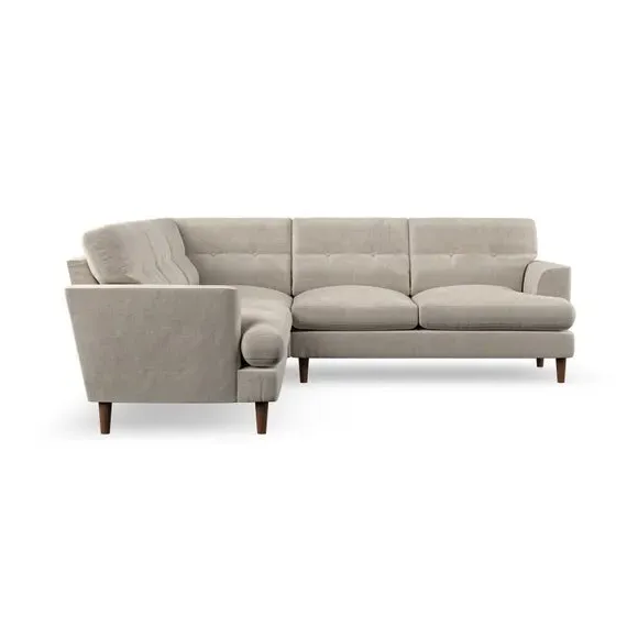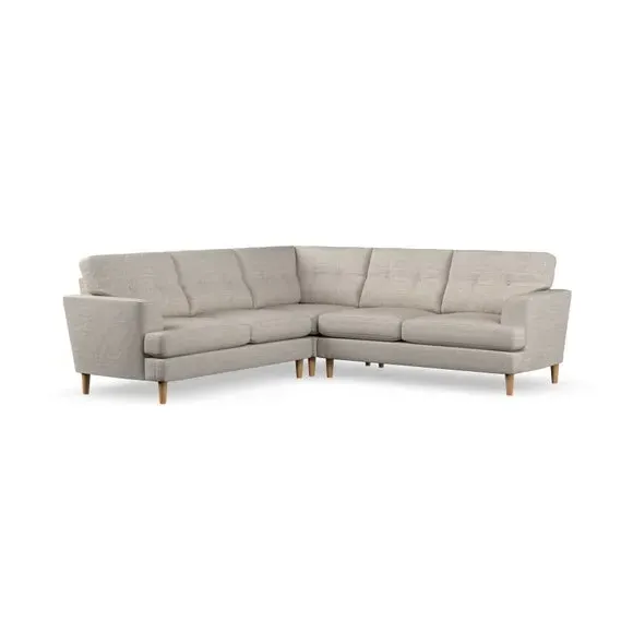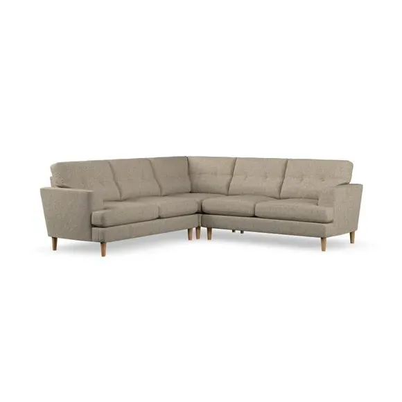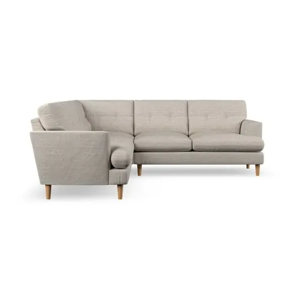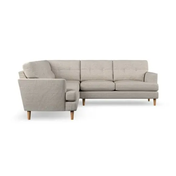 * Scandi inspired design* High legs* Button pull detailing* Right hand facing* Choose the cushion filling, leg colour and fabric The Cooper 5 Seater Corner Sofa combines spacious seating with Scandinavian-inspired sophistication. Perfect for larger living rooms, its high-leg design, clean lines, and T-shaped seat cushions create a modern and inviting aesthetic. The generously fibre-filled back cushions feature button-pull detailing, delivering exceptional comfort and support. Ideal for gatherings or family lounging, this sofa offers customisable options, including fabric type, leg finish, and cushion filling.
