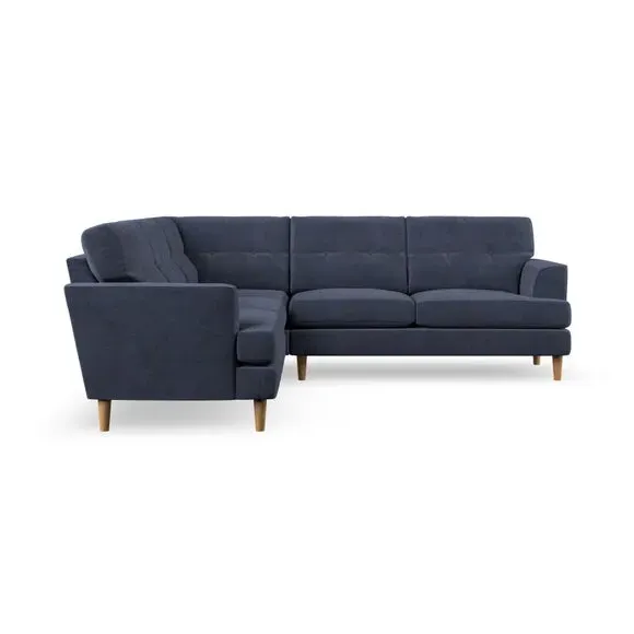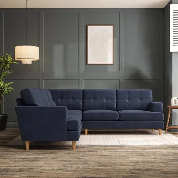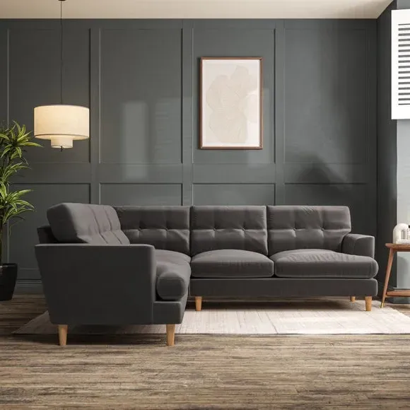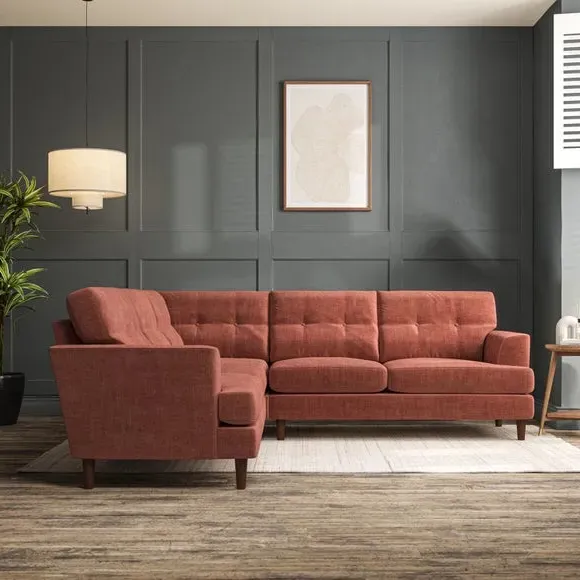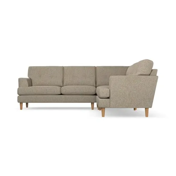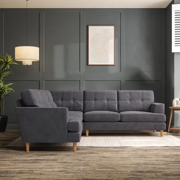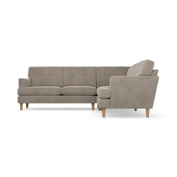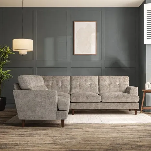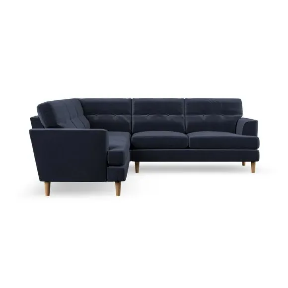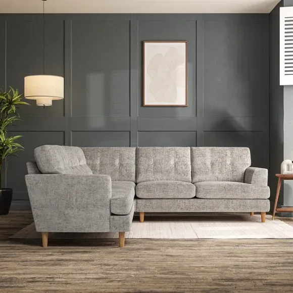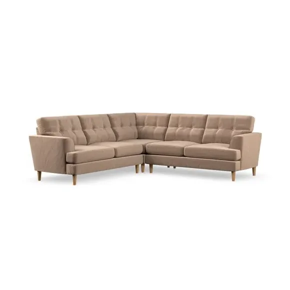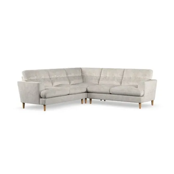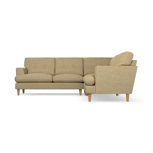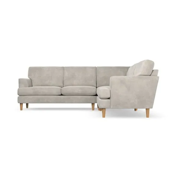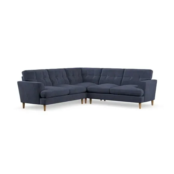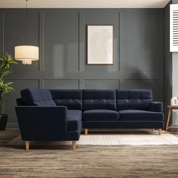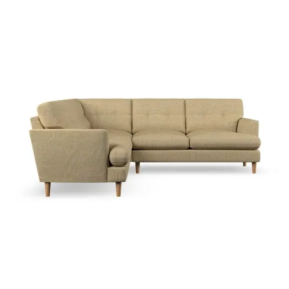 * Scandi inspired design* High legs* Button pull detailing* Right hand facing* Choose the cushion filling, leg colour and fabric The Cooper 5 Seater Corner Sofa combines spacious seating with Scandinavian-inspired sophistication. Perfect for larger living rooms, its high-leg design, clean lines, and T-shaped seat cushions create a modern and inviting aesthetic. The generously fibre-filled back cushions feature button-pull detailing, delivering exceptional comfort and support. Ideal for gatherings or family lounging, this sofa offers customisable options, including fabric type, leg finish, and cushion filling.