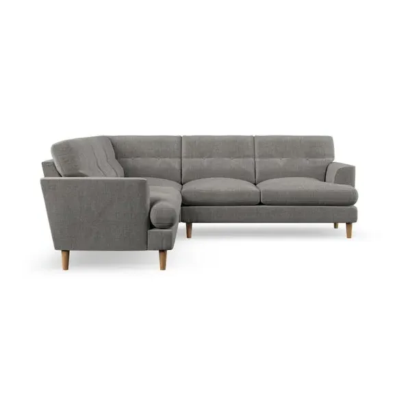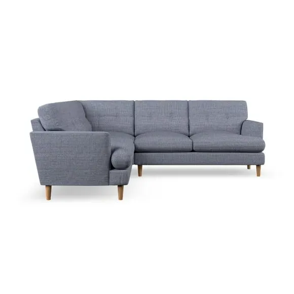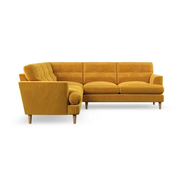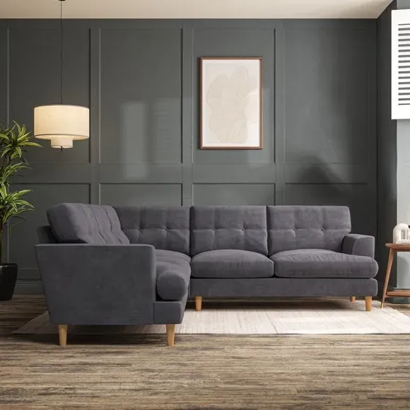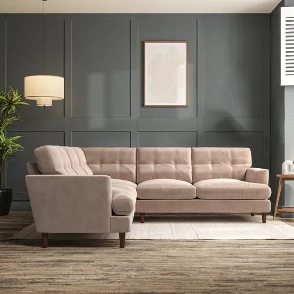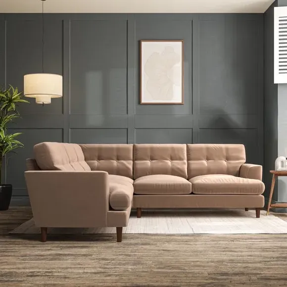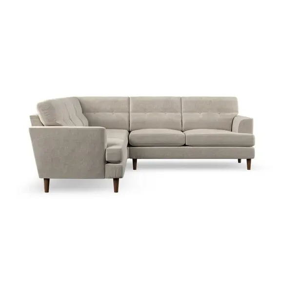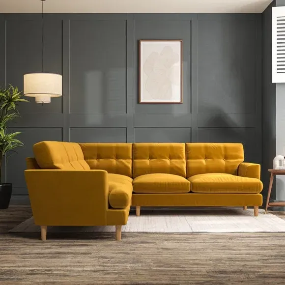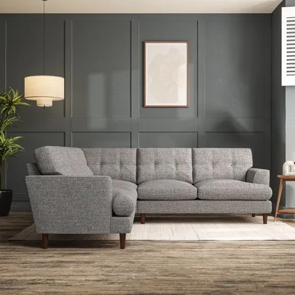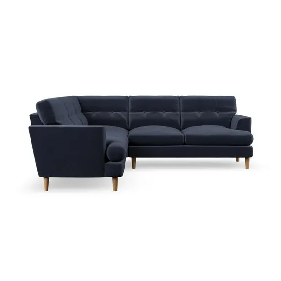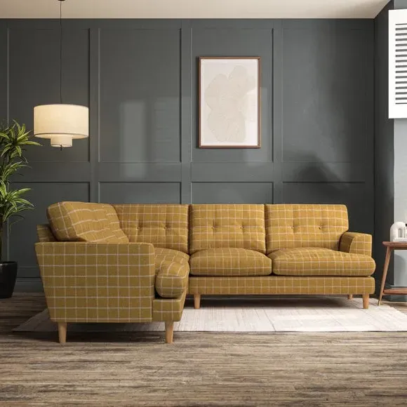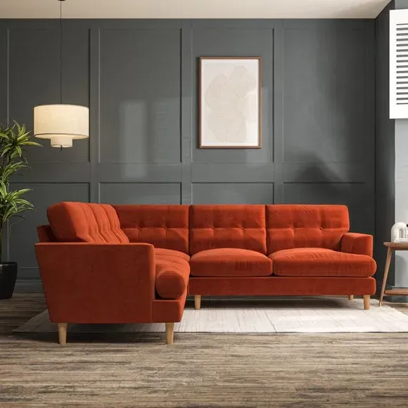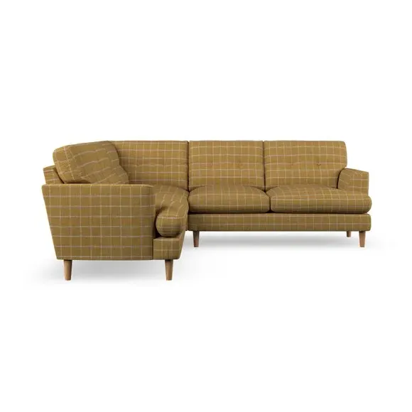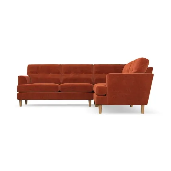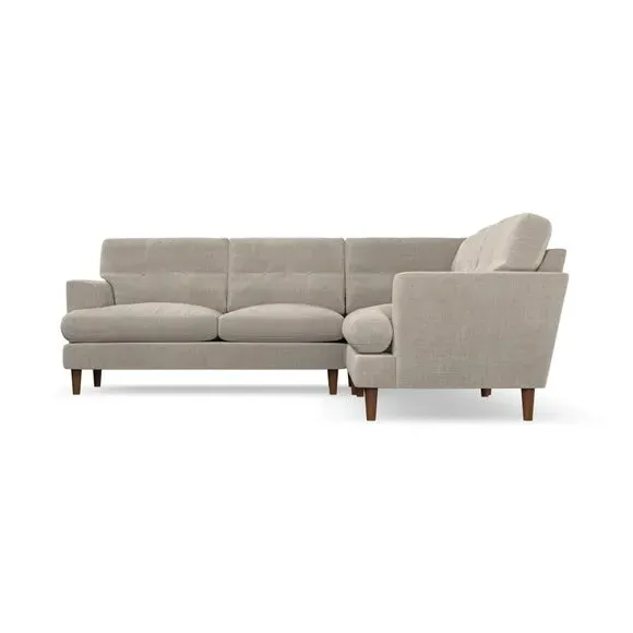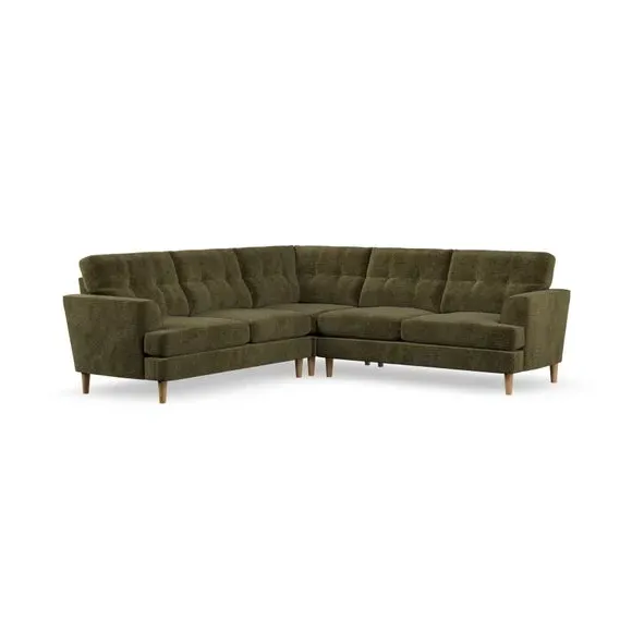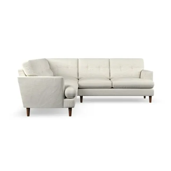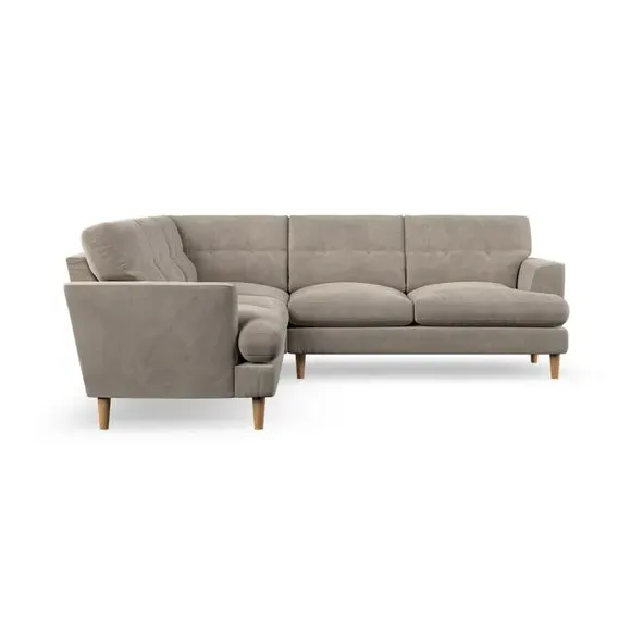 * Scandi inspired design* High legs* Button pull detailing* Right hand facing* Choose the cushion filling, leg colour and fabric The Cooper 5 Seater Corner Sofa combines spacious seating with Scandinavian-inspired sophistication. Perfect for larger living rooms, its high-leg design, clean lines, and T-shaped seat cushions create a modern and inviting aesthetic. The generously fibre-filled back cushions feature button-pull detailing, delivering exceptional comfort and support. Ideal for gatherings or family lounging, this sofa offers customisable options, including fabric type, leg finish, and cushion filling.
