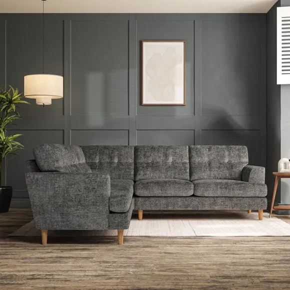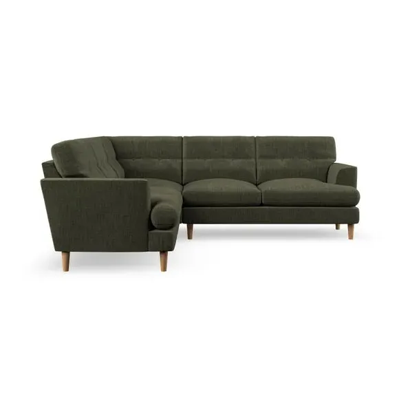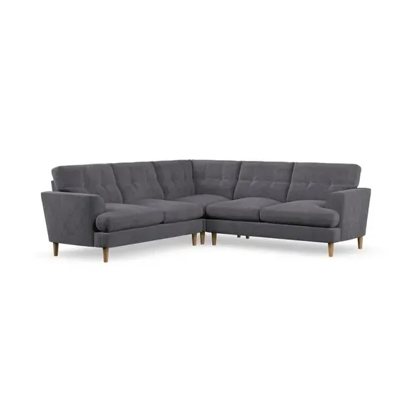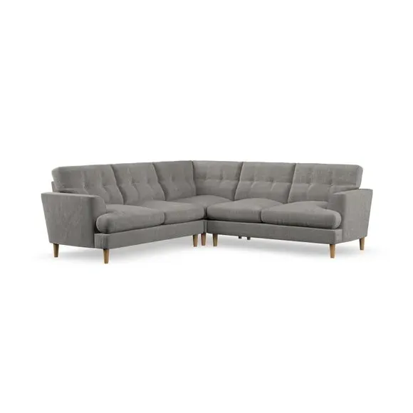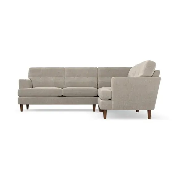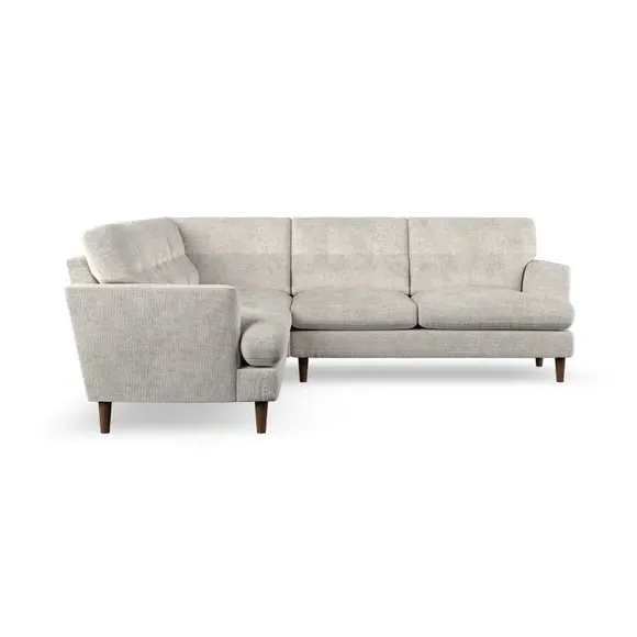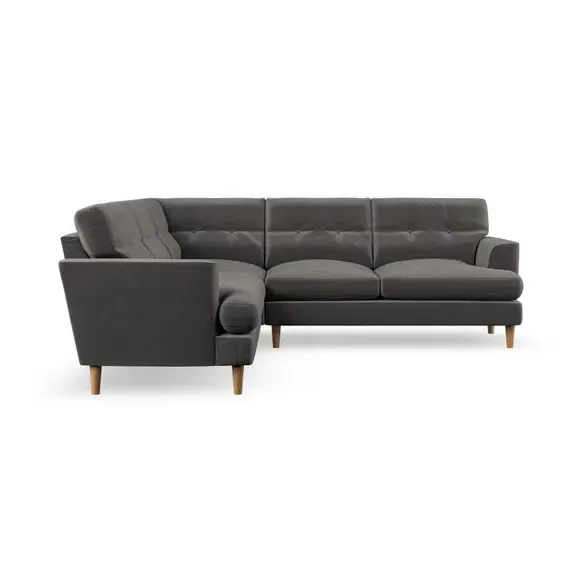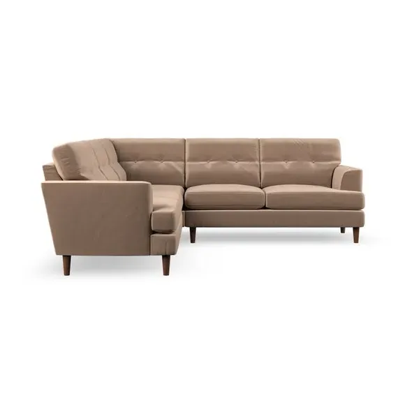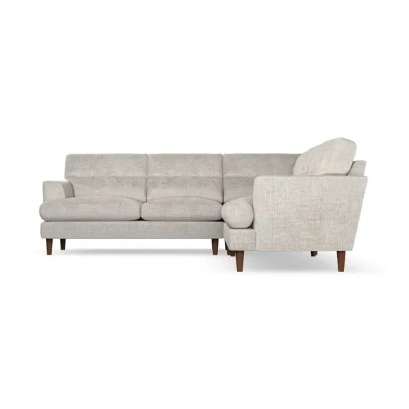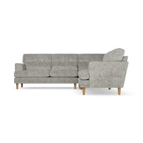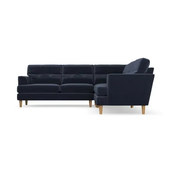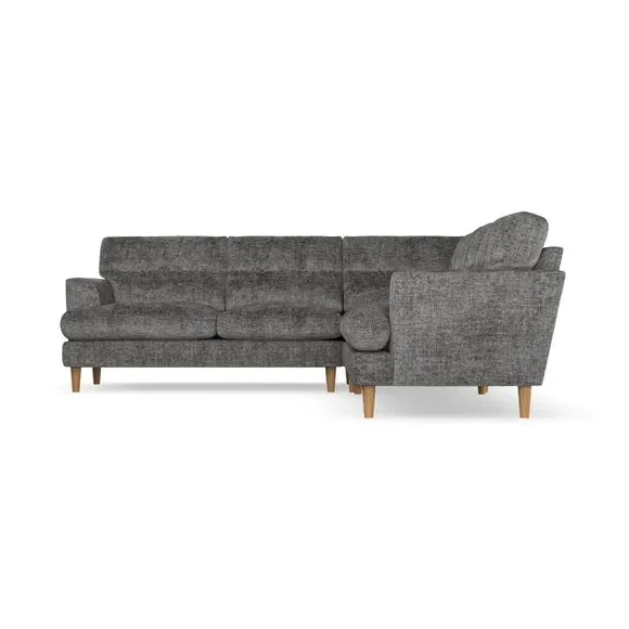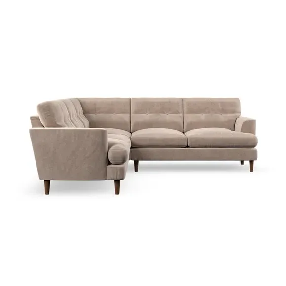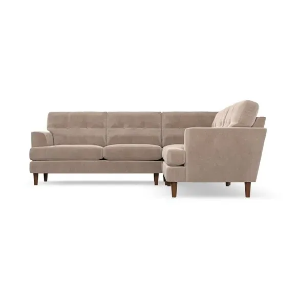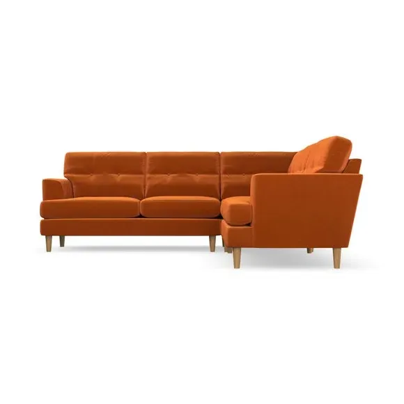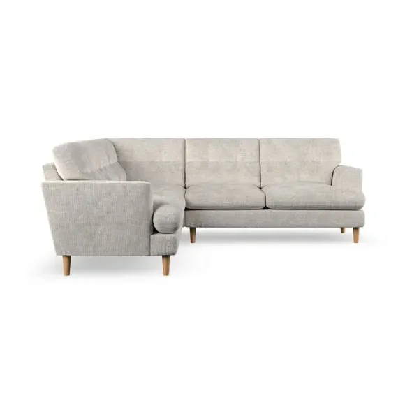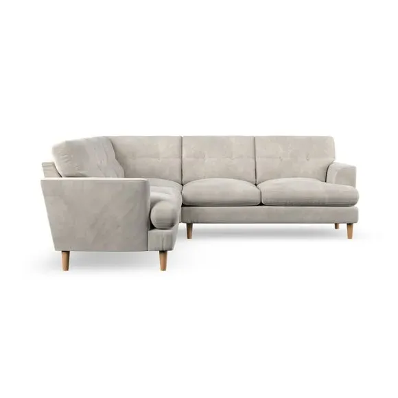 * Scandi inspired design* High legs* Button pull detailing* Right hand facing* Choose the cushion filling, leg colour and fabric The Cooper 5 Seater Corner Sofa combines spacious seating with Scandinavian-inspired sophistication. Perfect for larger living rooms, its high-leg design, clean lines, and T-shaped seat cushions create a modern and inviting aesthetic. The generously fibre-filled back cushions feature button-pull detailing, delivering exceptional comfort and support. Ideal for gatherings or family lounging, this sofa offers customisable options, including fabric type, leg finish, and cushion filling.