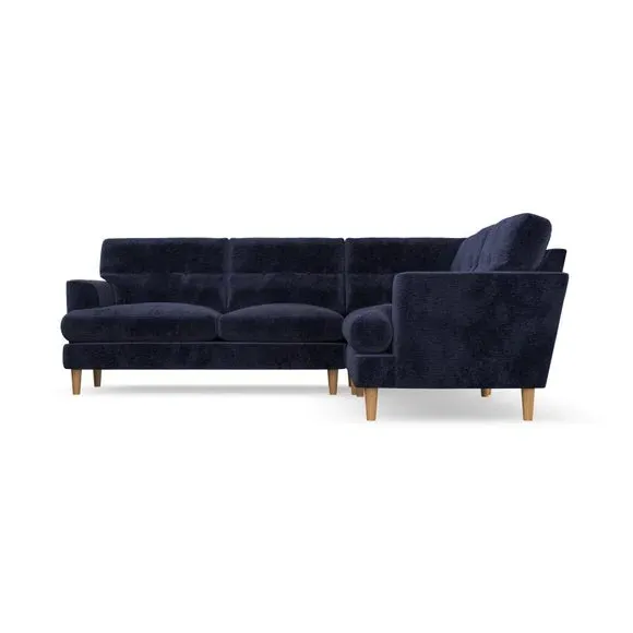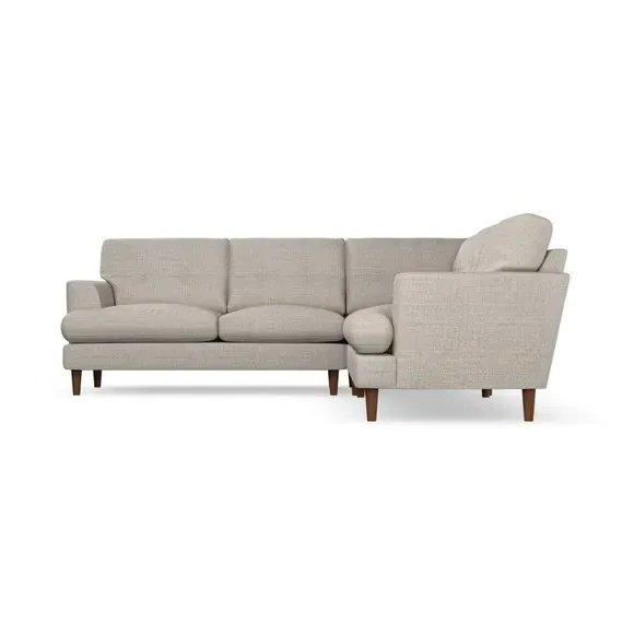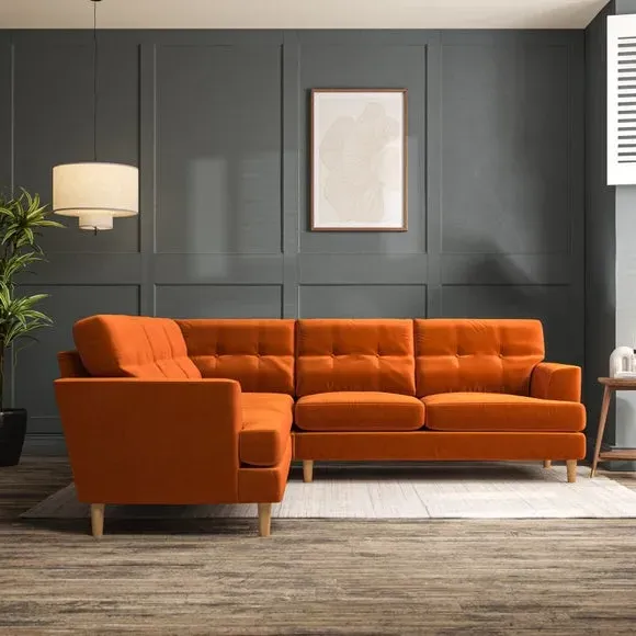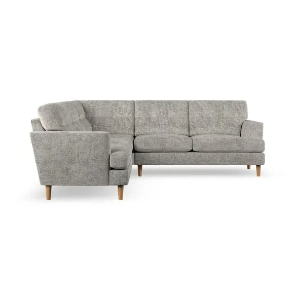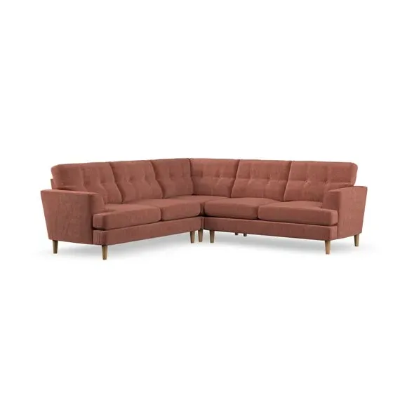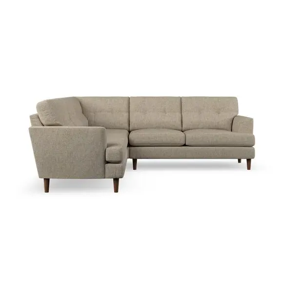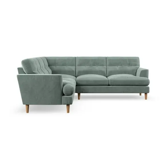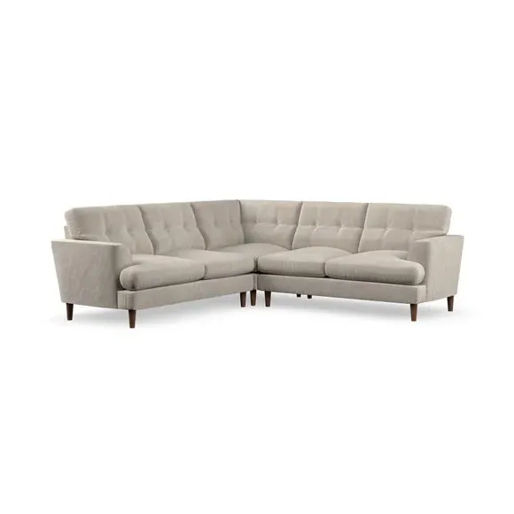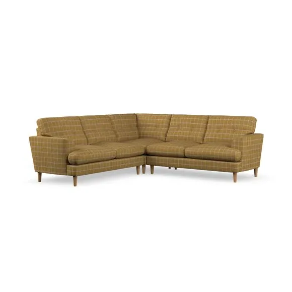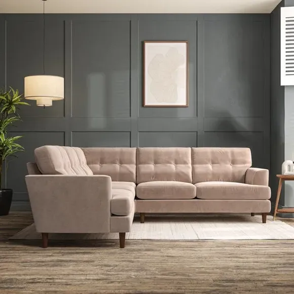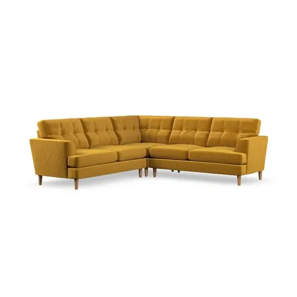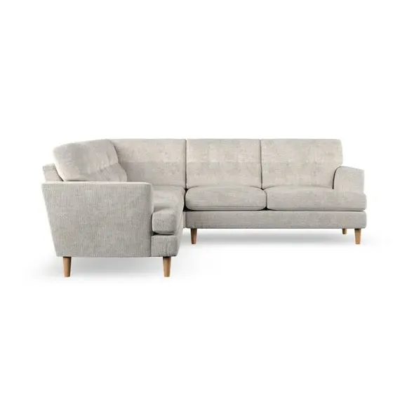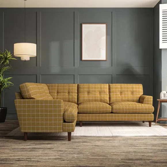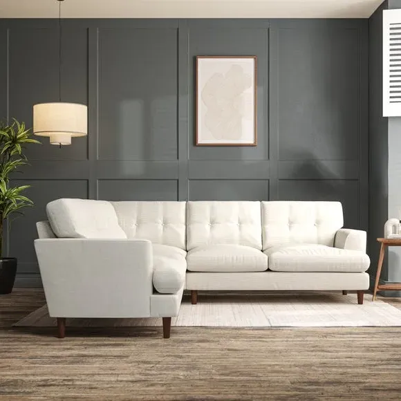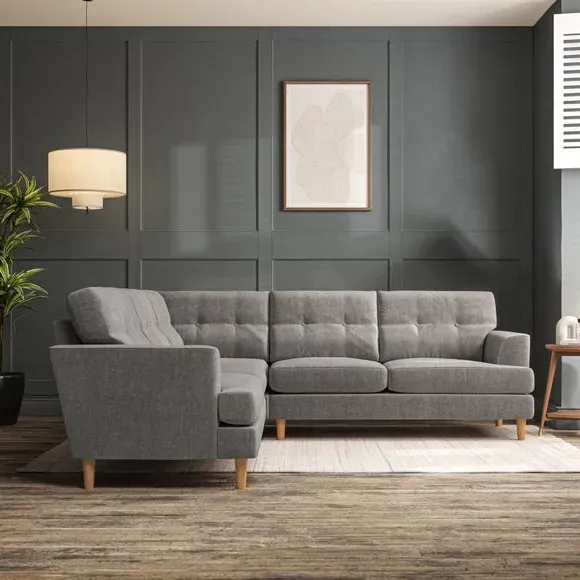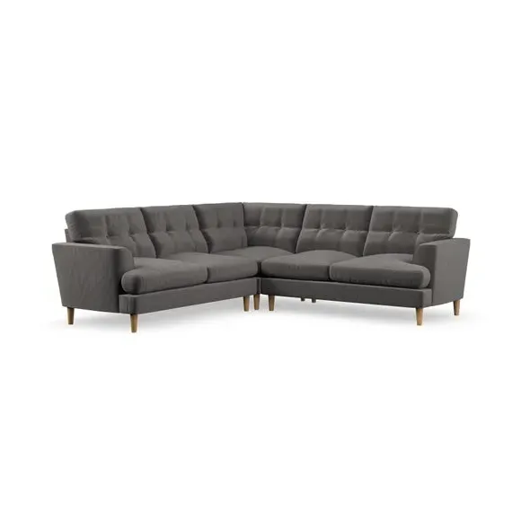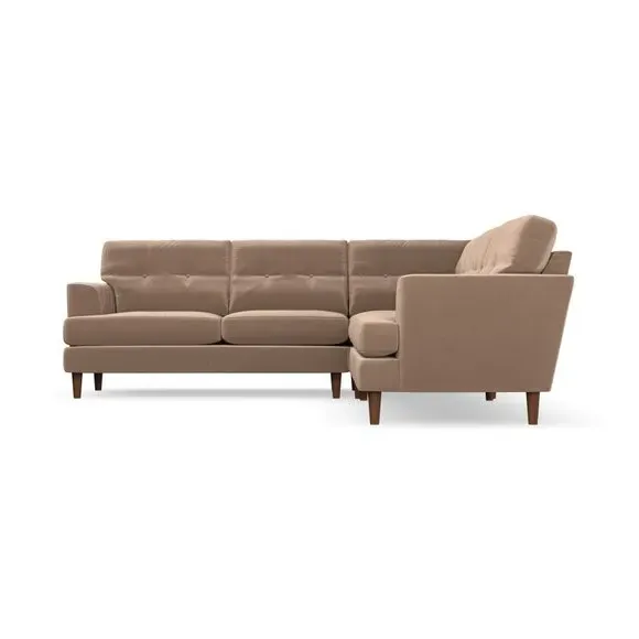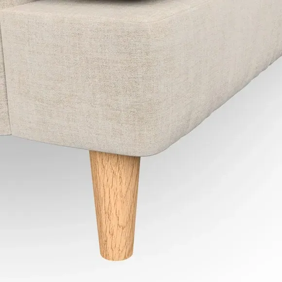* Scandi inspired design* High legs* Button pull detailing* Right hand facing* Choose the cushion filling, leg colour and fabric The Cooper 5 Seater Corner Sofa combines spacious seating with Scandinavian-inspired sophistication. Perfect for larger living rooms, its high-leg design, clean lines, and T-shaped seat cushions create a modern and inviting aesthetic. The generously fibre-filled back cushions feature button-pull detailing, delivering exceptional comfort and support. Ideal for gatherings or family lounging, this sofa offers customisable options, including fabric type, leg finish, and cushion filling.