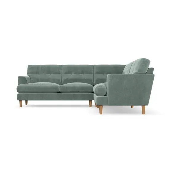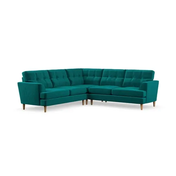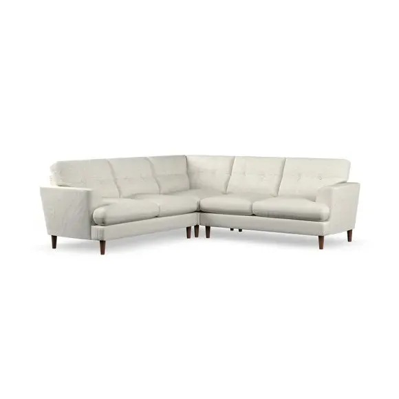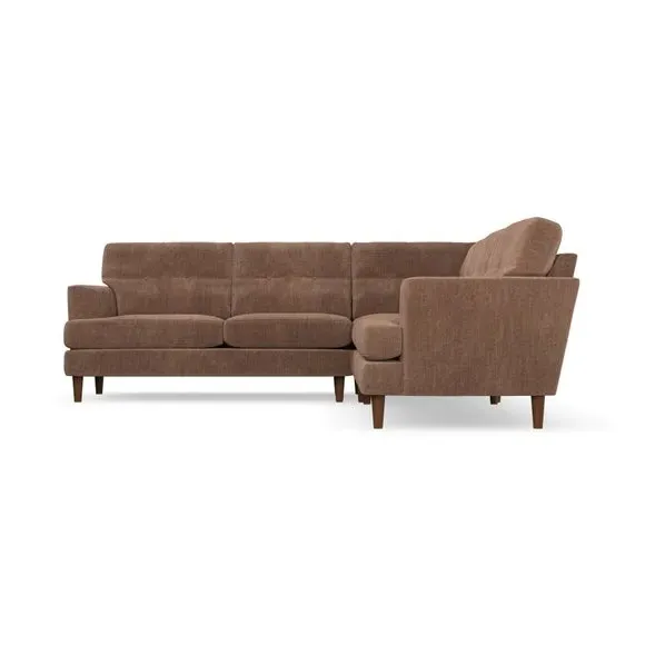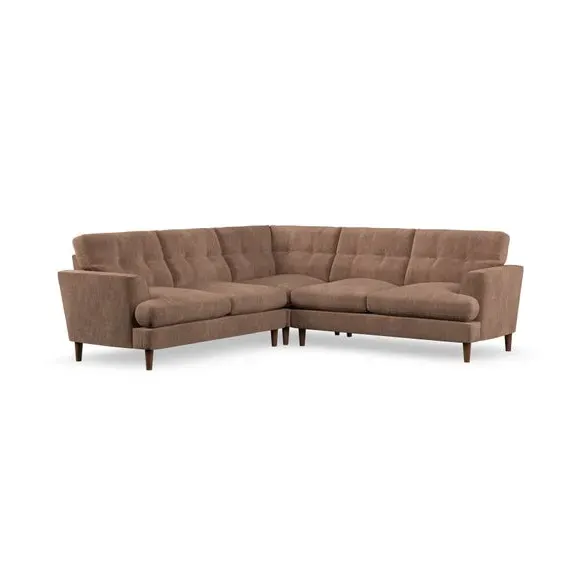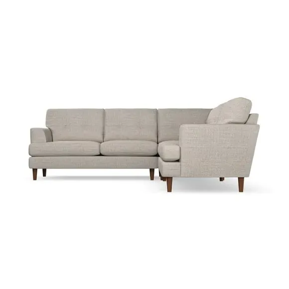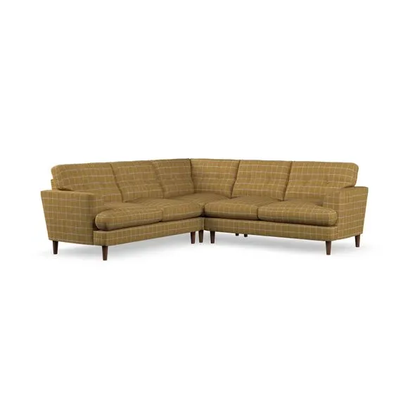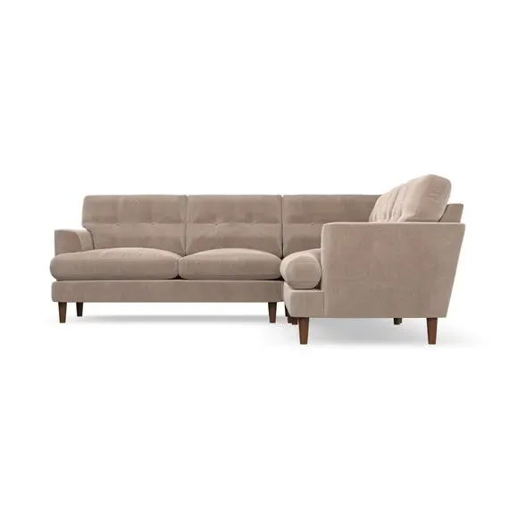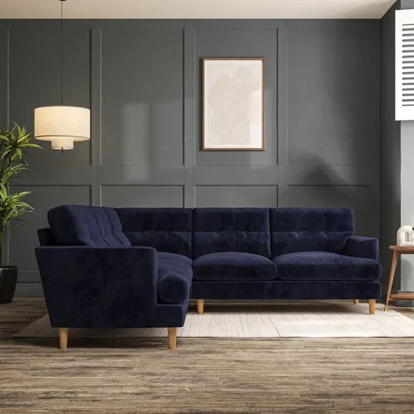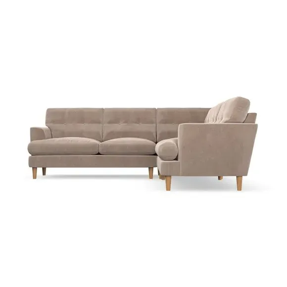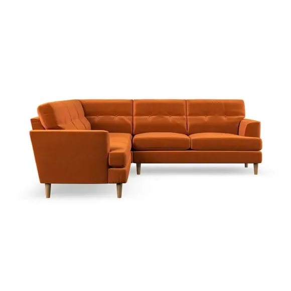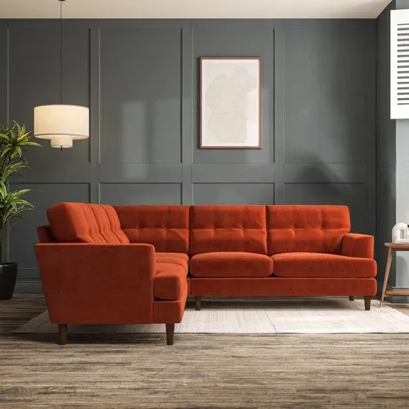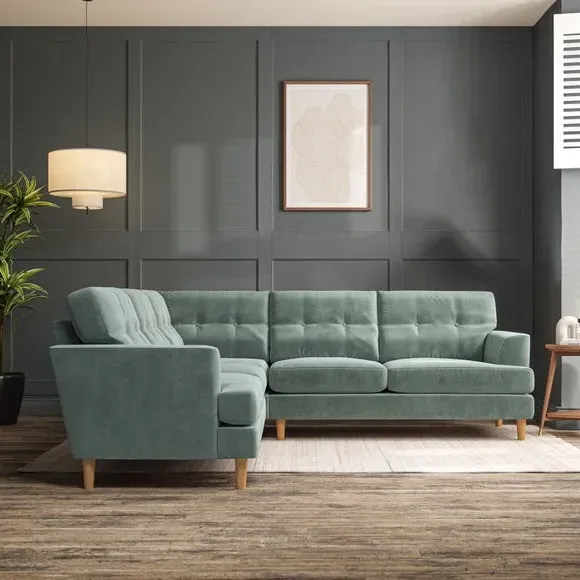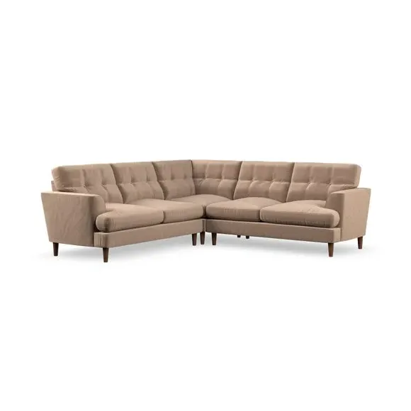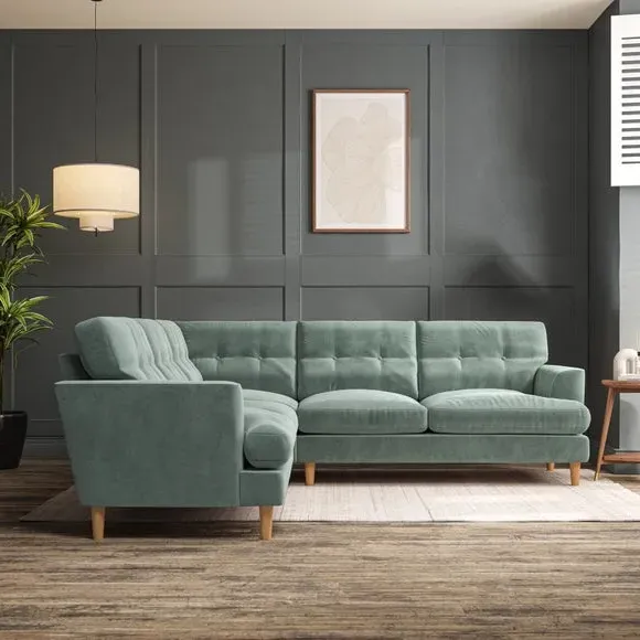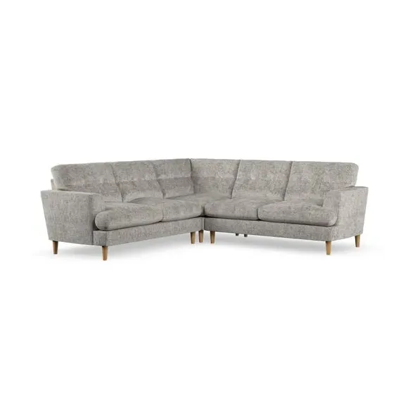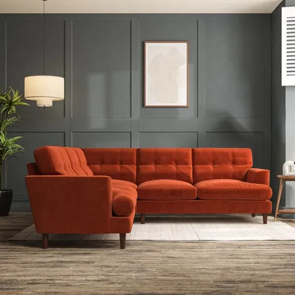 * Scandi inspired design* High legs* Button pull detailing* Right hand facing* Choose the cushion filling, leg colour and fabric The Cooper 5 Seater Corner Sofa combines spacious seating with Scandinavian-inspired sophistication. Perfect for larger living rooms, its high-leg design, clean lines, and T-shaped seat cushions create a modern and inviting aesthetic. The generously fibre-filled back cushions feature button-pull detailing, delivering exceptional comfort and support. Ideal for gatherings or family lounging, this sofa offers customisable options, including fabric type, leg finish, and cushion filling.