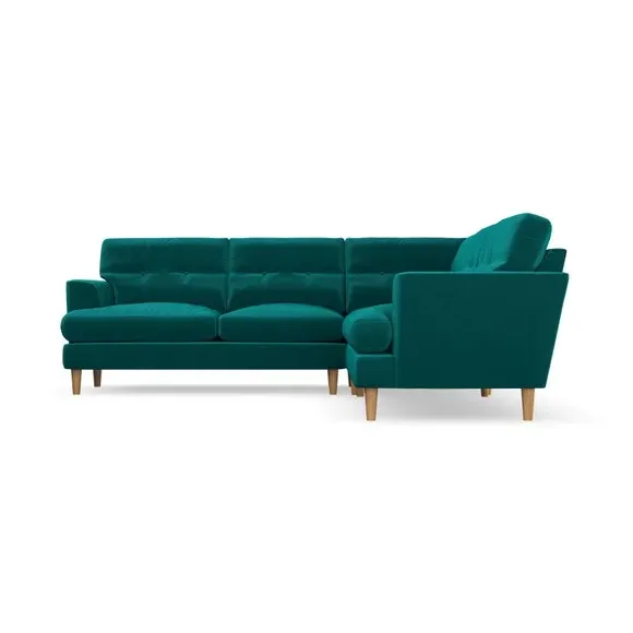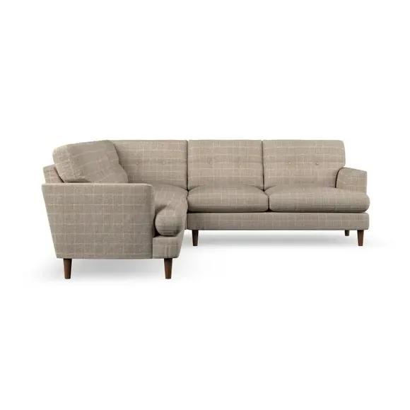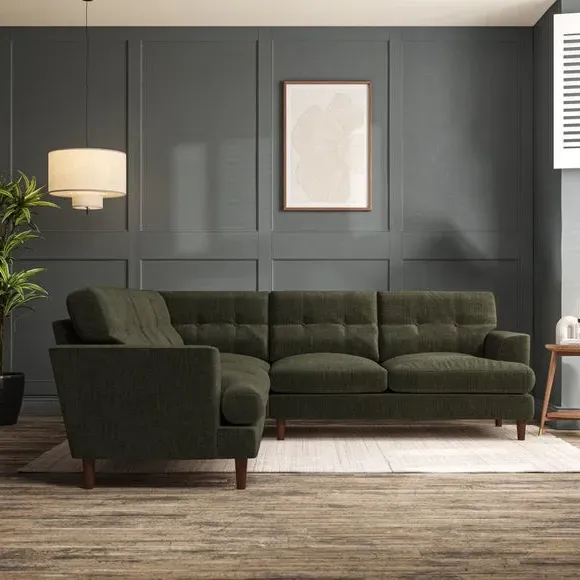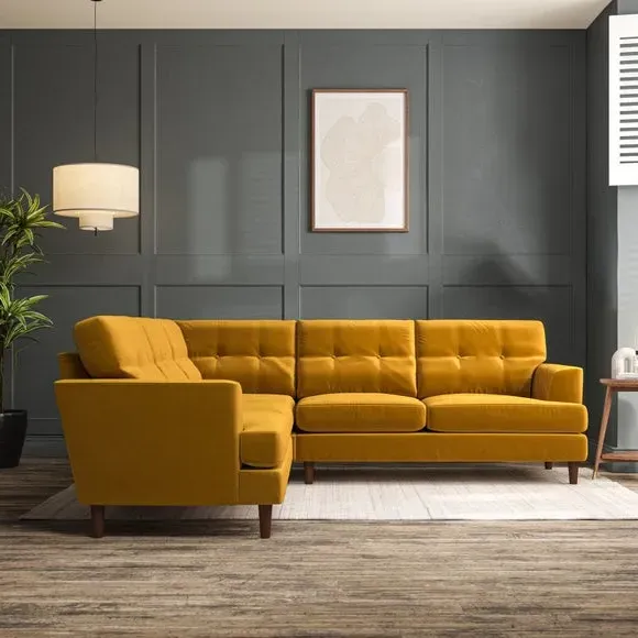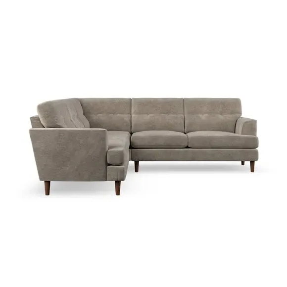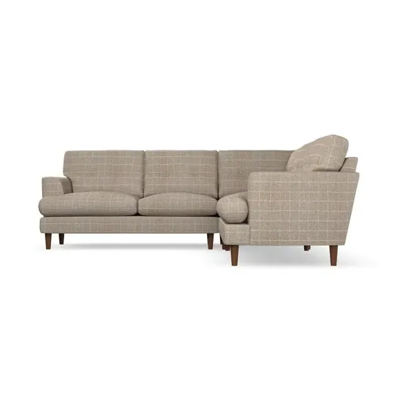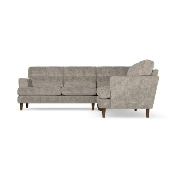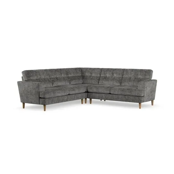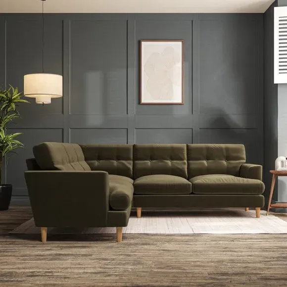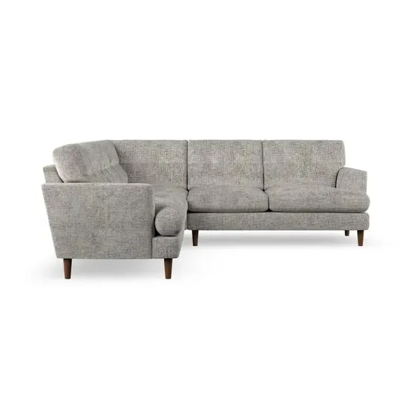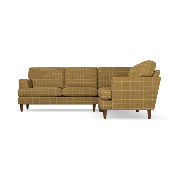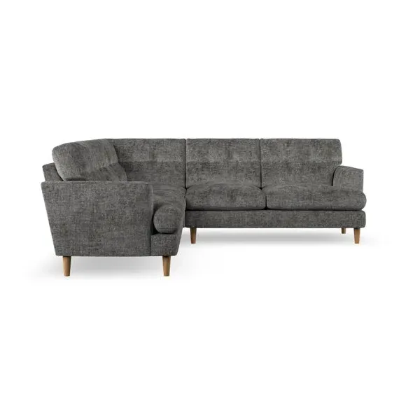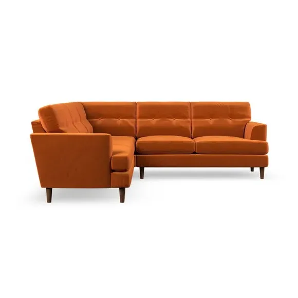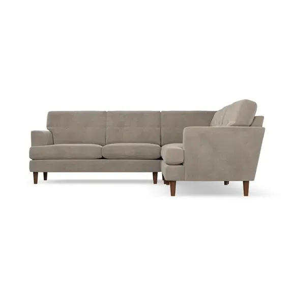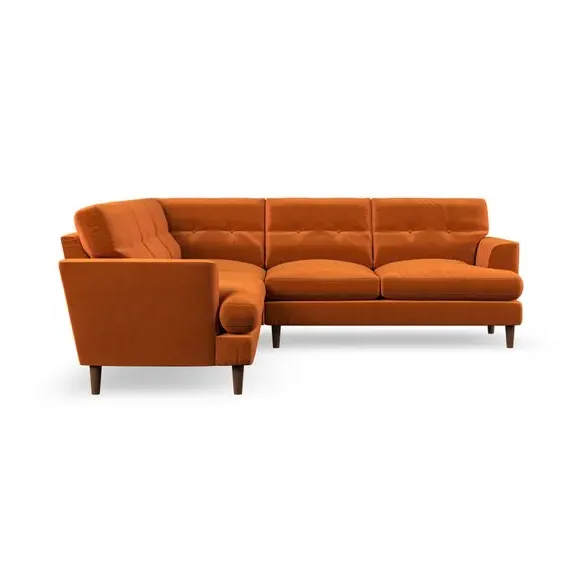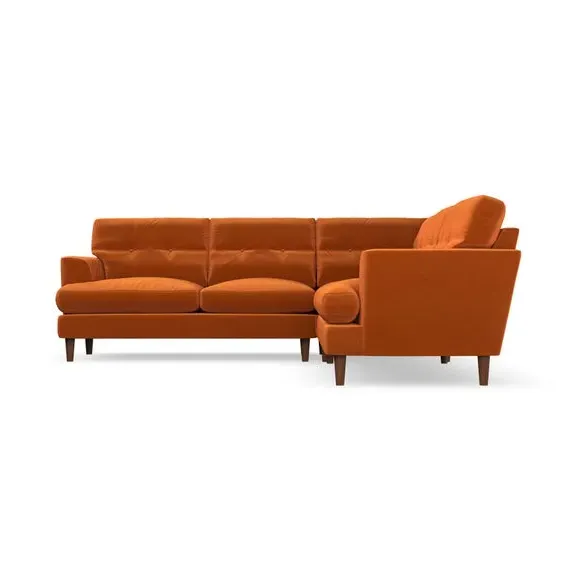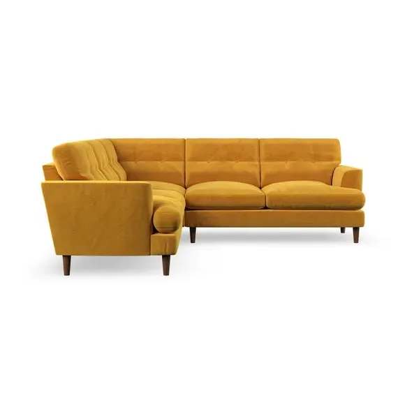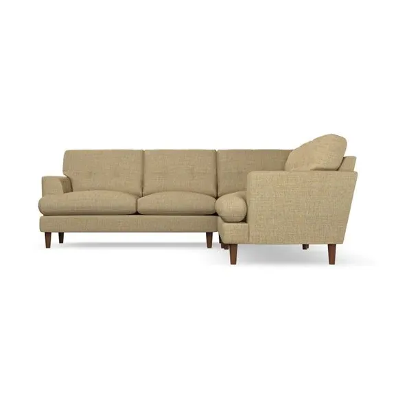 * Scandi inspired design* High legs* Button pull detailing* Right hand facing* Choose the cushion filling, leg colour and fabric The Cooper 5 Seater Corner Sofa combines spacious seating with Scandinavian-inspired sophistication. Perfect for larger living rooms, its high-leg design, clean lines, and T-shaped seat cushions create a modern and inviting aesthetic. The generously fibre-filled back cushions feature button-pull detailing, delivering exceptional comfort and support. Ideal for gatherings or family lounging, this sofa offers customisable options, including fabric type, leg finish, and cushion filling.