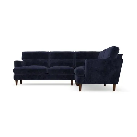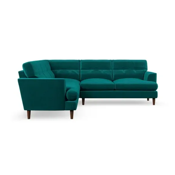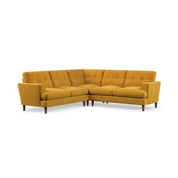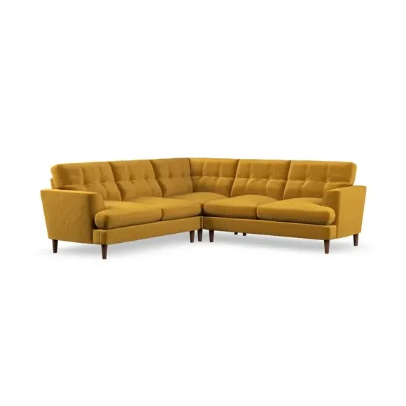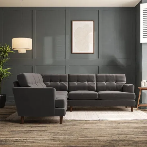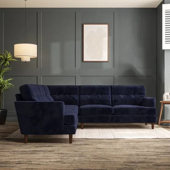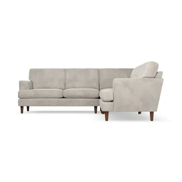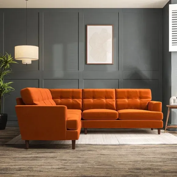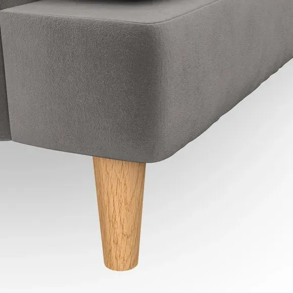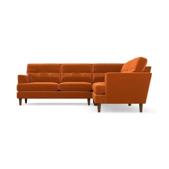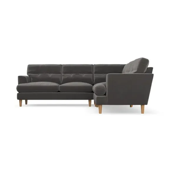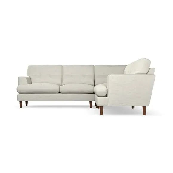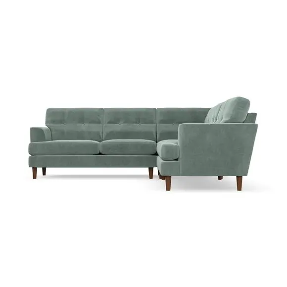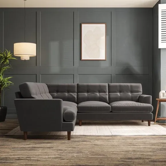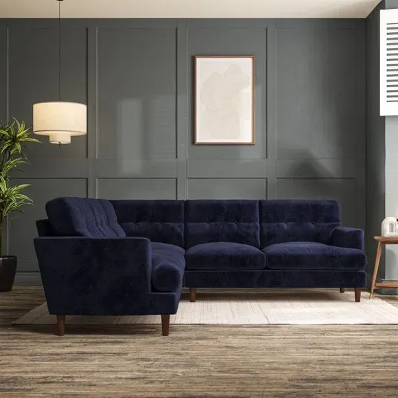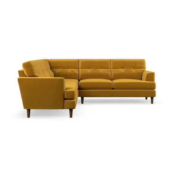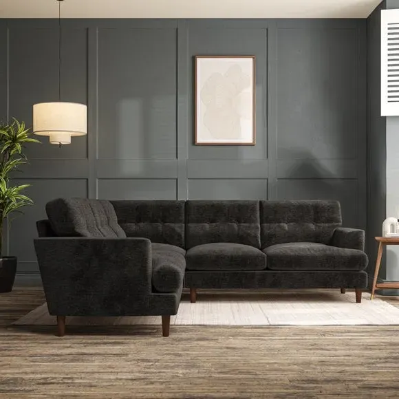 * Scandi inspired design* High legs* Button pull detailing* Right hand facing* Choose the cushion filling, leg colour and fabric The Cooper 5 Seater Corner Sofa combines spacious seating with Scandinavian-inspired sophistication. Perfect for larger living rooms, its high-leg design, clean lines, and T-shaped seat cushions create a modern and inviting aesthetic. The generously fibre-filled back cushions feature button-pull detailing, delivering exceptional comfort and support. Ideal for gatherings or family lounging, this sofa offers customisable options, including fabric type, leg finish, and cushion filling.