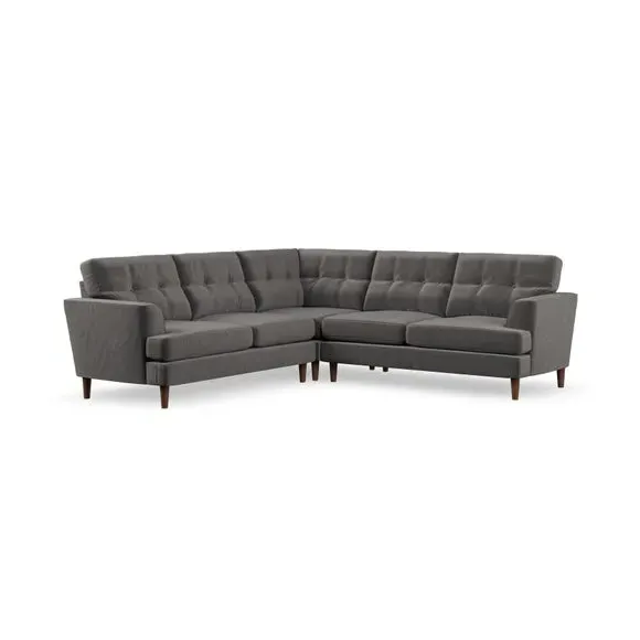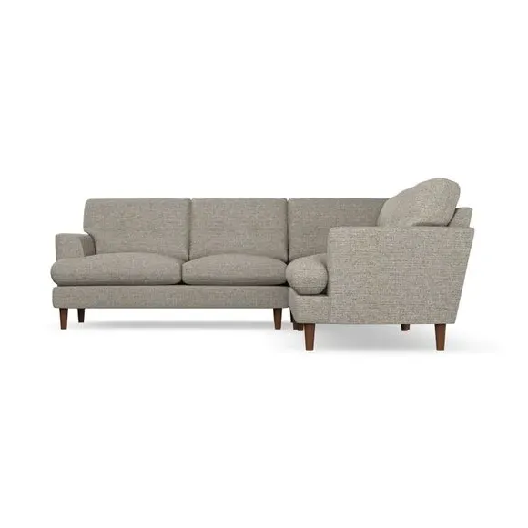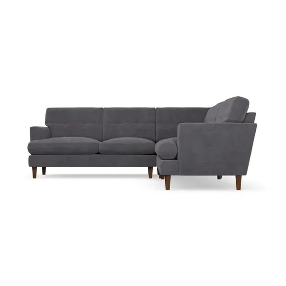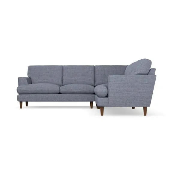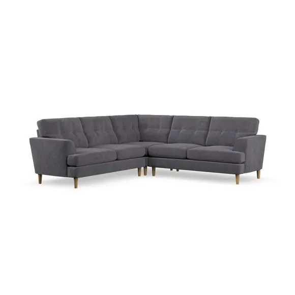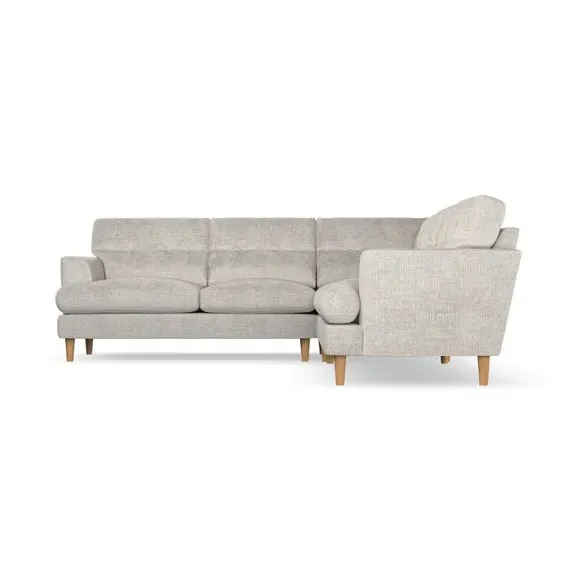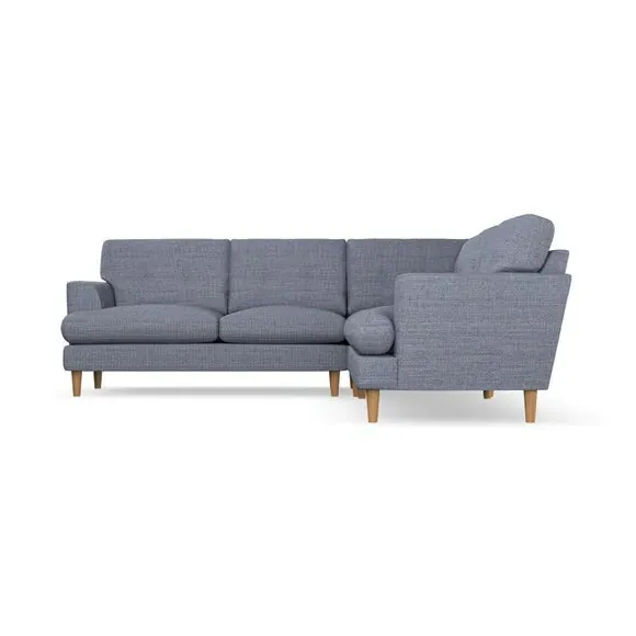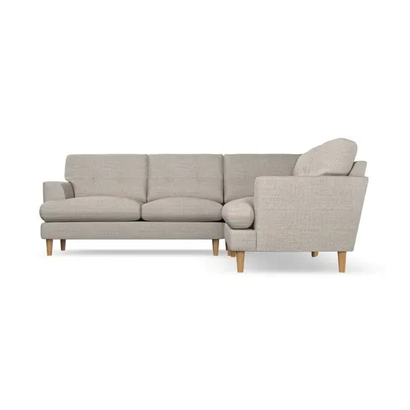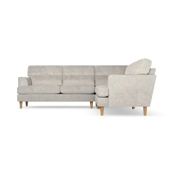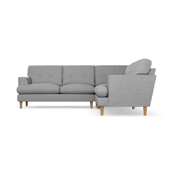 The corner sofa combines spacious seating with Scandinavian-inspired design, featuring high legs and clean lines that create a modern aesthetic. Its T-shaped seat cushions provide generous comfort, while the fibre-filled back cushions include button-pull detailing for added support. The elevated leg design adds visual lightness to the frame, and the right-hand facing configuration suits various room layouts.