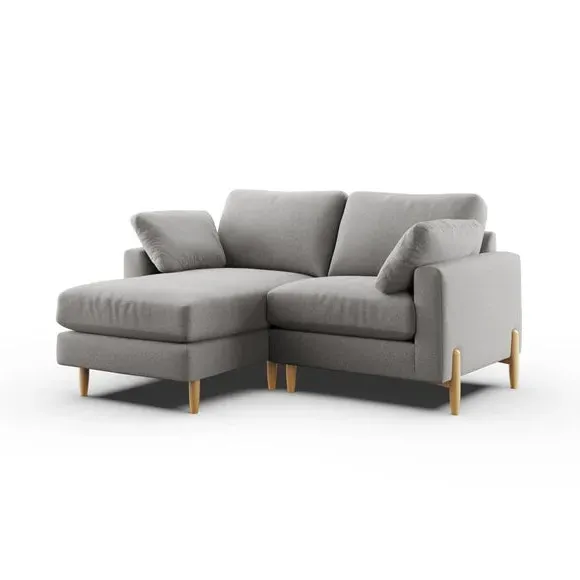 The corner chaise sofa combines modern aesthetics with its wooden legs and square arm design. Its foam and fibre filled cushions deliver optimal comfort, while the soft texture fabric construction adds lasting appeal. The chaise extension suits various seating needs, and the wooden base provides reliable stability.