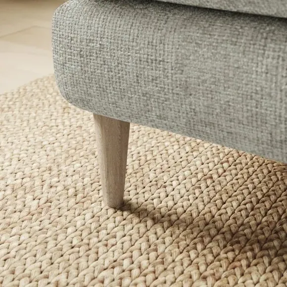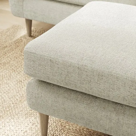 The footstool combines comfort with textured chenille upholstery, featuring foam-filled cushioning for optimal support. Its robust fabric construction uses 100% recycled polyester, while the wooden legs provide stable foundation. The chunky chenille texture adds tactile appeal and durability for everyday use.