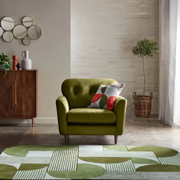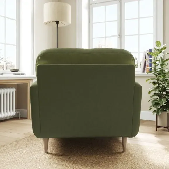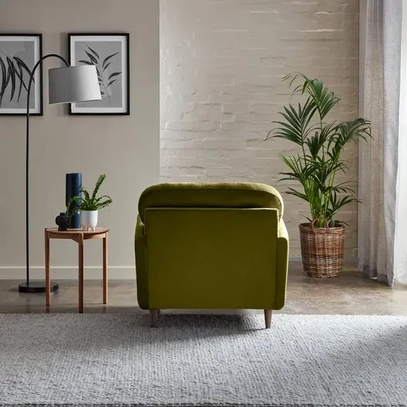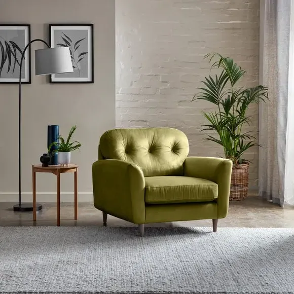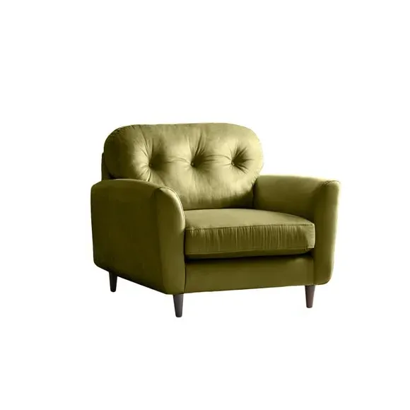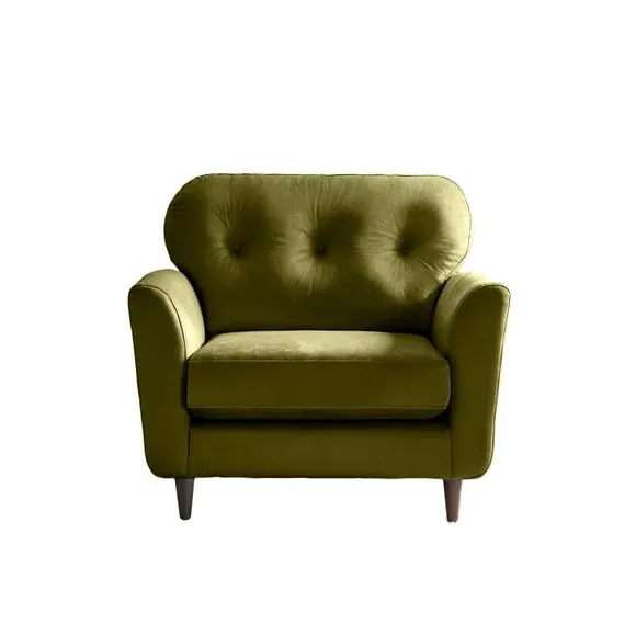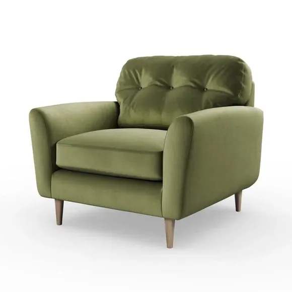 * 100% recycled polyester* Soft touch velvet upholstery* Buttoned back cushions* Comfortable foam and fibre-wrap seat* Compact design A compact snuggle chair with a modern buttoned back and soft touch velvet upholstery, this chair is made from 100% recycled polyester to ensure a low carbon footprint. Comfortable foam and fibre-wrap seat cushions allow you to relax for hours on end.