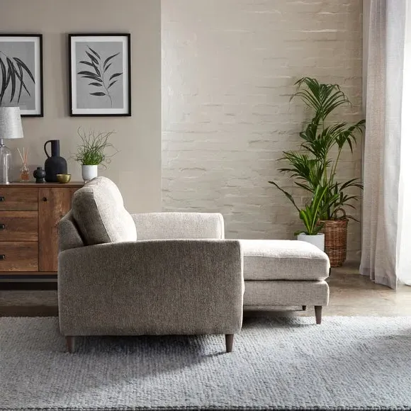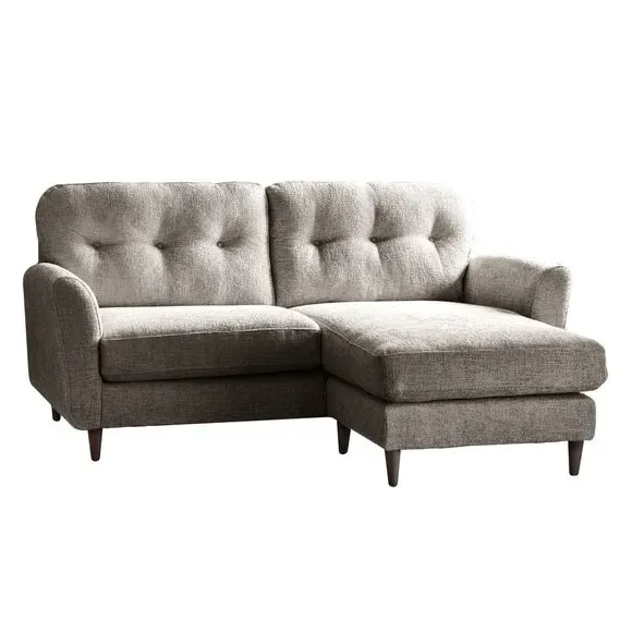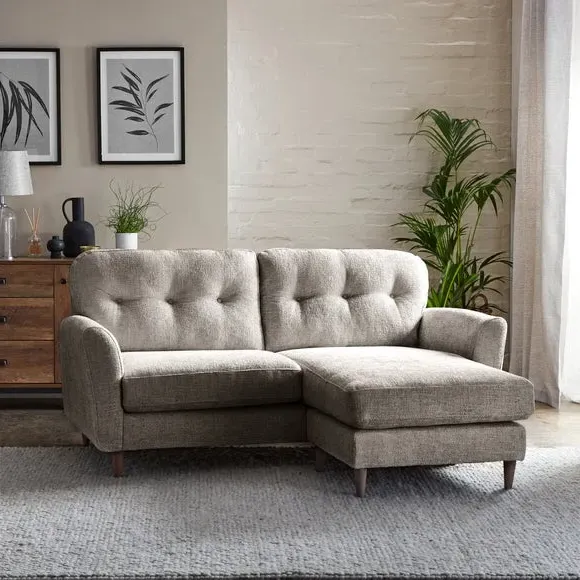 The corner chaise sofa combines chunky chenille upholstery with a reversible design that adapts to any space configuration. Its buttoned back cushions provide comfortable support, while the foam and fibre-wrap seat construction ensures lasting comfort. The universal chaise cushion easily switches between left and right-hand facing positions, and the compact frame suits smaller living areas without compromising on style.