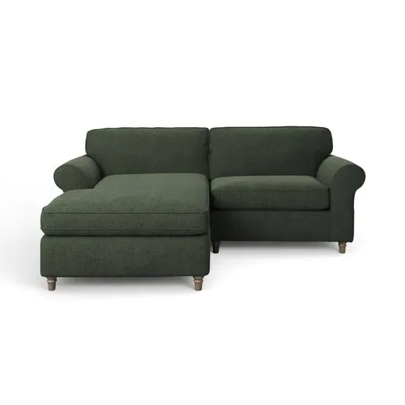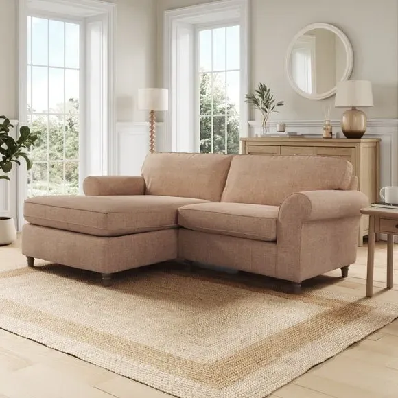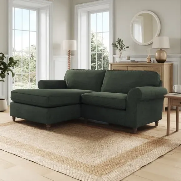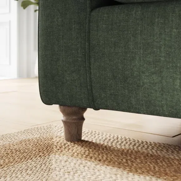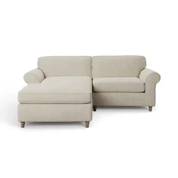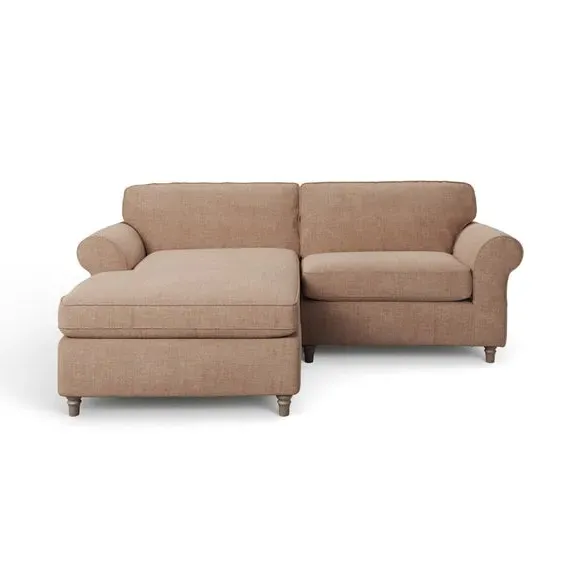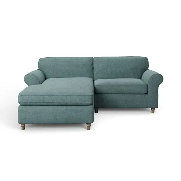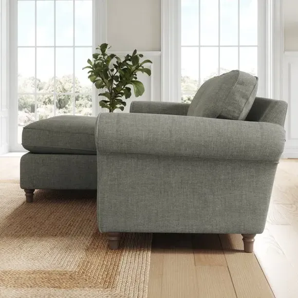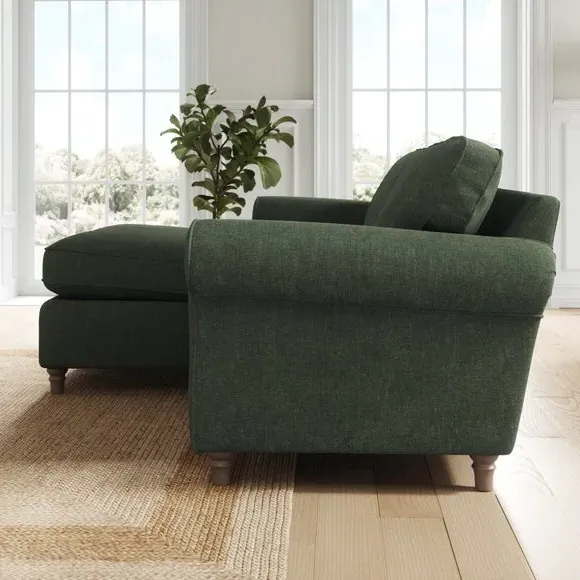 The corner chaise sofa combines classic styling with its gracefully curved arms and turned wooden feet. Its plush chenille upholstery features piped edge detailing, while the foam and fibre filled cushions provide luxurious comfort and support. The turned wooden base adds timeless appeal, and the fibre-filled seat cushions require daily plumping to maintain their shape and prevent flattening.