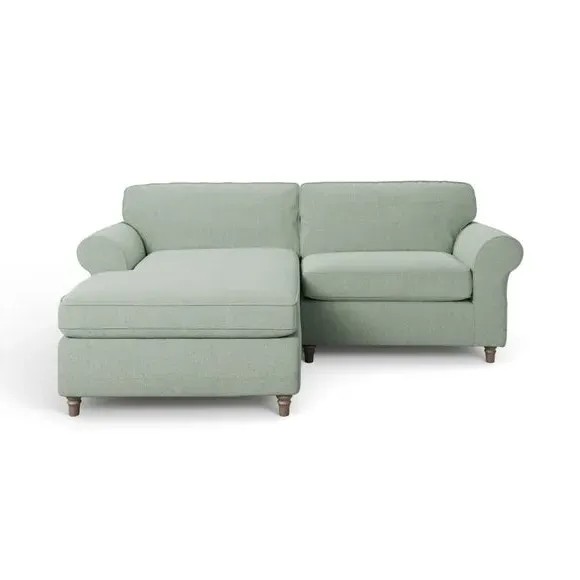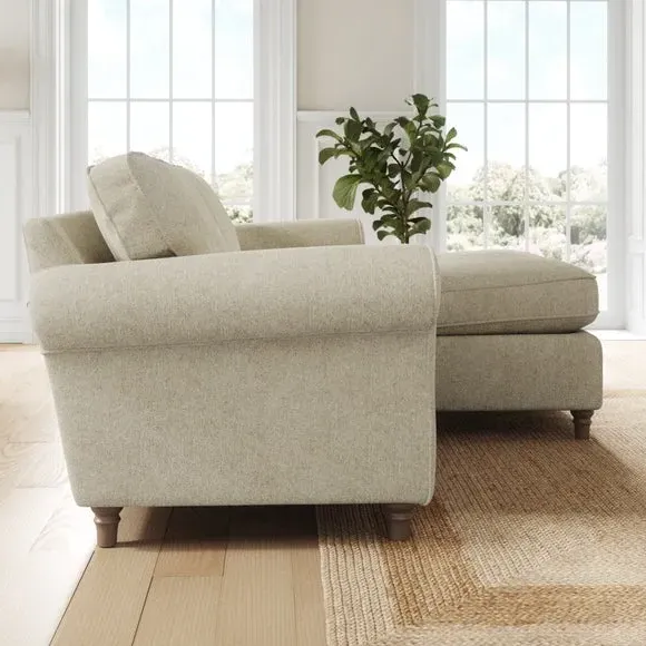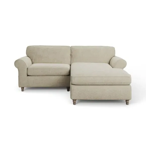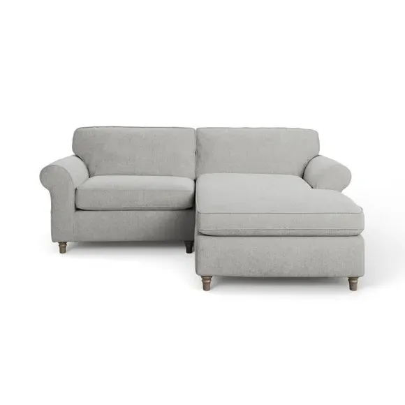 * Classic Shape* Curved arms* Foam and Fibre filled* Turned wooden feet Crafted with gracefully scrolled arms and elegantly turned wooden feet, the Flori sofa range presents a timeless style that effortlessly elevates any room. Available in a selection of colour palettes, this corner chaise sofa boasts upholstery in soft chenille, accented with piped edge detailing for a sophisticated touch. Enhanced with brand-new foam seat and back cushions, it promises luxurious comfort alongside its exquisite design. This product has fibre filled seat cushions. This means they require vigorous plumped by shaking and redistributing the fibres daily. This will add air back into the fibres and preventing clumping, flattening and the seat dipping.