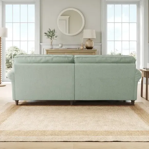 The corner chaise sofa combines classic styling with its gracefully scrolled arms and turned wooden feet. Its soft chenille upholstery features piped edge detailing, while the foam and fibre filled cushions provide luxurious comfort. The fibre filled seat cushions require daily plumping to maintain their shape and prevent flattening.