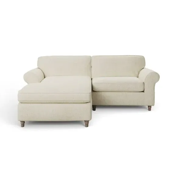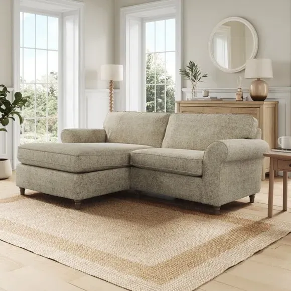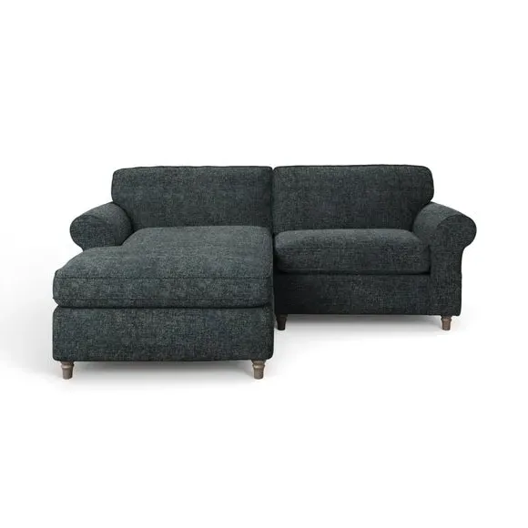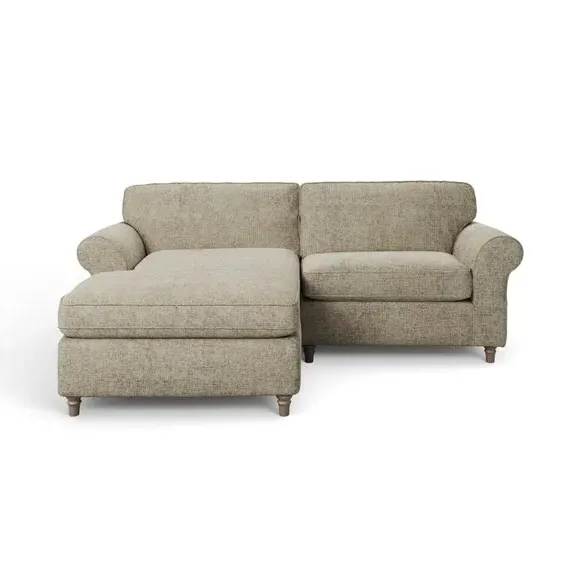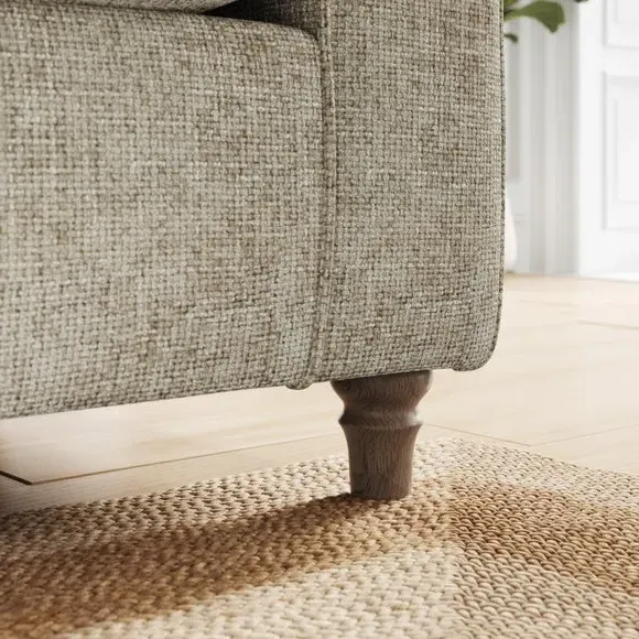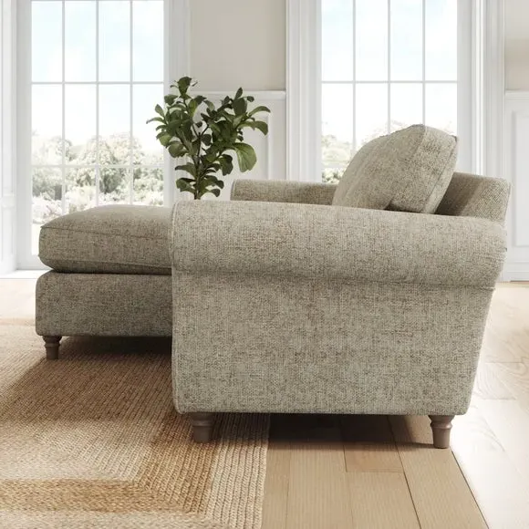 The corner chaise sofa combines classic design with its gracefully curved arms and turned wooden feet. Its chunky chenille upholstery features elegant piping detail, while the foam and fibre filled cushions provide superior comfort and support. The robust wooden base ensures lasting durability, and the fibre filled seat cushions require daily plumping to maintain their shape and prevent flattening.