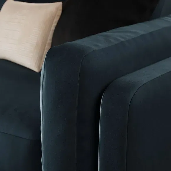 The corner chaise sofa features plush foam filling wrapped in buttery soft velvet for exceptional comfort. Its flexible left or right configuration suits different room layouts, while the matte velvet upholstery adds tactile luxury. Crafted to order with attention to detail, the sofa combines practical functionality with enduring style.