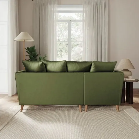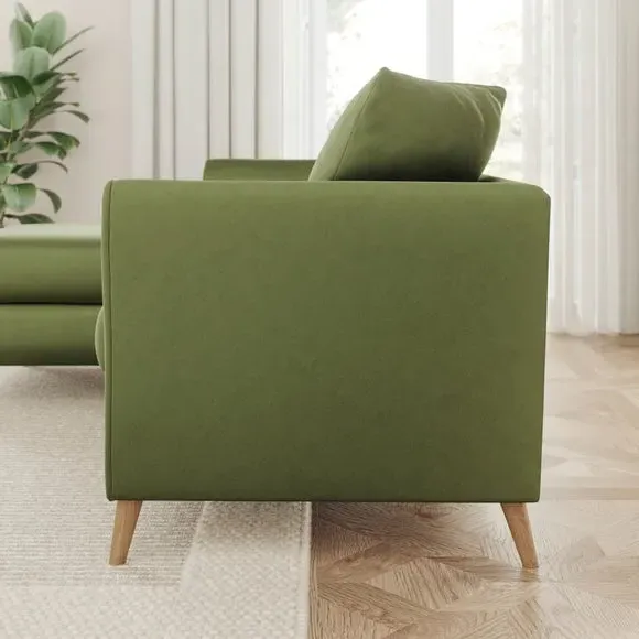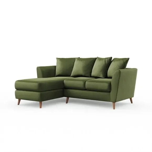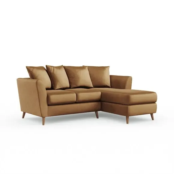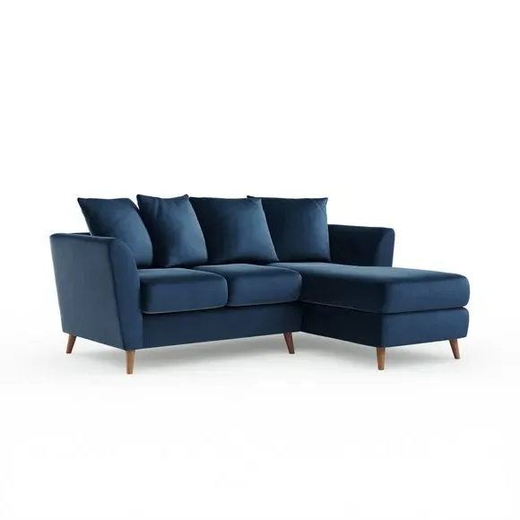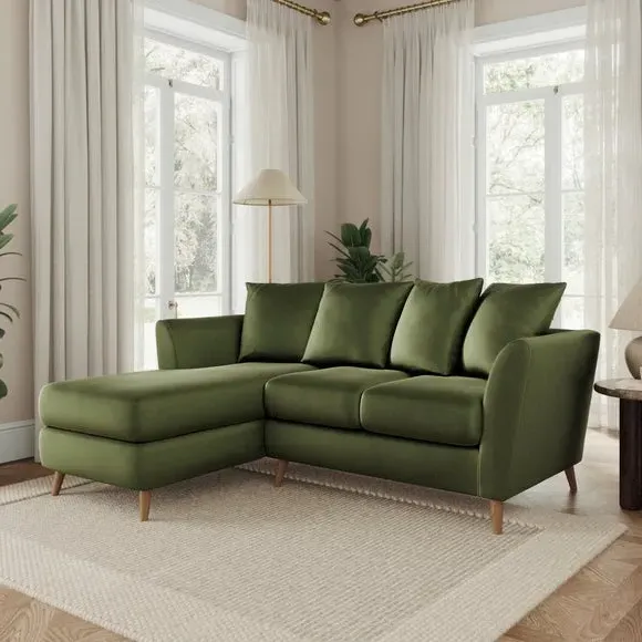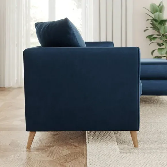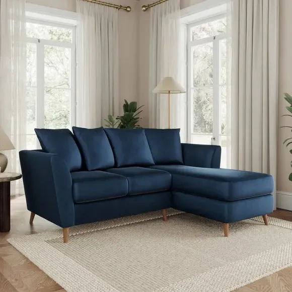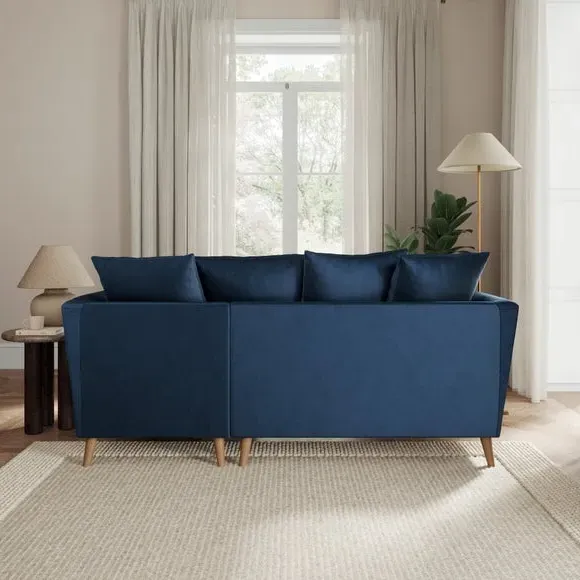 The corner chaise sofa combines contemporary design with luxurious comfort, featuring soft velvet upholstery and flared arms. Its foam-filled seats provide plush support, while the scatter back cushions add cosy relaxation. The chaise configuration offers versatile seating options with left or right-hand positioning to suit your space.