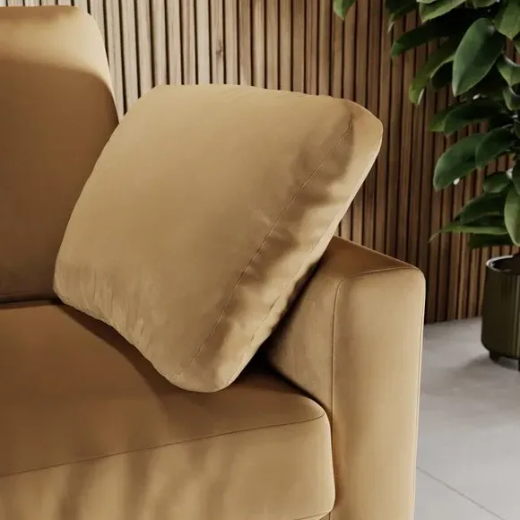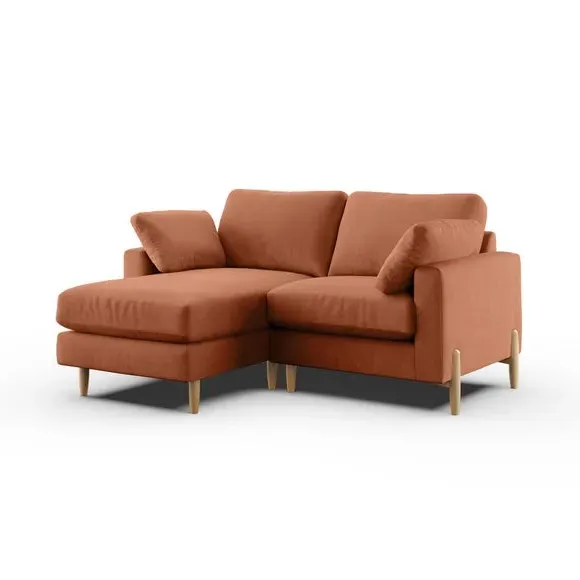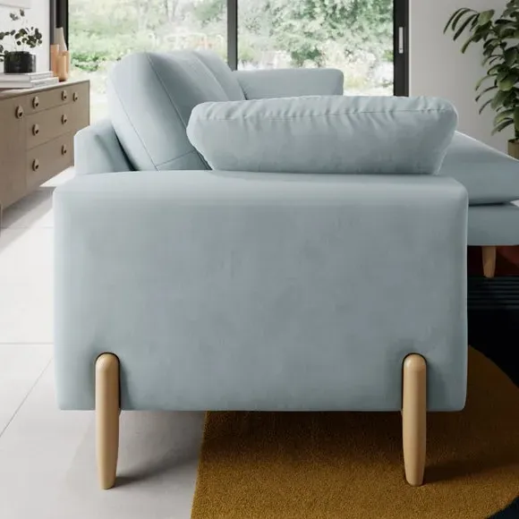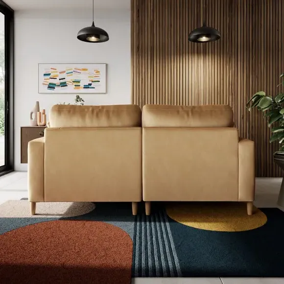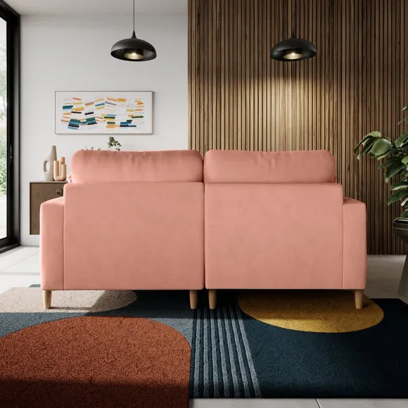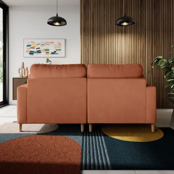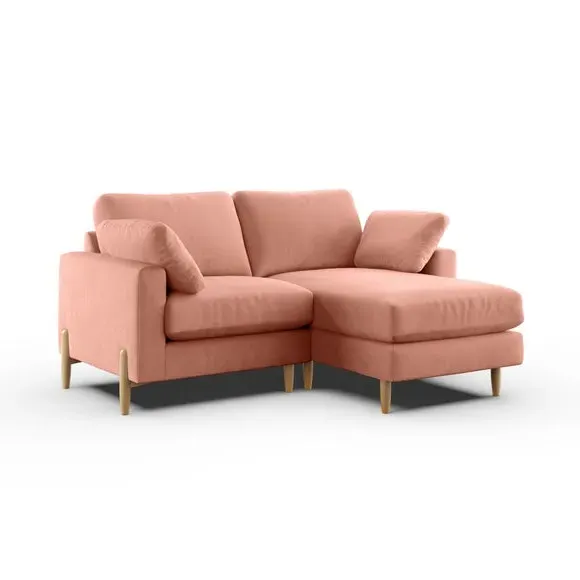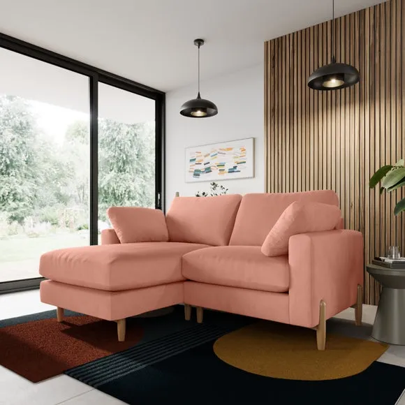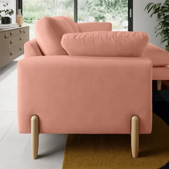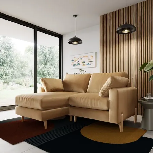 The corner chaise sofa features plush velvet upholstery in a sophisticated warm sand shade with Scandinavian-inspired styling. Its foam and fibre filled cushions deliver superior comfort, while the square arms create clean lines. The wooden legs provide reliable support and add natural warmth to the contemporary design.