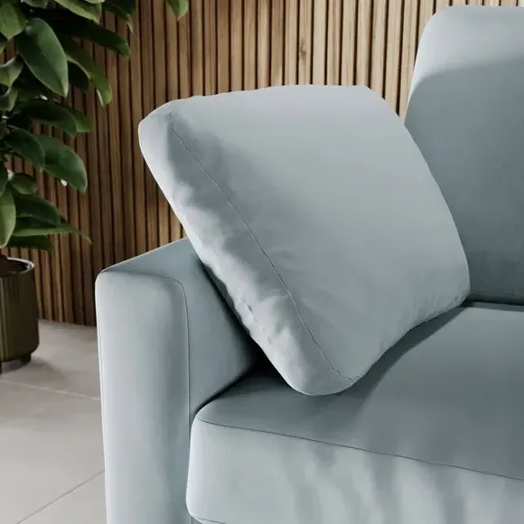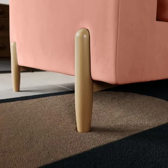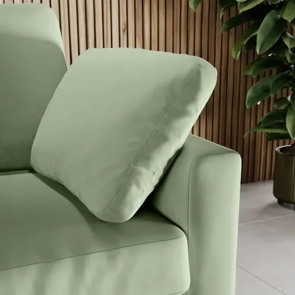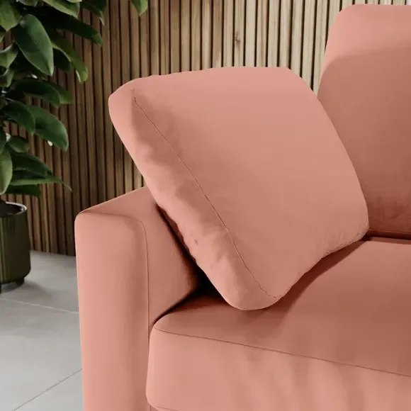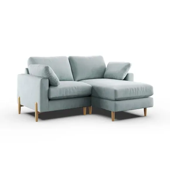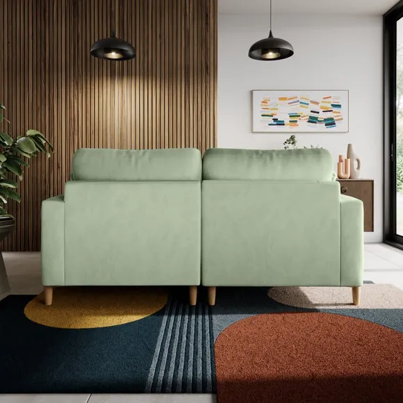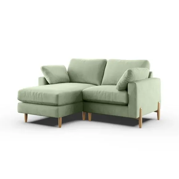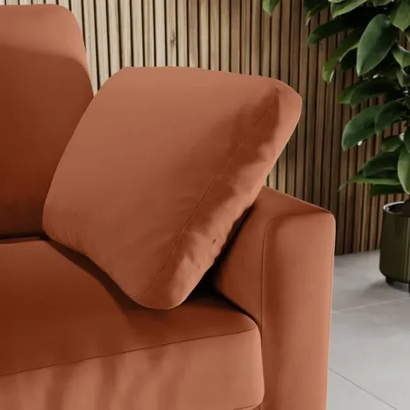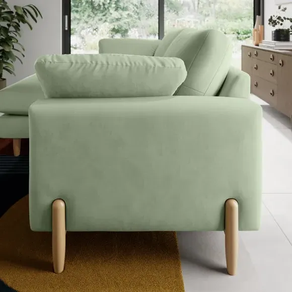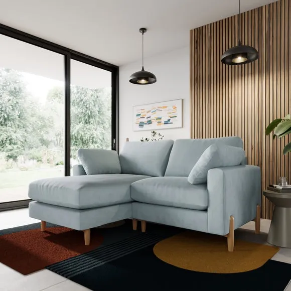 The corner chaise sofa features plush velvet upholstery in a sophisticated warm sand shade with Scandinavian-inspired styling. Its foam and fibre filled cushions deliver superior comfort, while the square arms create clean lines. The wooden legs provide reliable support and add natural warmth to the contemporary design.