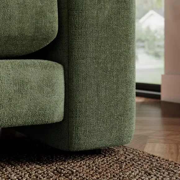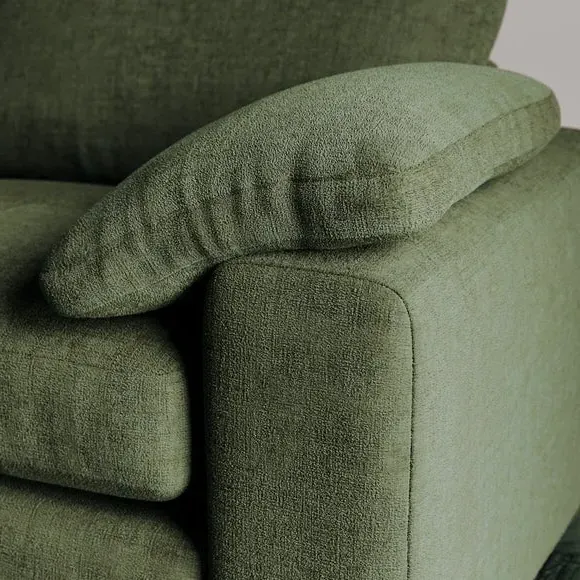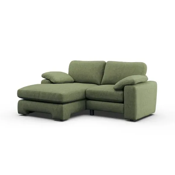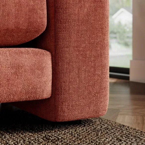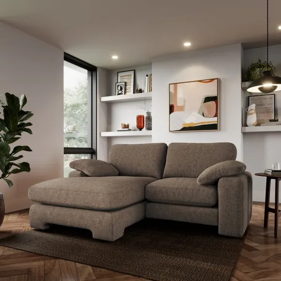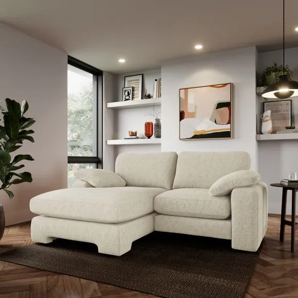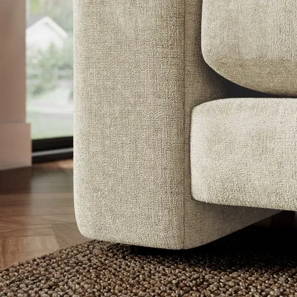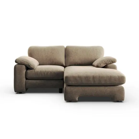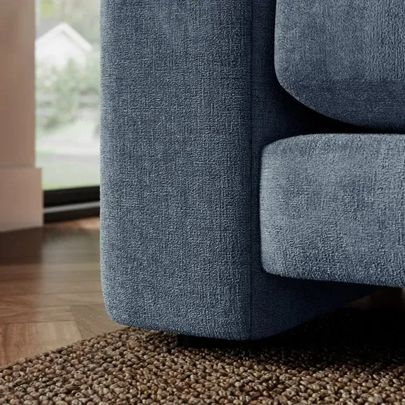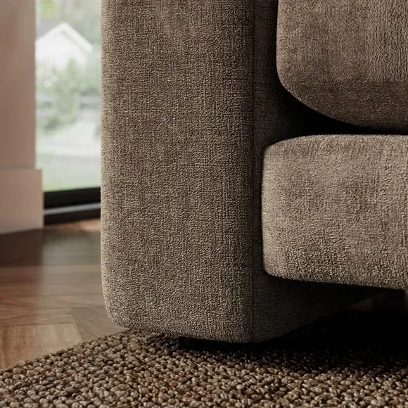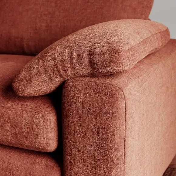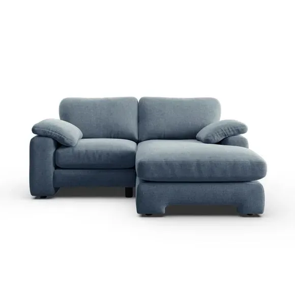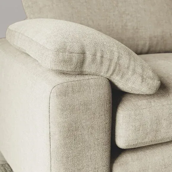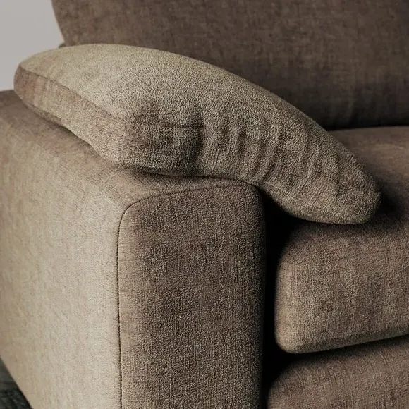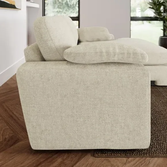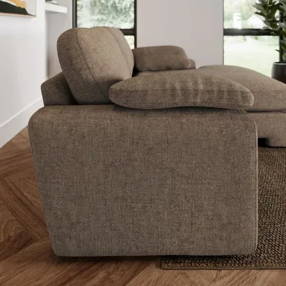 The corner chaise sofa offers luxury with its feather-filled arms and foam-filled seat cushions. Its reversible cushions provide versatility, while the textured chenille upholstery adds durability and comfort. The spacious chaise section suits extended relaxation, and the wooden legs ensure reliable stability.