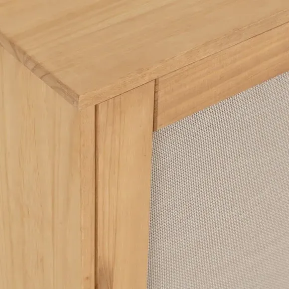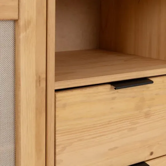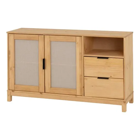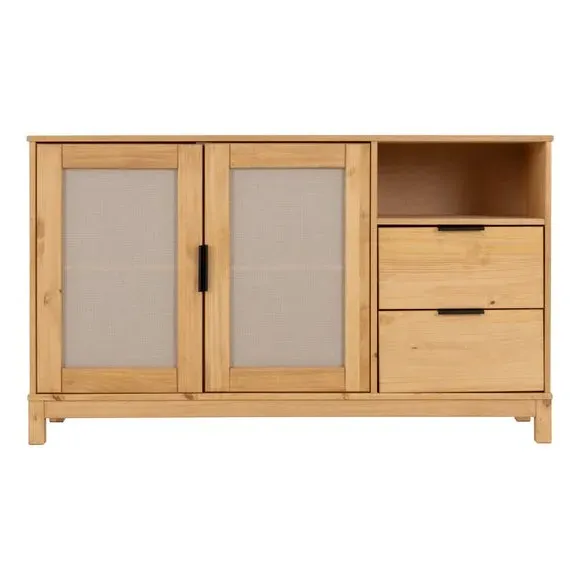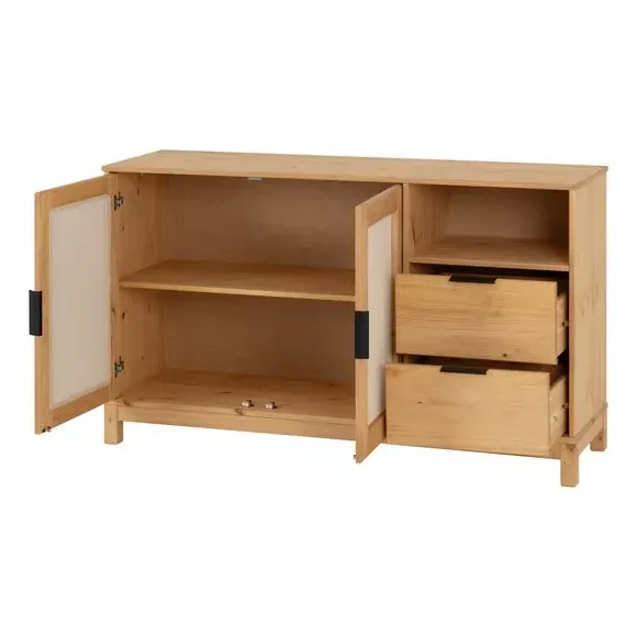 * Rustic Design* Rattan Drawer Fronts* Black Metal Hardware Crafted with a captivating rattan style and finished in beautifully distressed waxed pine, this sideboard exudes rustic elegance. Its ample storage space makes it not only a stylish addition to your decor but also a practical solution for keeping your belongings organized. Enhanced with black metal hardware, this piece strikes a perfect balance between classic and contemporary design.