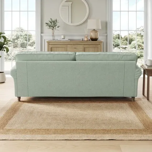 The sofa combines classic styling with its gracefully scrolled arms and turned wooden feet. Its soft chenille upholstery features piped edge detailing, while the foam and fibre filled cushions provide luxurious comfort. The fibre filled seat cushions require daily plumping to maintain their shape and prevent flattening, and the wooden base adds traditional charm to the design.