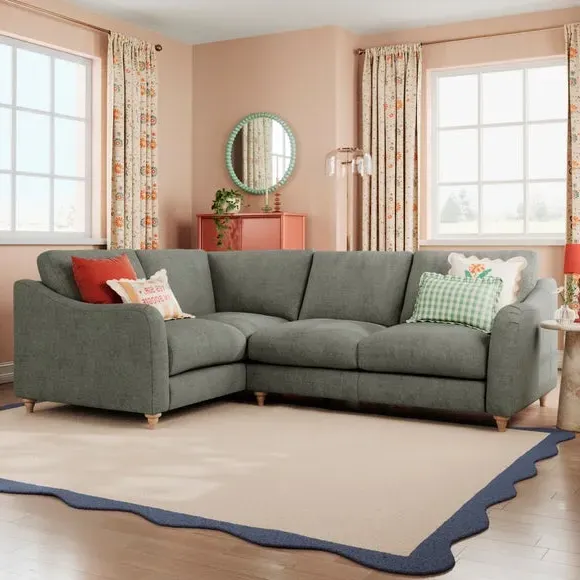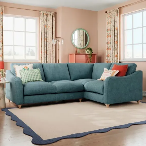 The corner sofa combines contemporary styling with curved arms and extra pleat detailing for visual appeal. Its fibre-filled seat cushions provide deep comfort, while the tonal plush chenille upholstery adds softness and texture. The chaise section offers extended lounging space, and the reversible configuration allows left or right-hand facing placement to suit your layout.