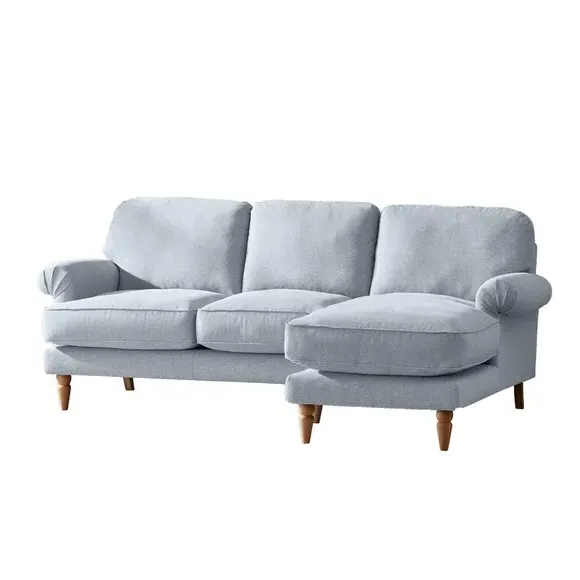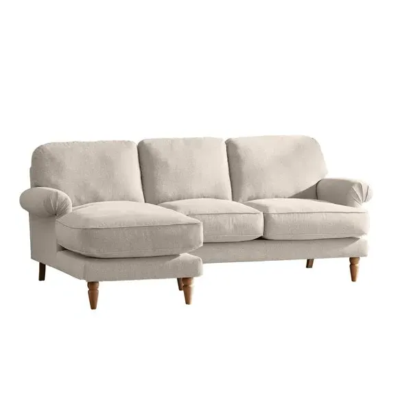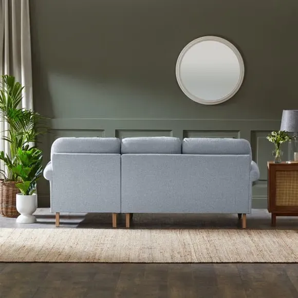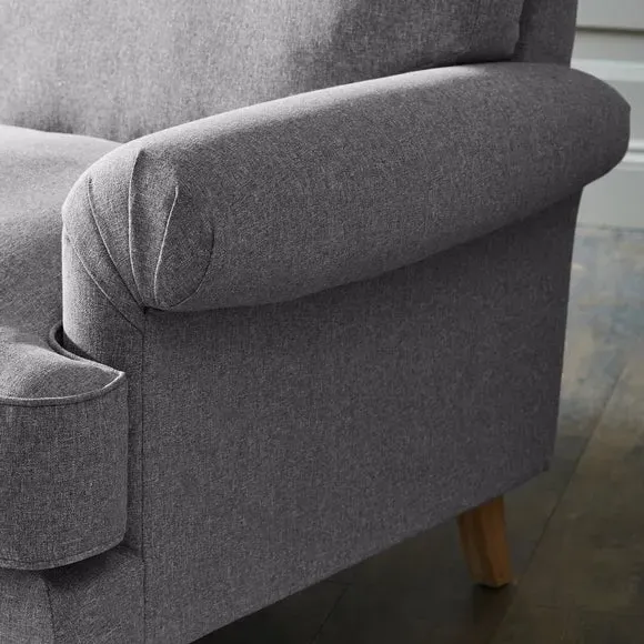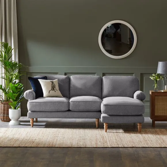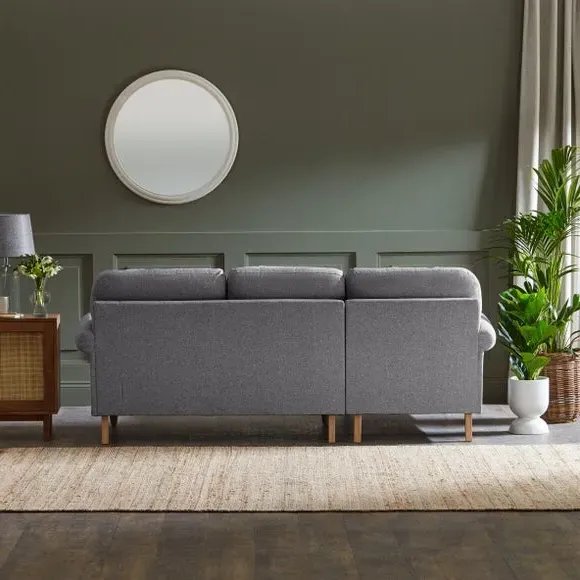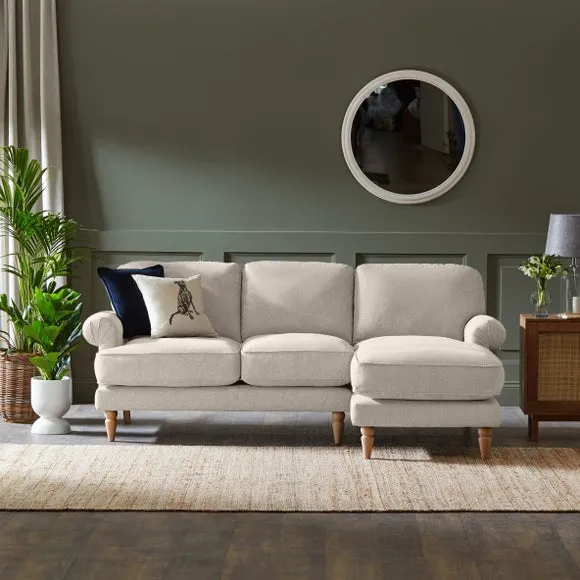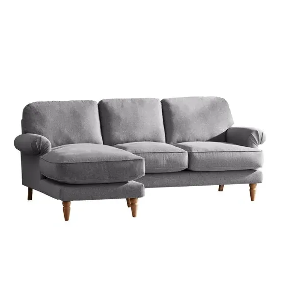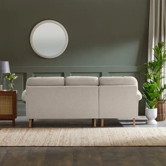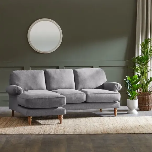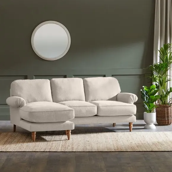 The corner chaise sofa combines comfort with its soft texture fabric upholstery, featuring scroll arms and pleated front detailing. Its fibre seat and back cushions provide supportive seating, while the solid oak wooden feet add durability and natural warmth. The chaise configuration offers extended lounging space with both left and right-hand facing options available.