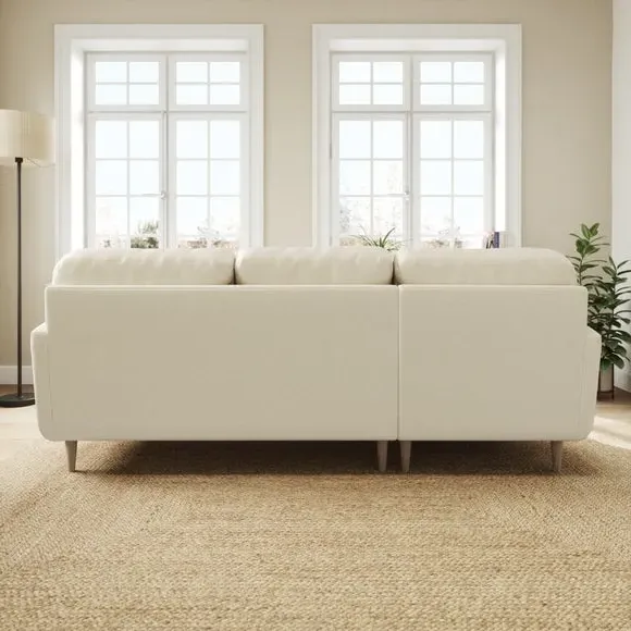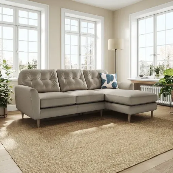 The corner chaise sofa combines generous seating with extended lounging space in its L-shaped design. Its soft velvet upholstery features buttoned back cushions, while the foam-filled seats provide comfortable support. The wooden legs add stability and style, and the chaise extension offers extra legroom for relaxation.