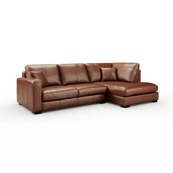 The corner chaise sofa combines generous seating space with luxurious comfort, featuring 100% real leather upholstery with piped edge detailing. Its foam-filled seat cushions provide firm support, while fibre-filled back cushions add plush comfort for extended relaxation. The frosted birch feet complement the vintage leather finish, and the reversible design accommodates both left and right-facing configurations.