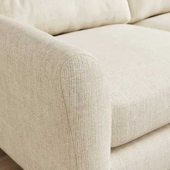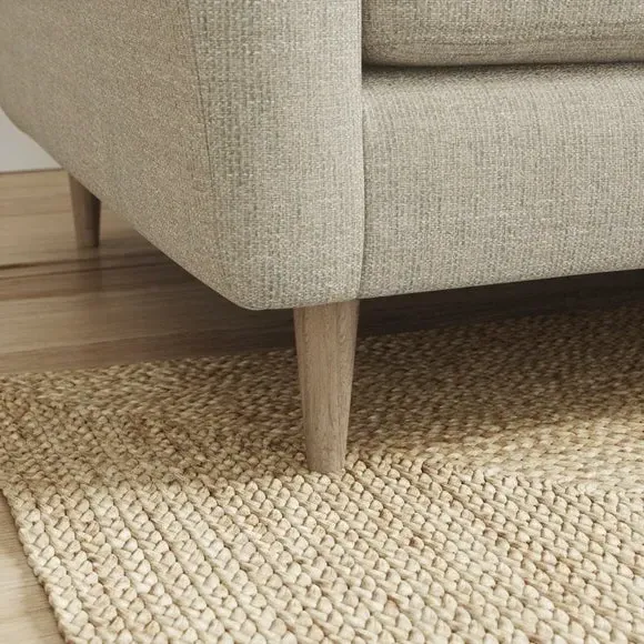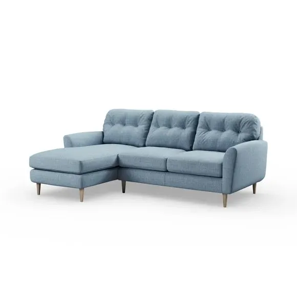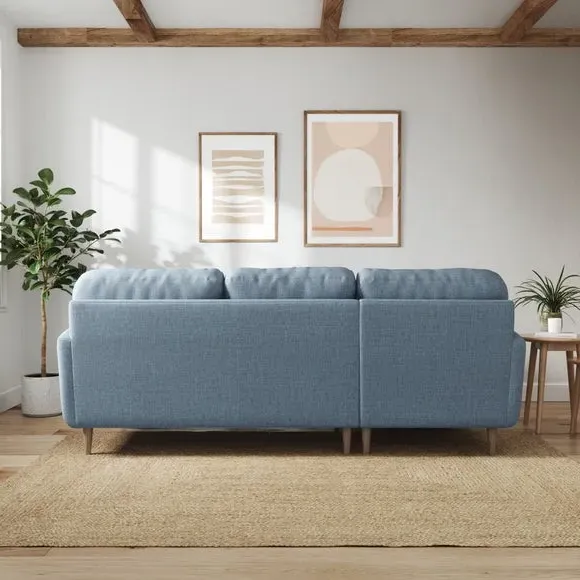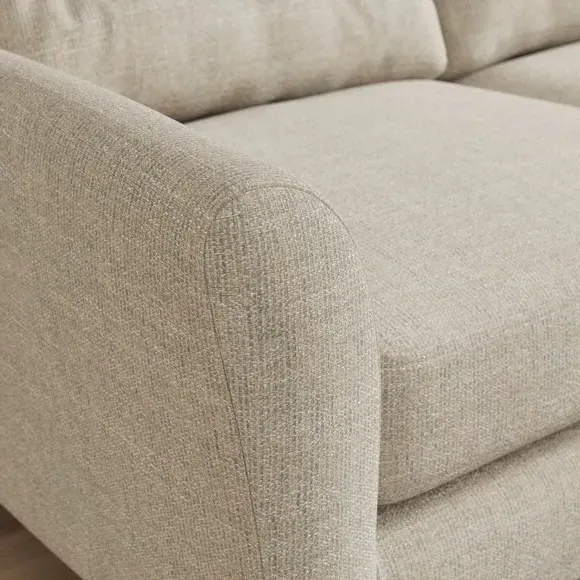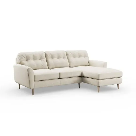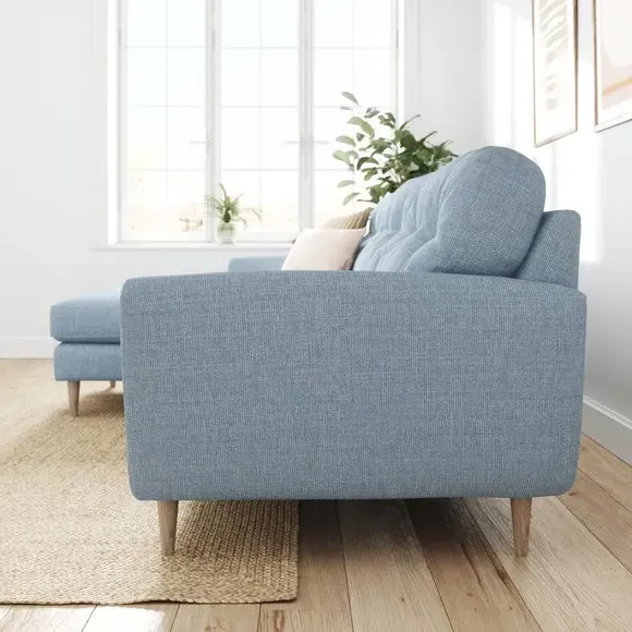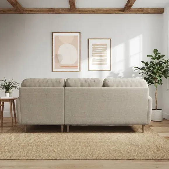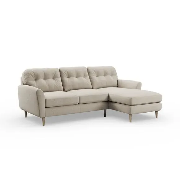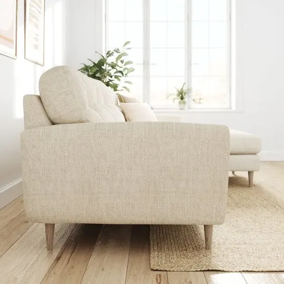 * 100% recycled polyester* Soft woven fabric* Buttoned back cushions* Wooden legs* Comfortable foam filled seat* Right or Left hand facing options This stunning piece combines grandeur with comfort, featuring a textured fabric in soft colours. Its generous proportions and corner design create the perfect spot for lounging, entertaining, or simply relaxing in style. The chaise extension adds extra legroom for those laid-back afternoons, while the sleek lines and sumptuous fabric bring an air of sophistication to your home.