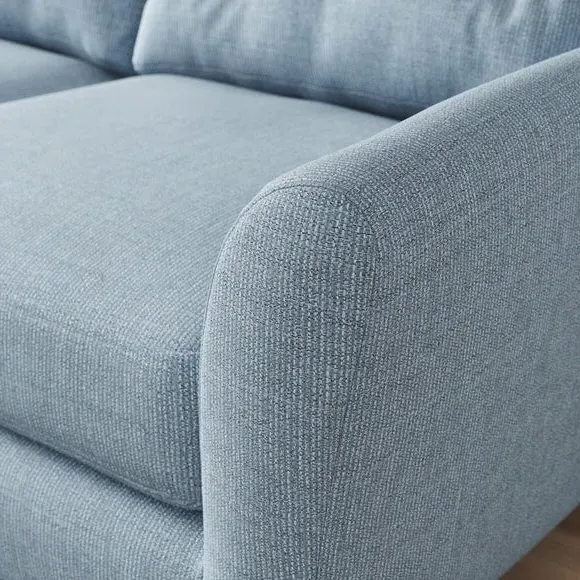 The corner chaise sofa combines generous proportions with comfort, featuring soft woven fabric made from 100% recycled polyester. Its foam-filled seat provides lasting support, while the buttoned back cushions add textural detail. The chaise extension offers extra legroom for relaxation, and the wooden legs ensure stable construction with natural appeal.