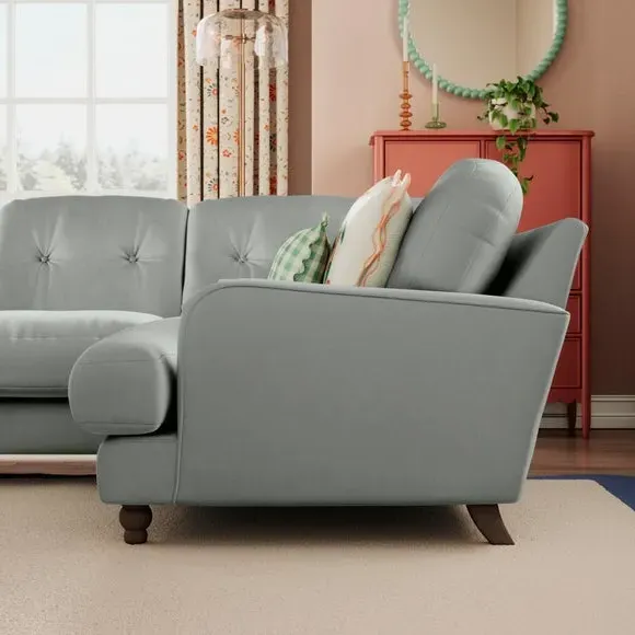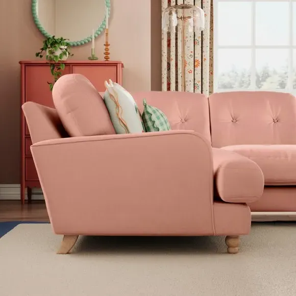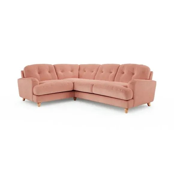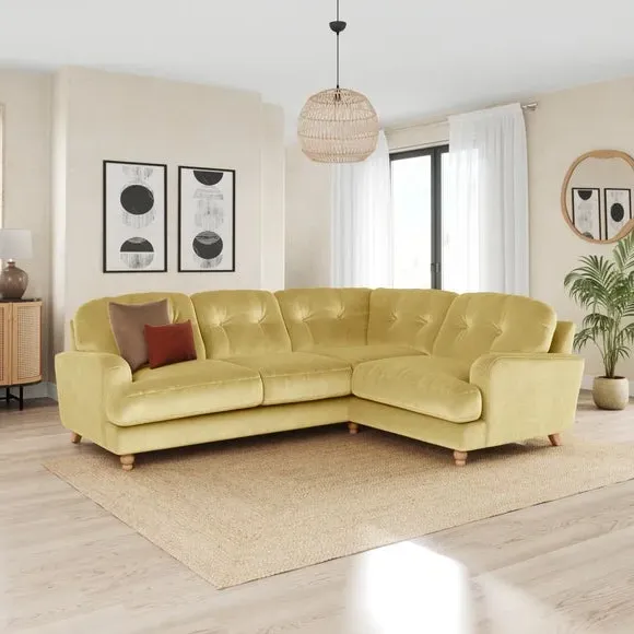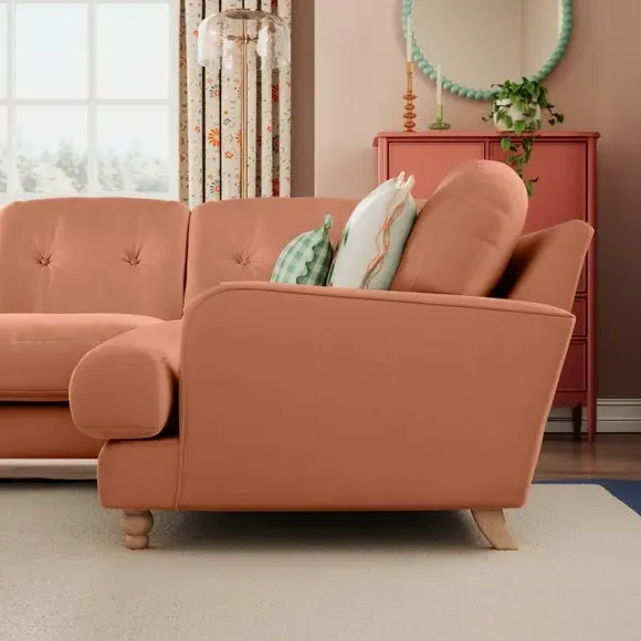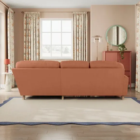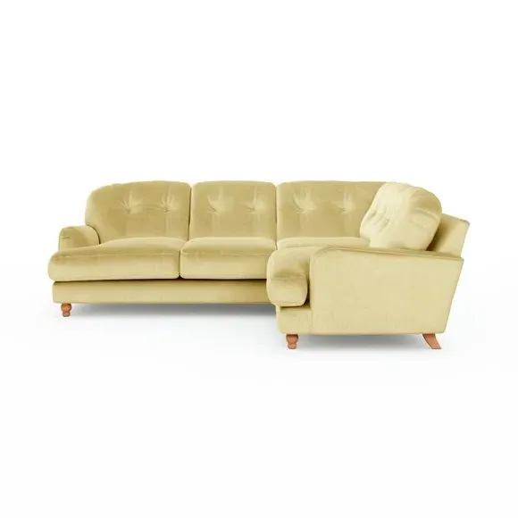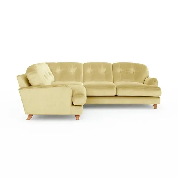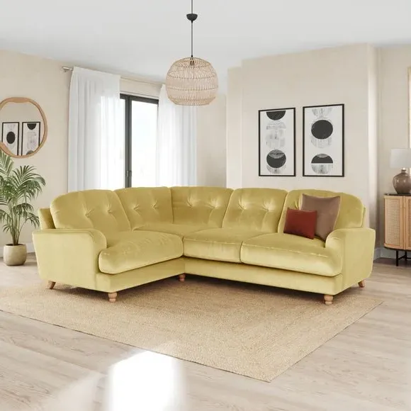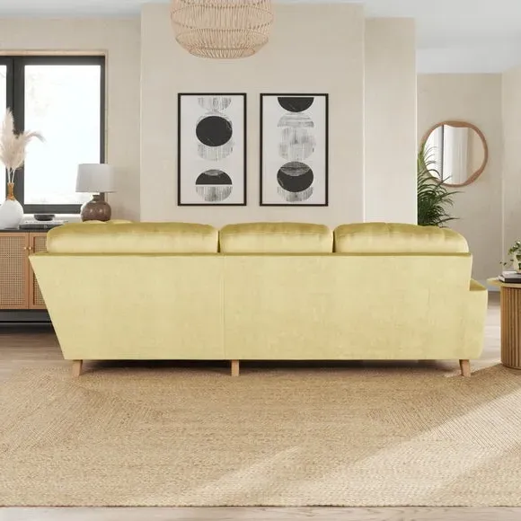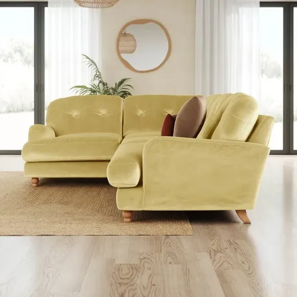 * Large Sofa* 4 Seater* Left or Right Hand facing options* Luxe Velvet upholstery Wrapped in luxurious vintage velvet, this sofa embodies understated opulence, inviting you to sink into its plush cushions and unwind in style. With its full corner design, it provides ample seating space for gatherings or moments of relaxation. The classic silhouette and rich texture add a touch of sophistication to any living space. This product has fibre filled seat cushions. This means they require vigorous plumped by shaking and redistributing the fibres daily. This will add air back into the fibres and preventing clumping, flattening and the seat dipping.