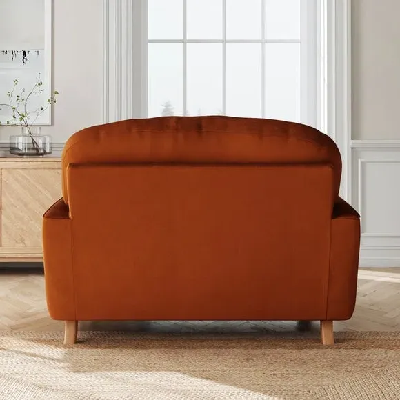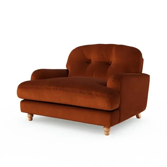 * Plush Velvet Upholstery* Cosy snuggle chair * Timeless, turned, wooden legs* Comfortable fibre-filled seating Crafted to cocoon you in comfort, this sumptuous sofa boasts a plush velvet exterior that radiates opulence from every angle. Sink into its deep, inviting cushions after a long day, and feel the stress of the world melt away as you indulge in unparalleled relaxation. With its matte finish adding a touch of understated elegance, this snuggle sofa effortlessly blends timeless charm with contemporary flair, making it a focal point in any living space. This product has fibre filled seat cushions. This means they require vigorous plumped by shaking and redistributing the fibres daily. This will add air back into the fibres and preventing clumping, flattening and the seat dipping.