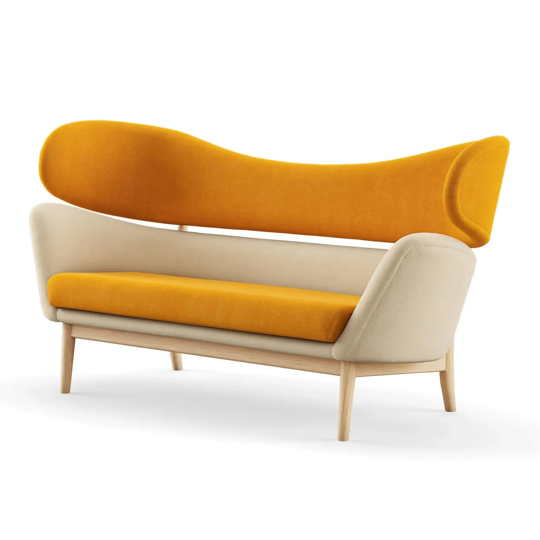 The Baker Sofa offers sculptural elegance with its distinctive two-piece backrest and hand-sewn upholstery. Its sturdy oak frame provides lasting durability, while the spring-loaded cushions deliver superior comfort and support. The upholstered body rests upon a light wooden construction that creates visual separation between elements, and the textile finish adds refined texture to any space.