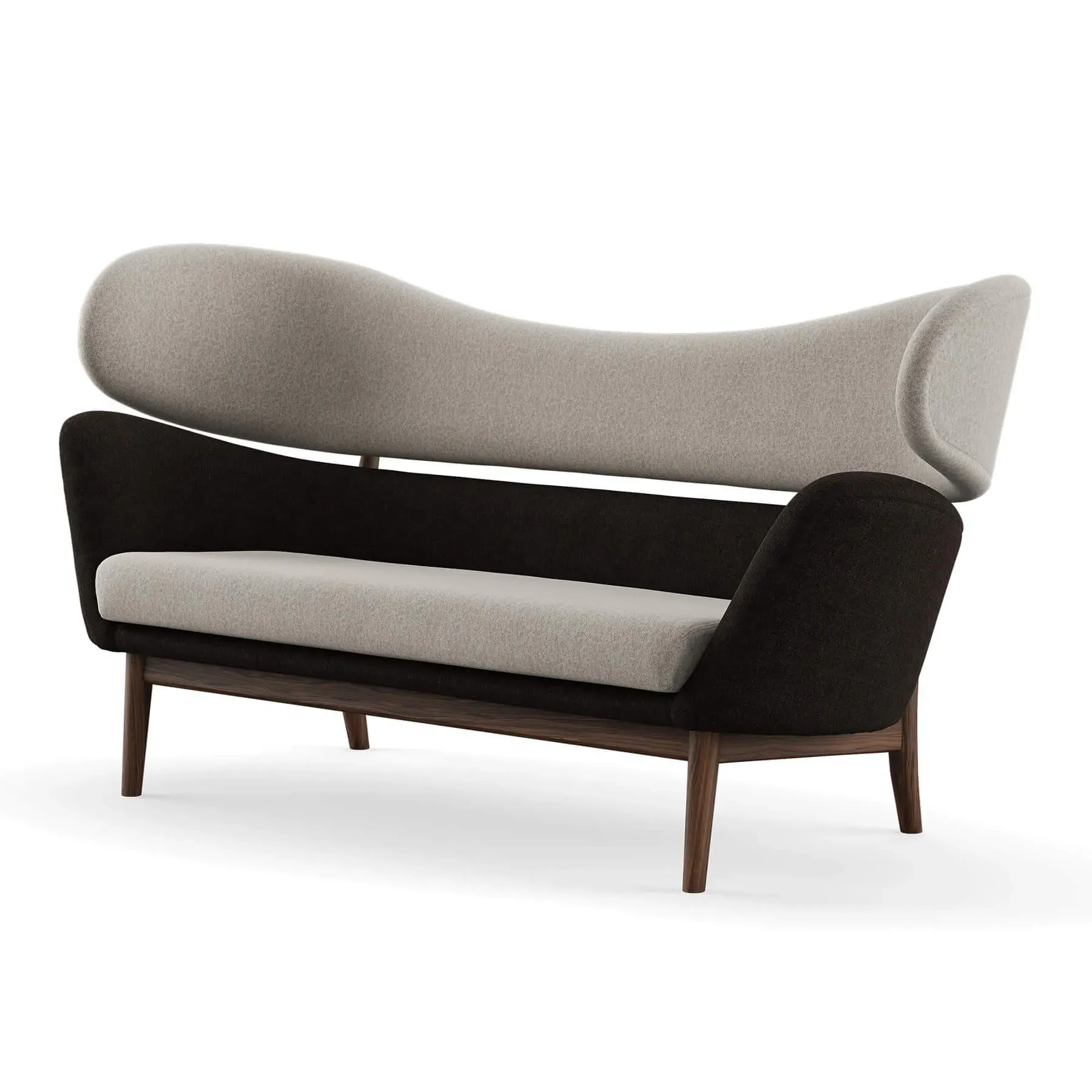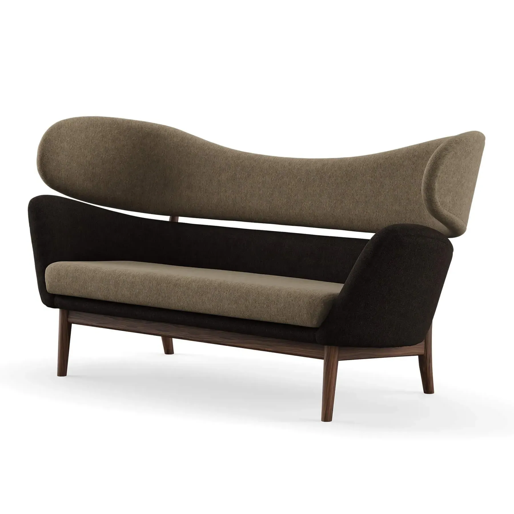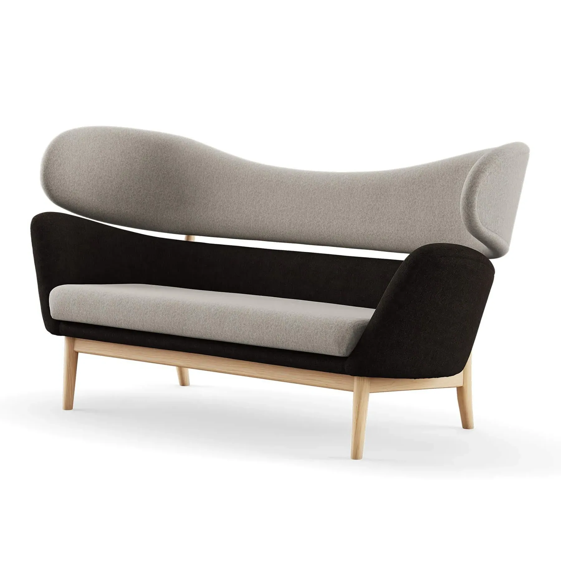 The Baker Sofa offers Danish modern design with its two-piece backrest and sculptural forms. Its hand-sewn upholstery features springs in the cushion for enhanced comfort and durability, while the sturdy wooden frame provides lasting support. The upholstered body rests upon an elegant oak construction that creates visual lightness, and the separated furniture elements add architectural interest to the design.
